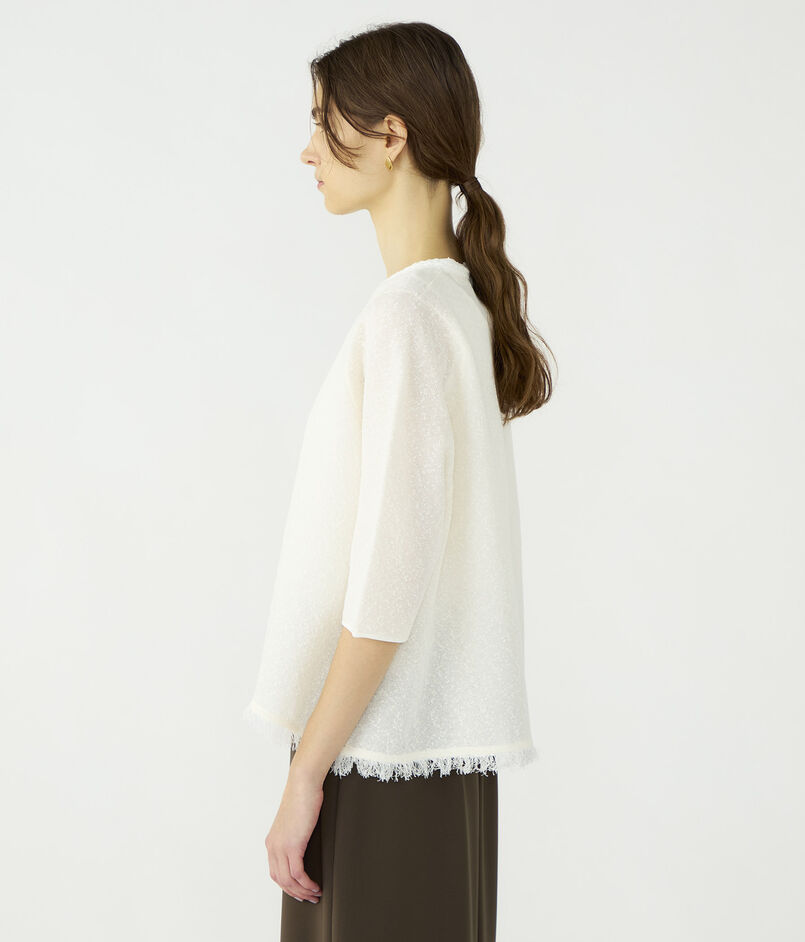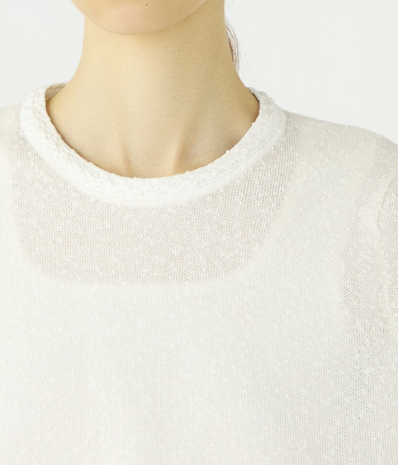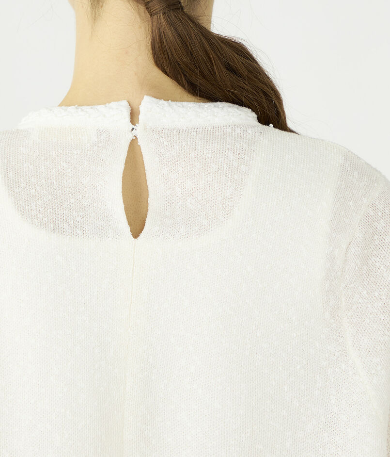 透明糸とノットヤーンを使用し特殊な編み方をすることで、奥行きを感じる独特な質感を生み出しています。