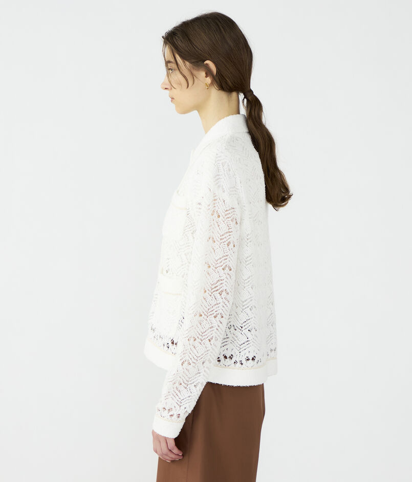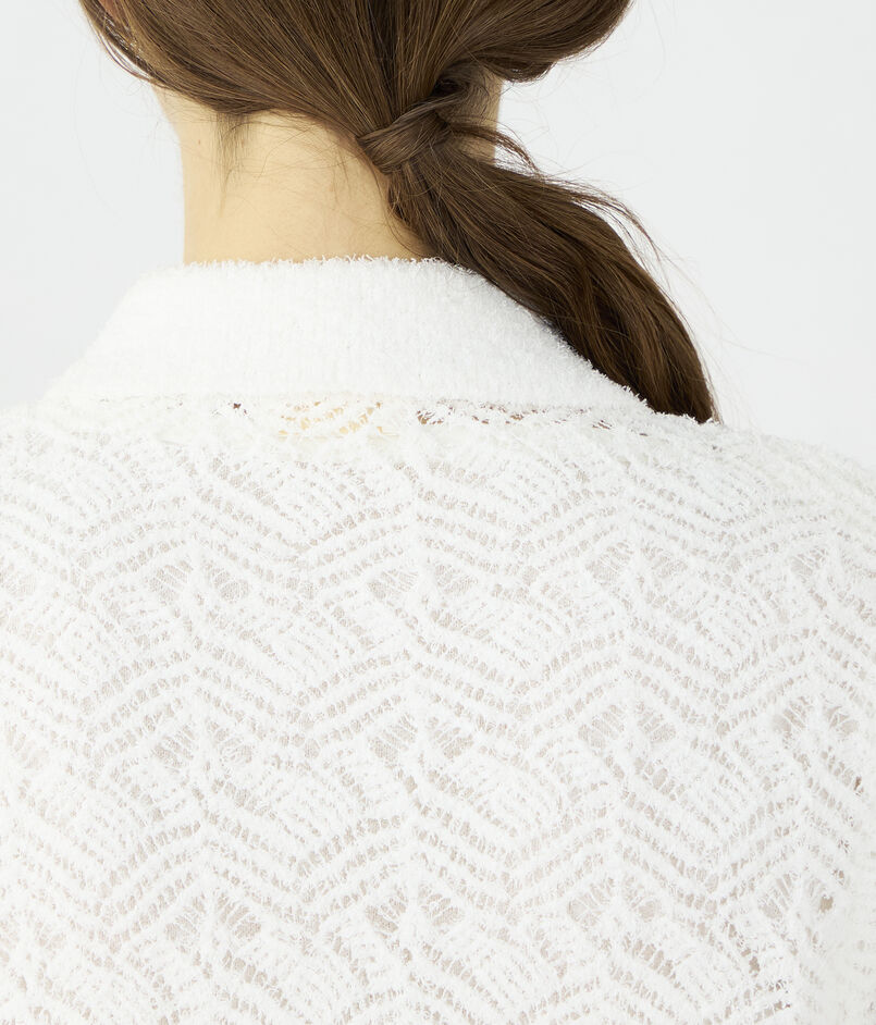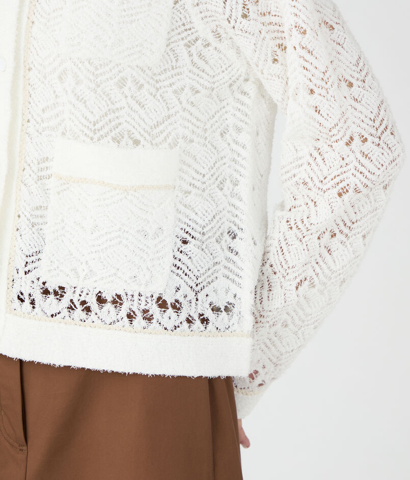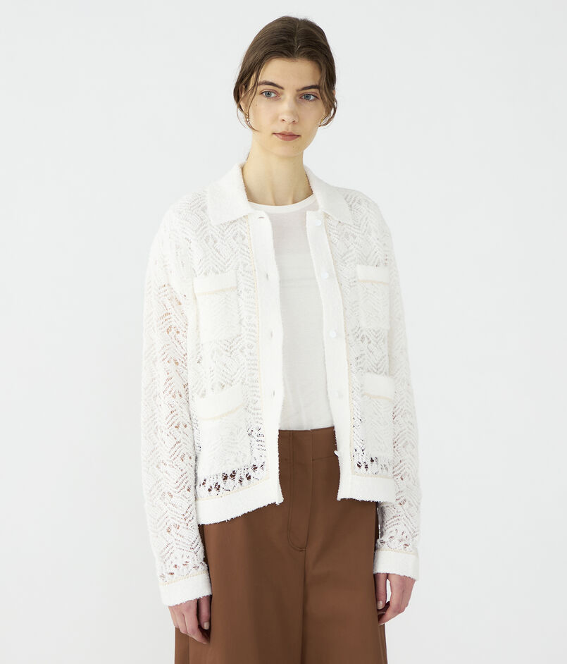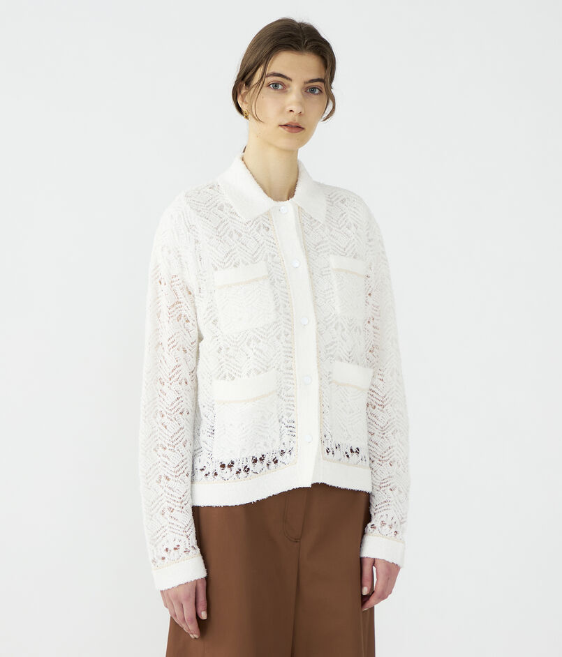 表情のあるのヒゲモール糸を透かし柄に編み上げた、軽やかで華やかな表情のニットカーディガン。