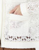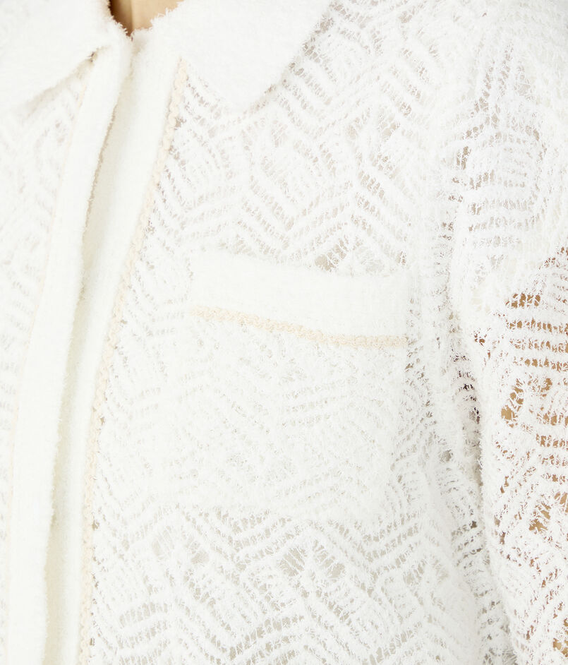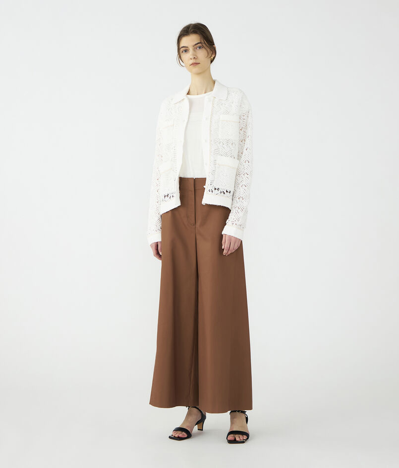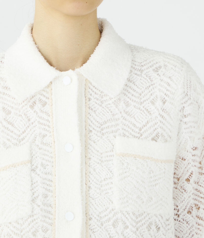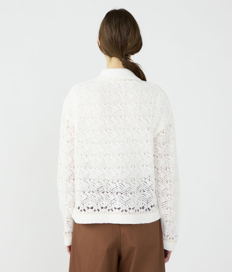 表情のあるのヒゲモール糸を透かし柄に編み上げた、軽やかで華やかな表情のニットカーディガン。