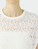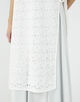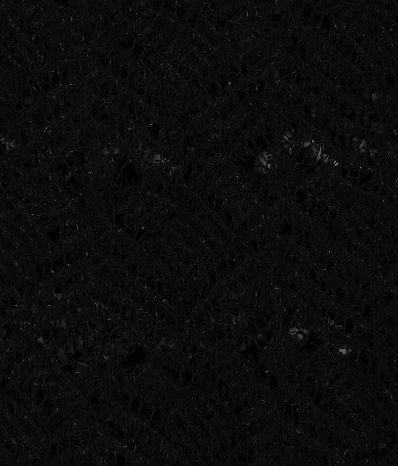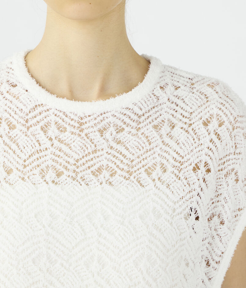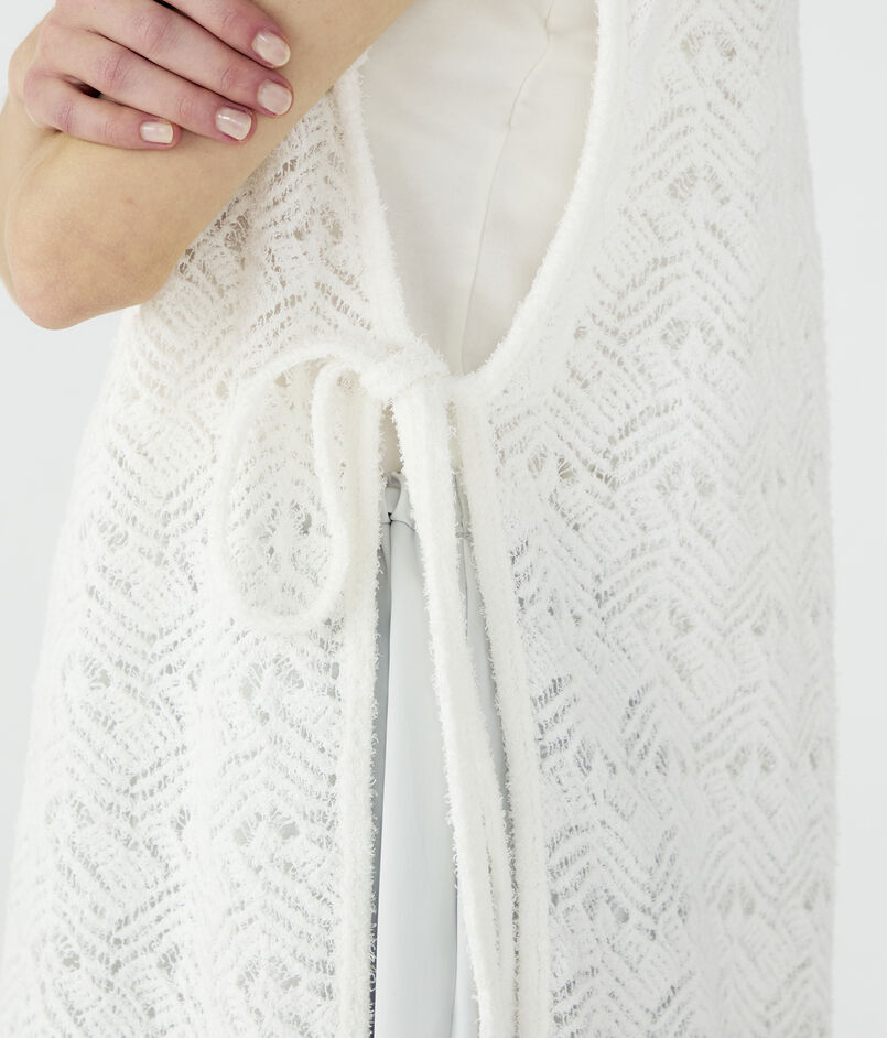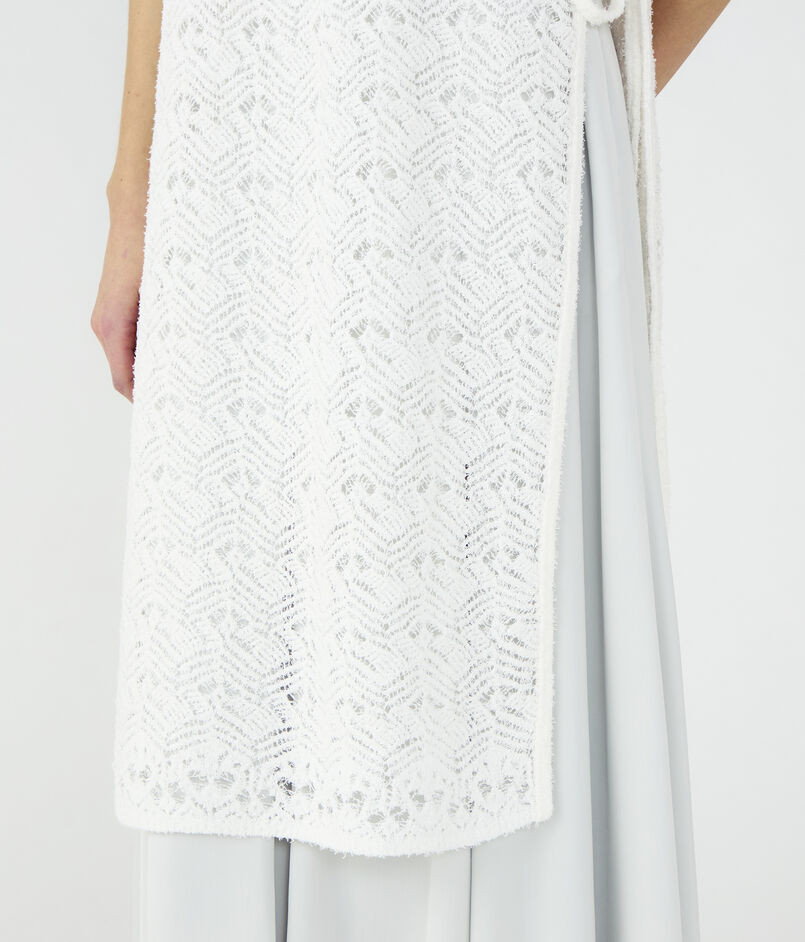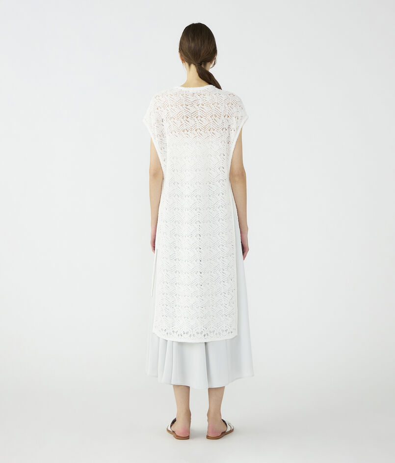 表情のあるのヒゲモール糸を透かし柄に編み上げた、軽やかで華やかな表情のロングニットベスト。