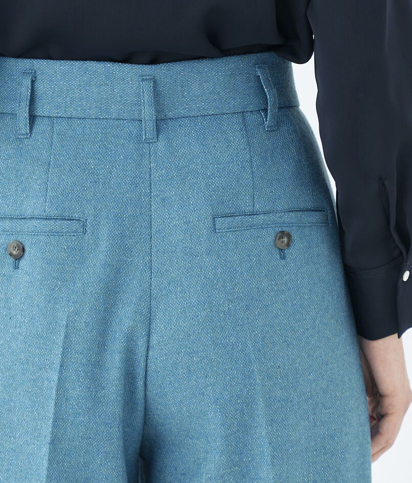 フロントに施した深めのタックでボリュームを持たせつつも、ハイウエスト位置できゅっと絞ることでメリハリをつけ、女性らしさを感じるバランスに。