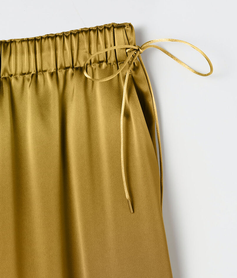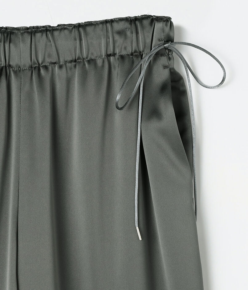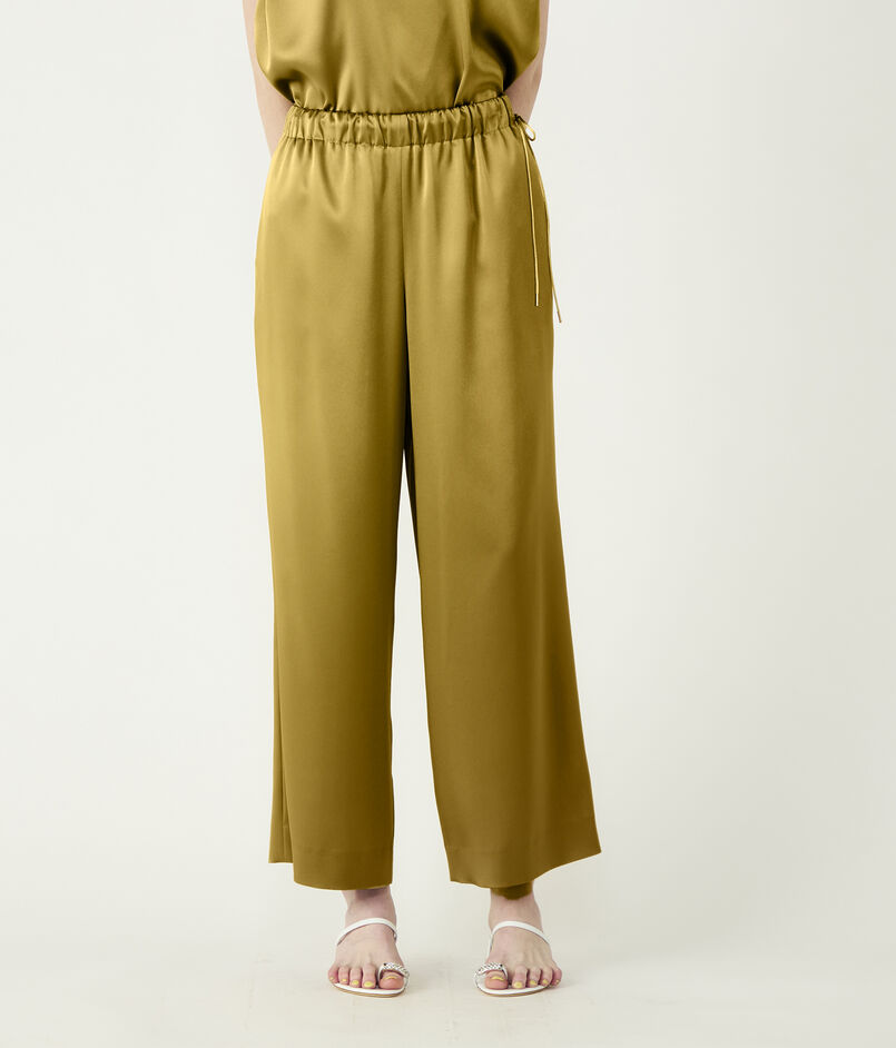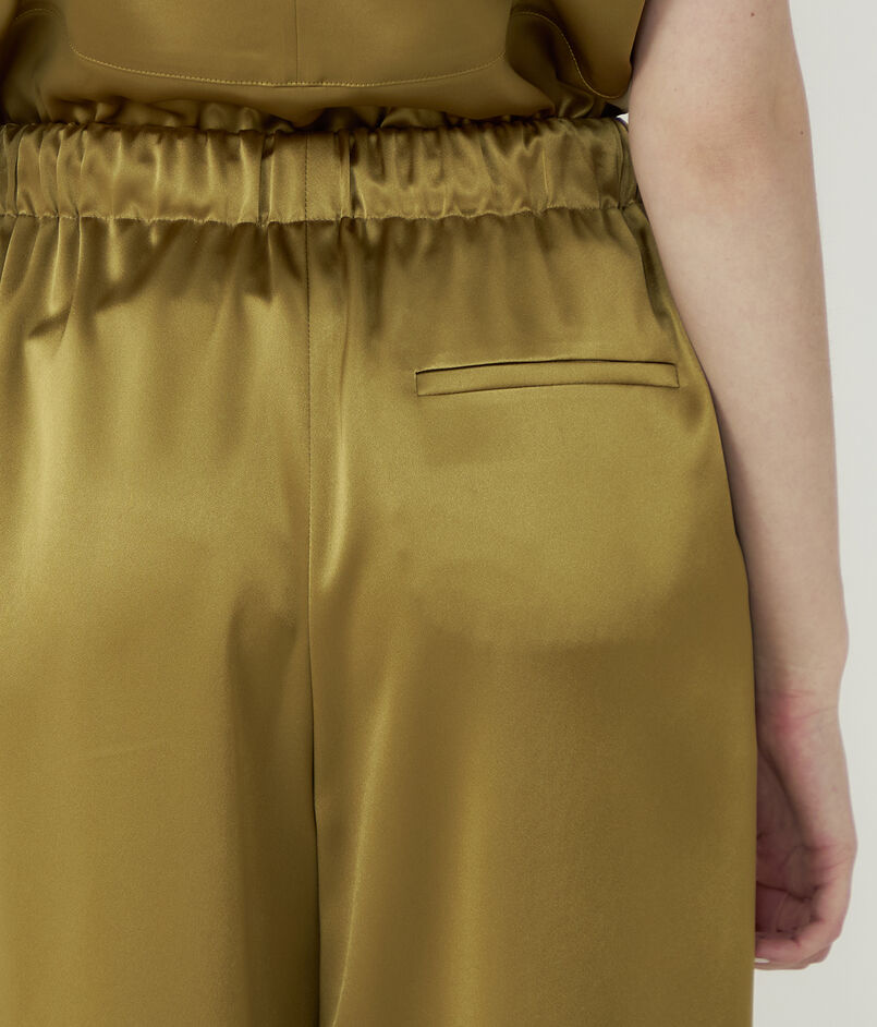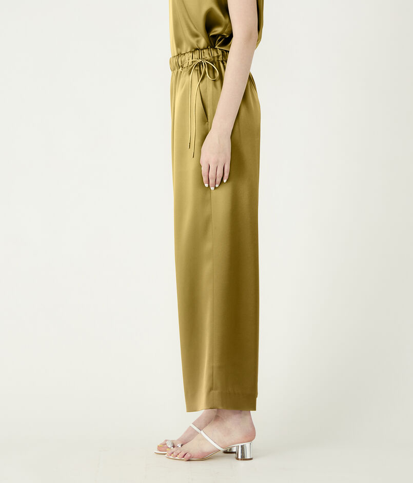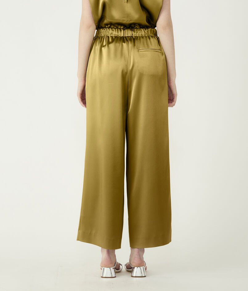 しなやかな落ち感と上品な光沢が特徴のサテン素地のパンツ。