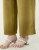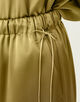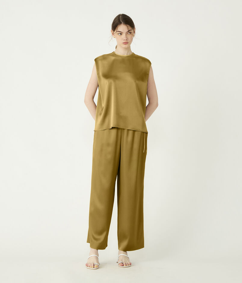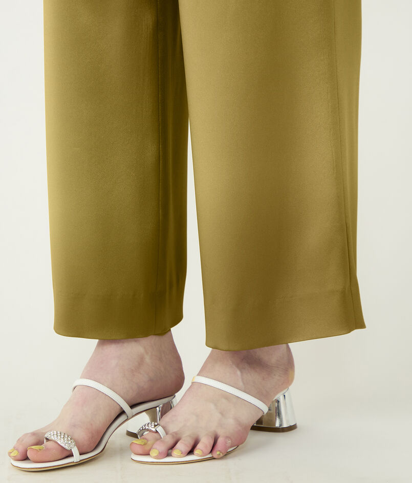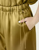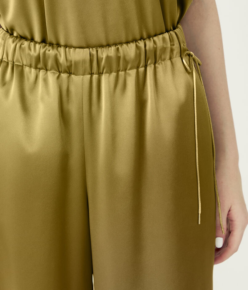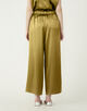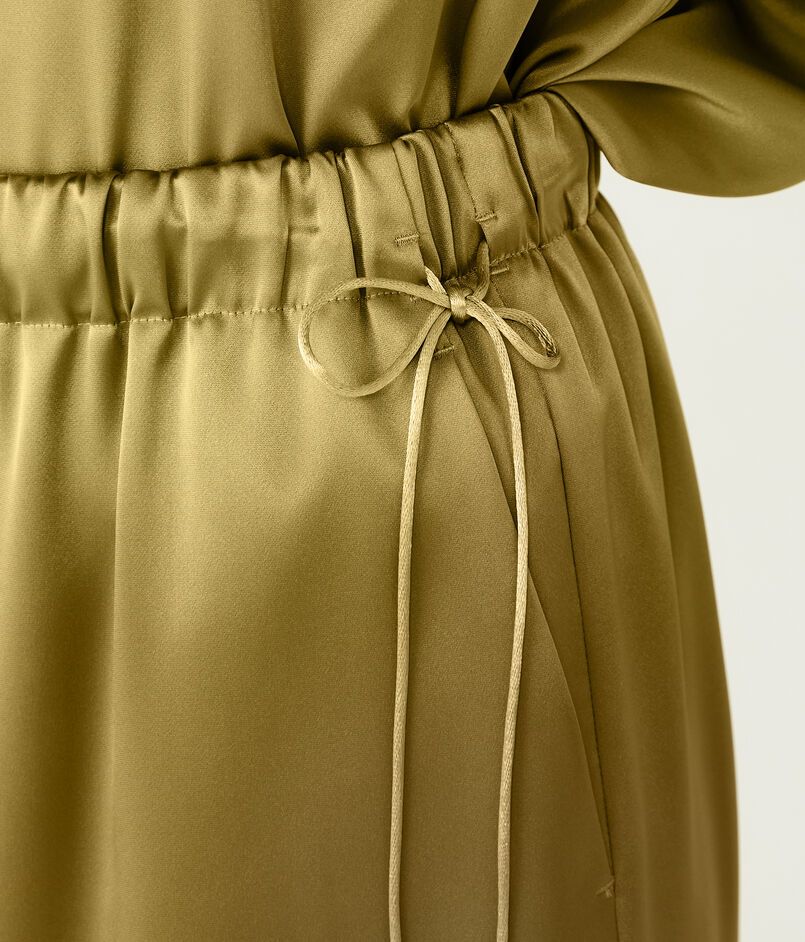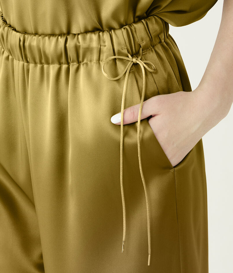 しなやかな落ち感と上品な光沢が特徴のサテン素地のパンツ。