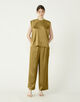 パンツはヒップ下から緩やかに広がるワイドシルエットにウエストギャザーのディテールでエフォートレスなムードが漂う一着。
