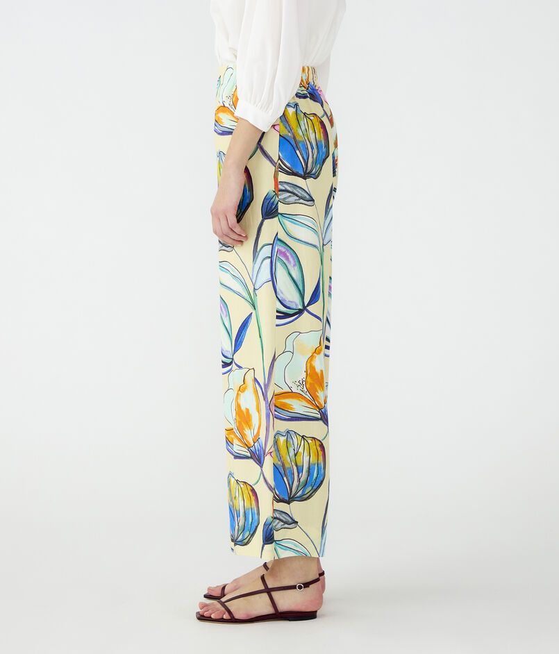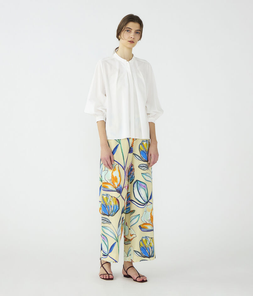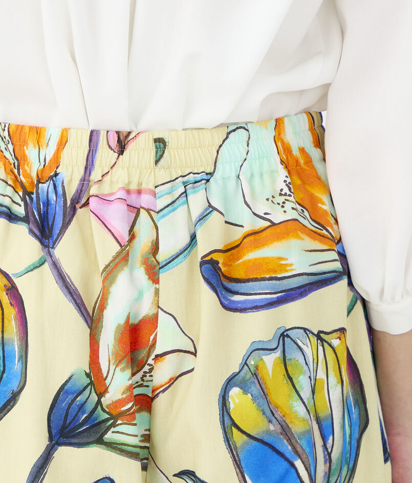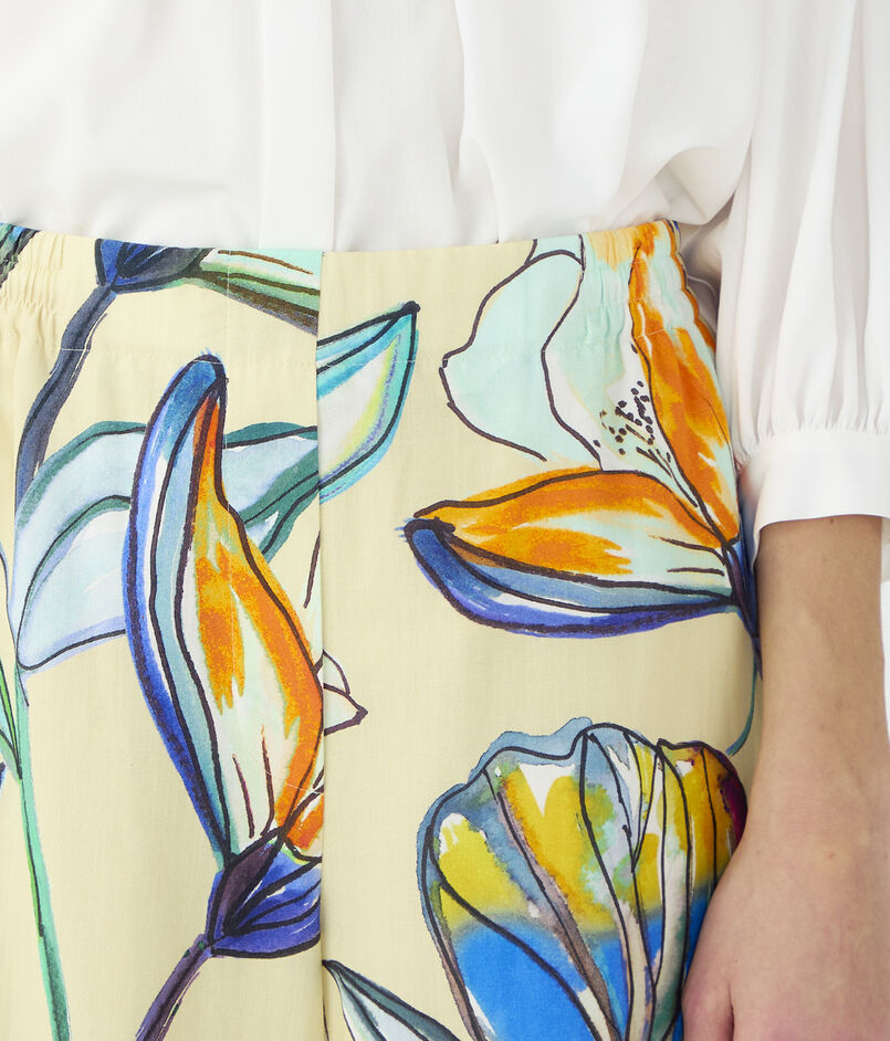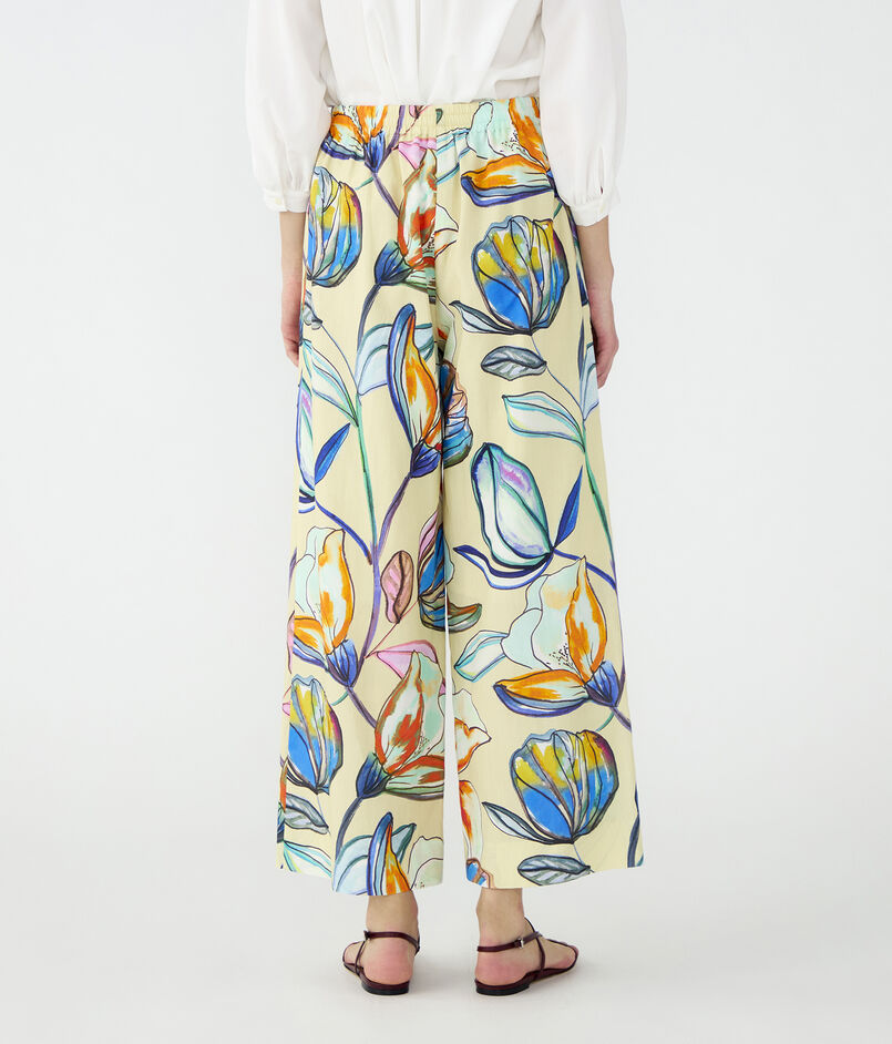 どこか温かみを感じる、柔らかで鮮やかなカラー使いで表現したボタニカル柄が魅力的なパンツ。