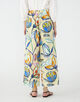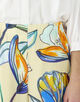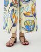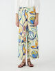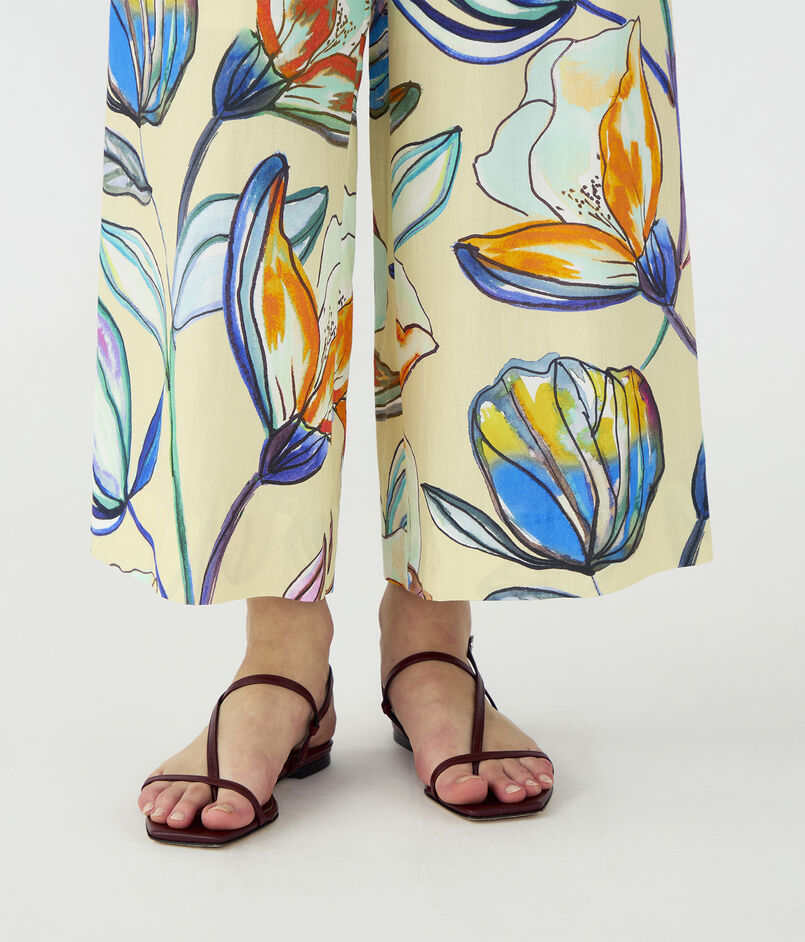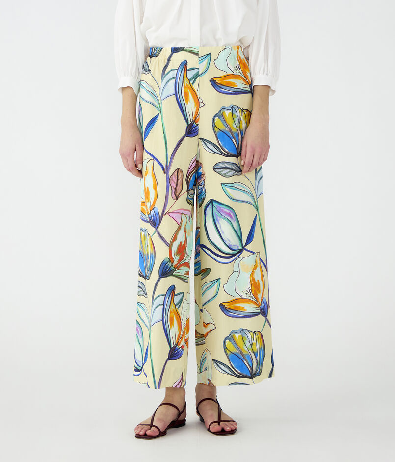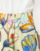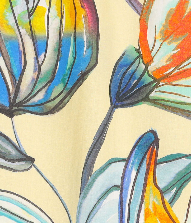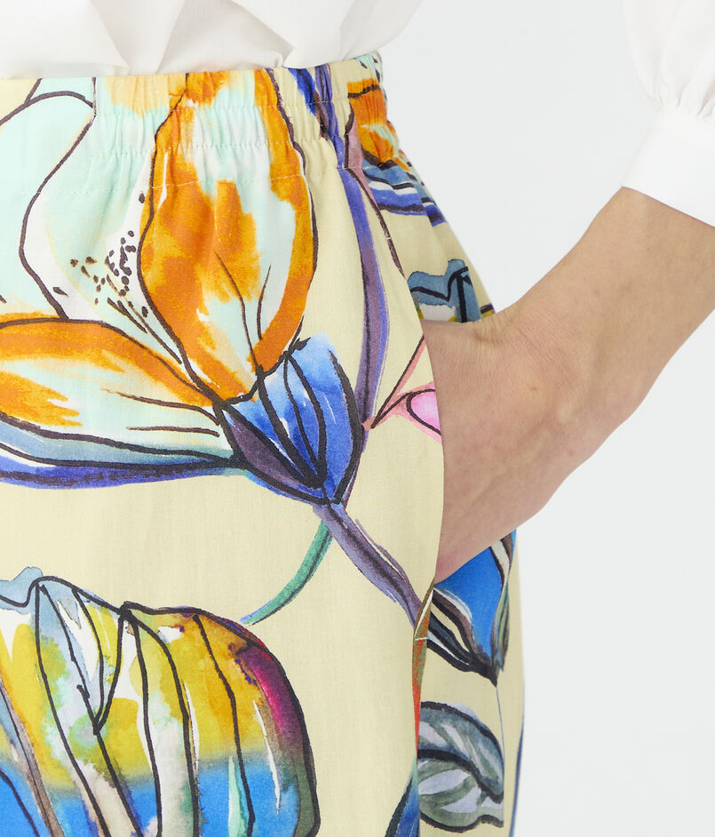 どこか温かみを感じる、柔らかで鮮やかなカラー使いで表現したボタニカル柄が魅力的なパンツ。