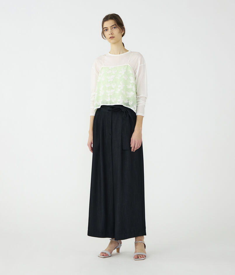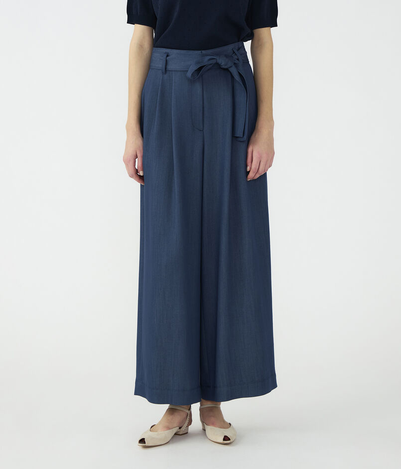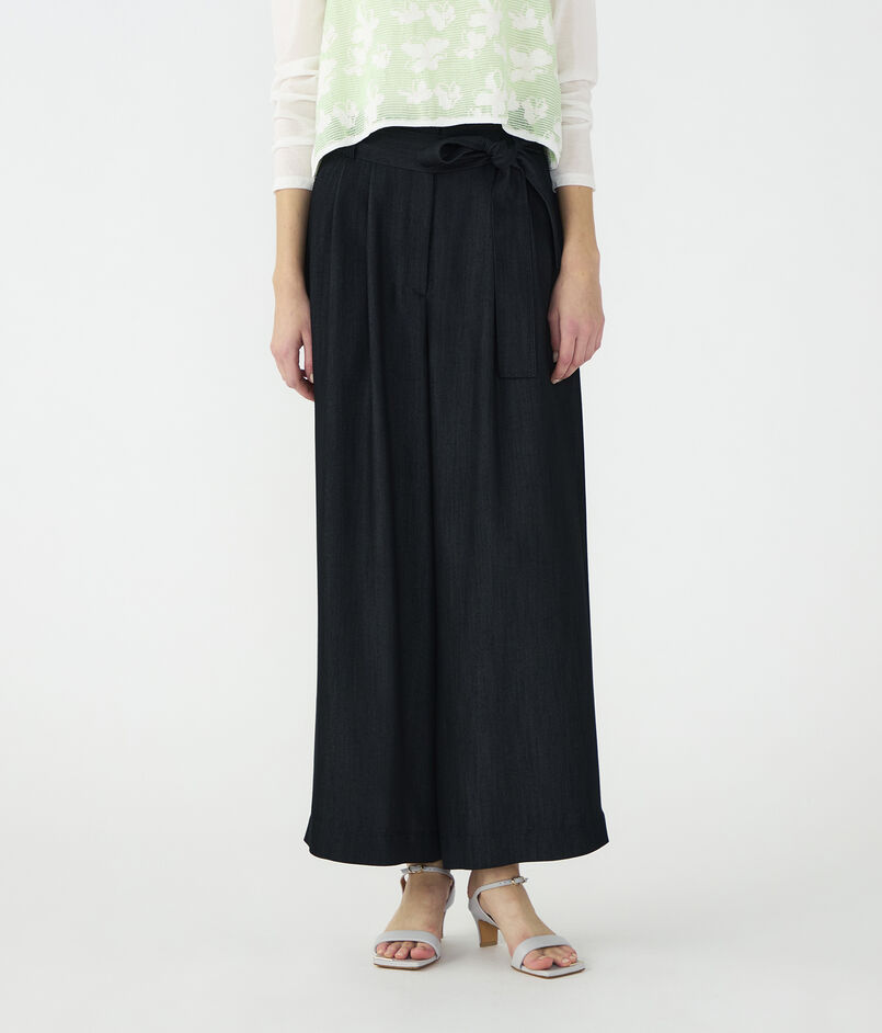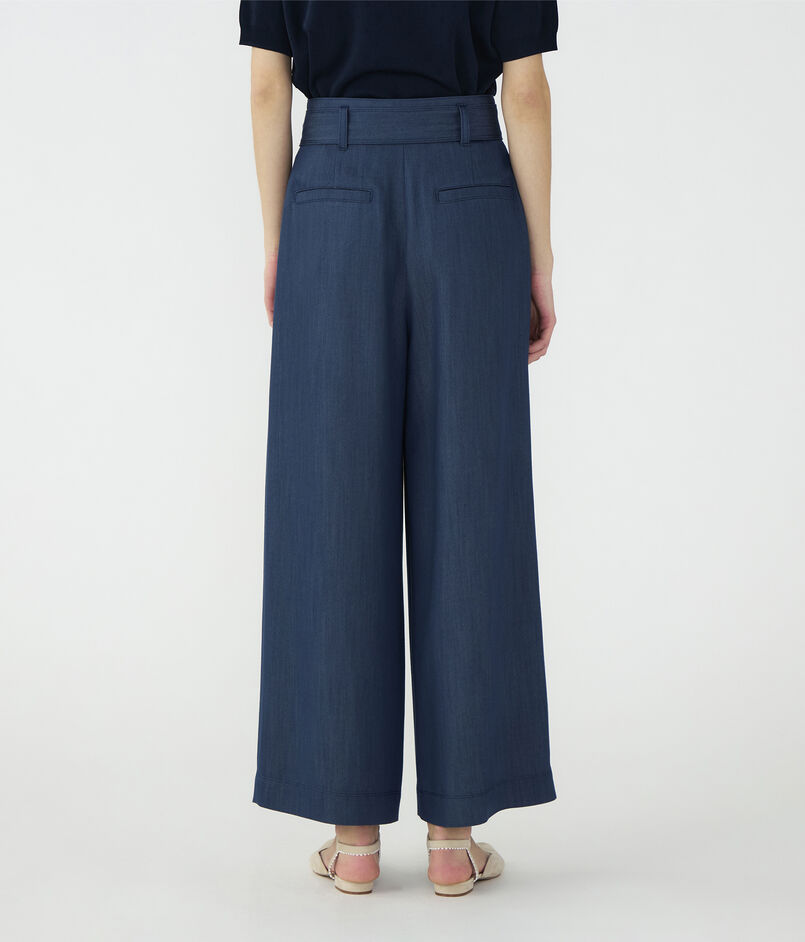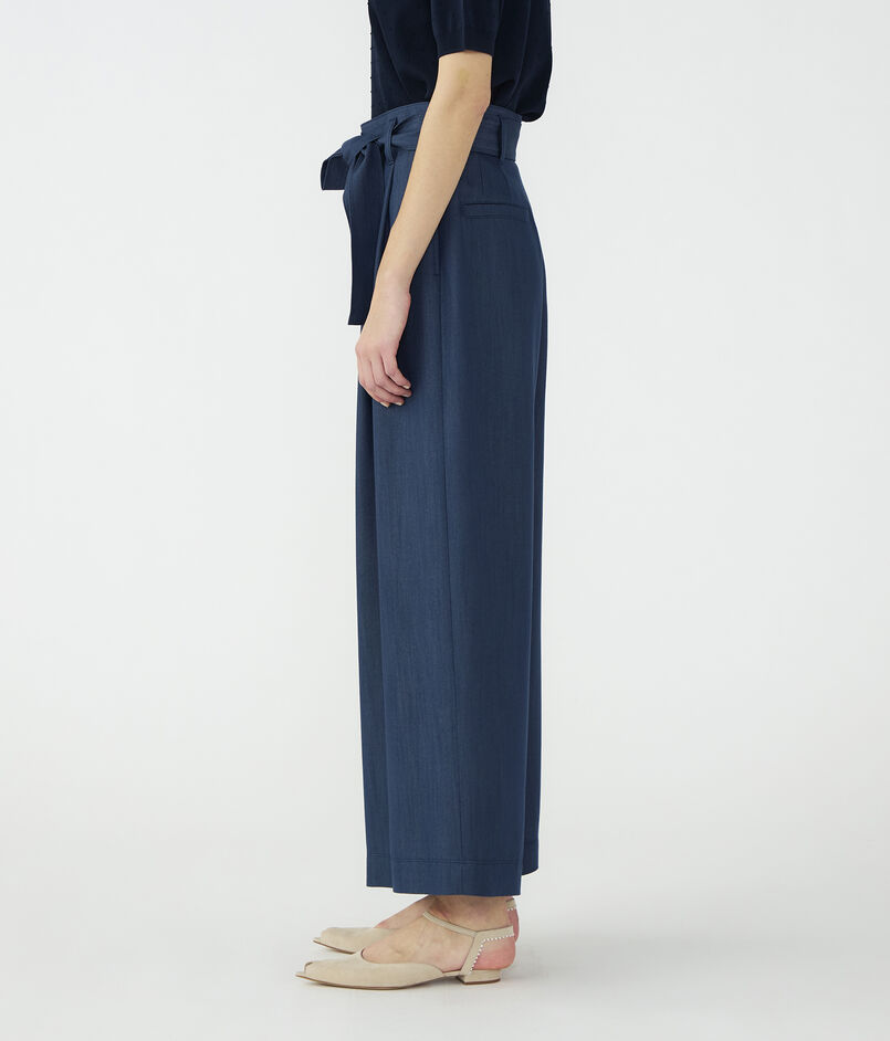 キュプラの落ち感を活かした、上品なツヤ感のあるデニムライクな素材を使用したパンツ。