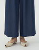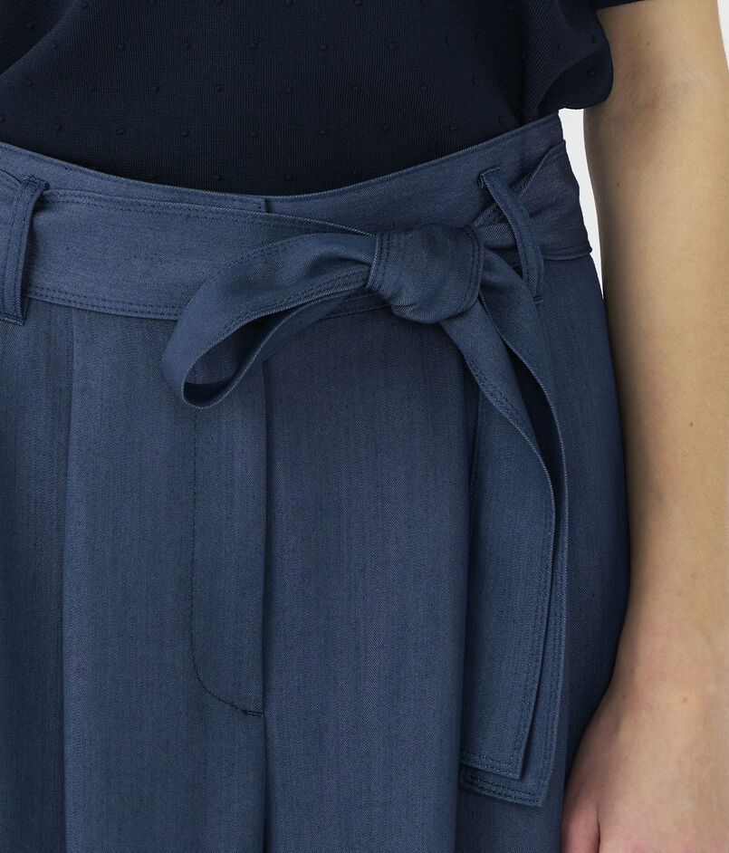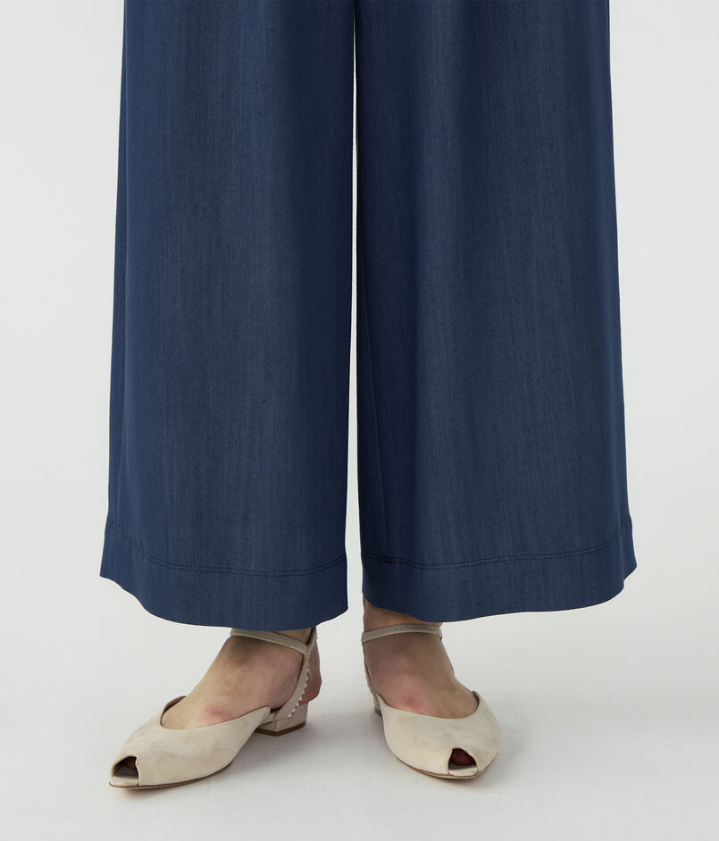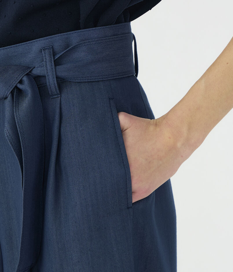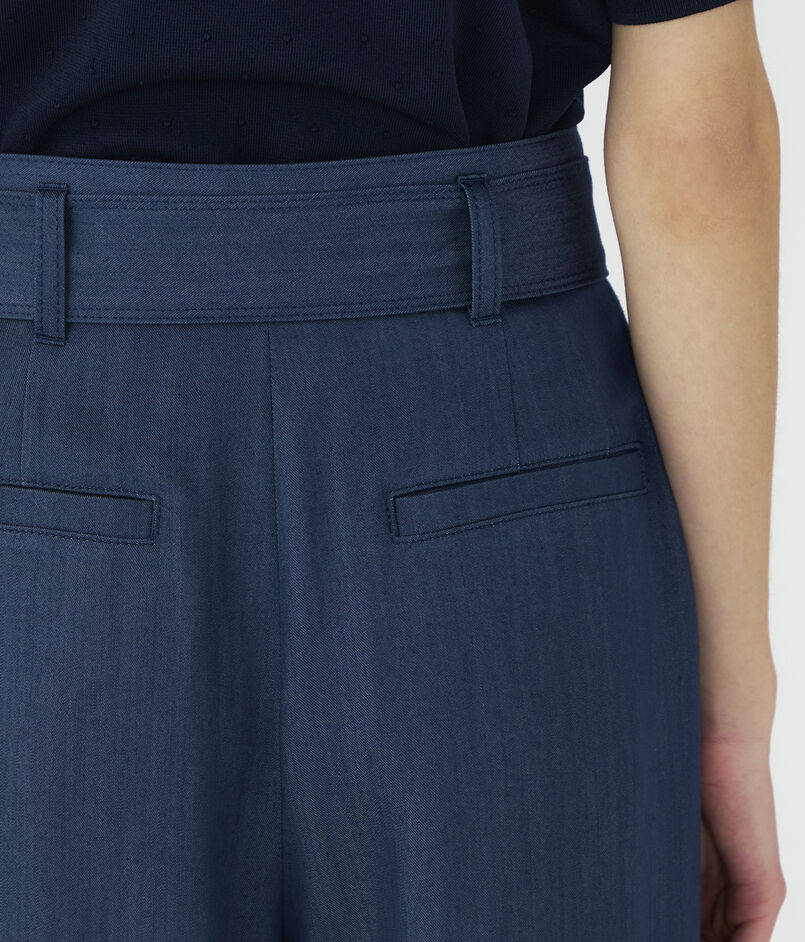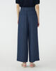 キュプラの落ち感を活かした、上品なツヤ感のあるデニムライクな素材を使用したパンツ。