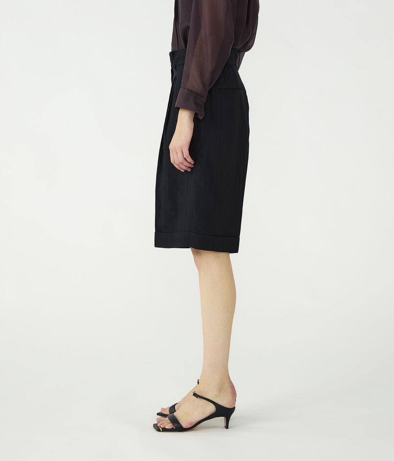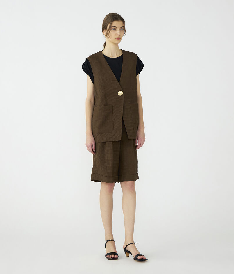 お手持ちのトップスとの単品コーディネートはもちろん、同素材のジレ(商品番号:11-07-62-07331)を合わせたセットアップスタイルもおすすめ。