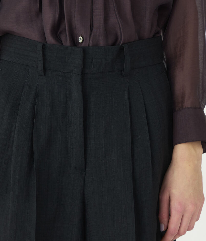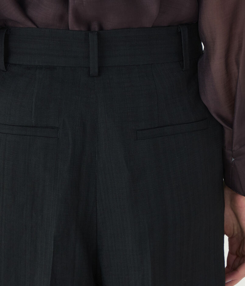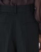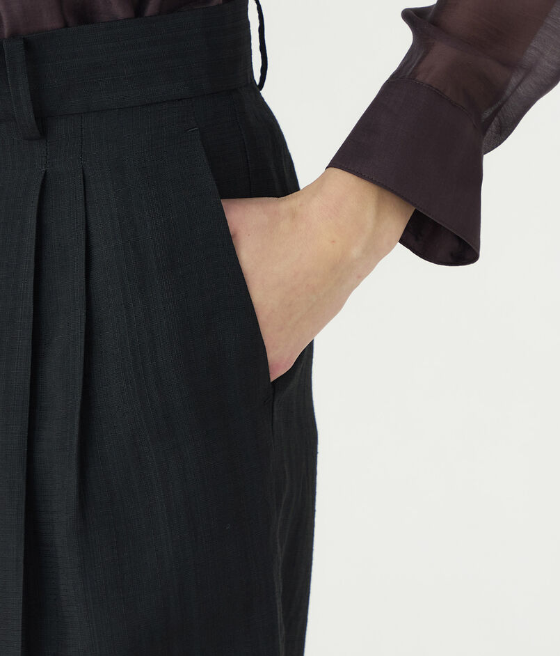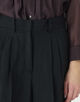 シャリ味のある特殊な強撚レーヨンを使用して織り上げた、上品なツヤとハリのあるブッチャー素材を使用したパンツ。