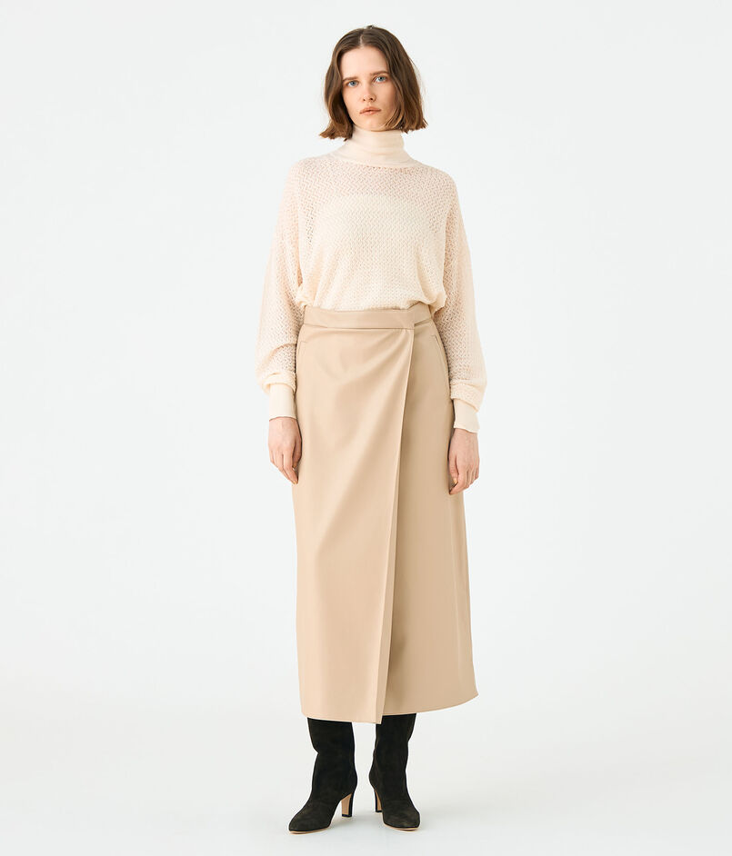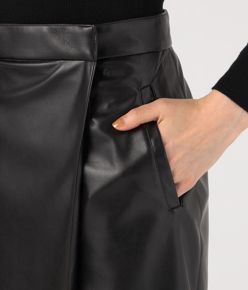 トレンドを取り入れたミニマルで美しいフォルムのラップ風スカート。