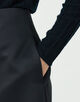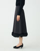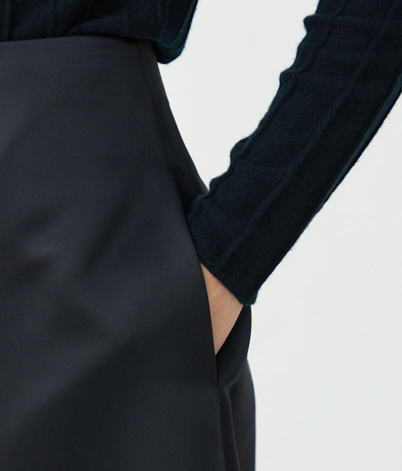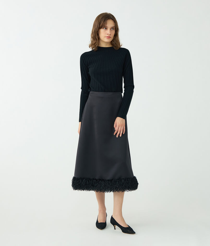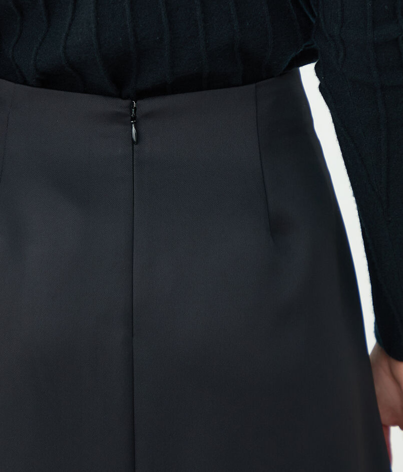 スカートは膝の隠れるミディ丈に緩やかに広がるトラペーズラインで、クラシカルかつエレガントな雰囲気の一着。