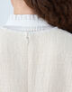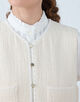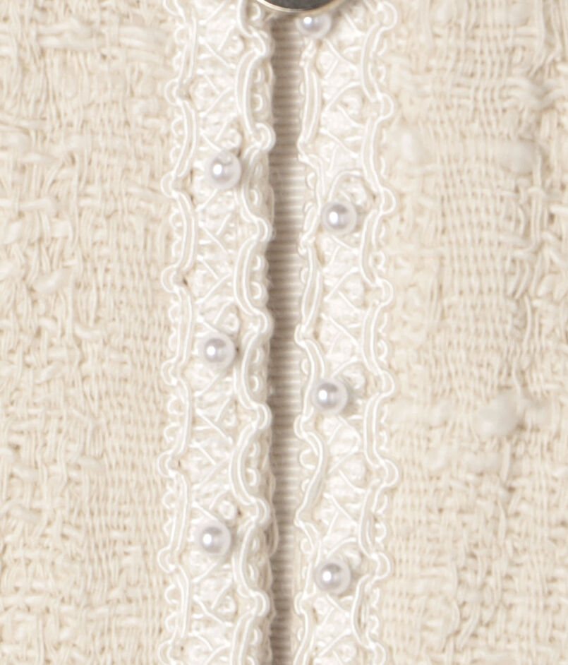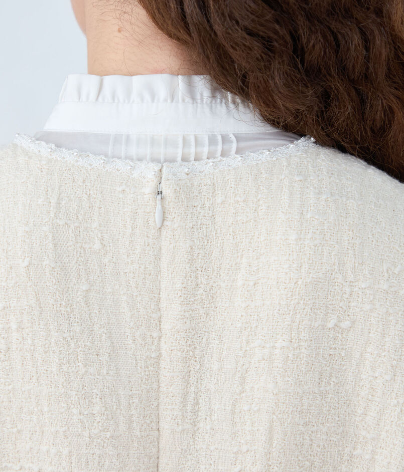 低めの位置に配したポケットとロングキーネックがデザインポイントで、胸元に配したパール付きのブレードで華やかさをプラスしています。