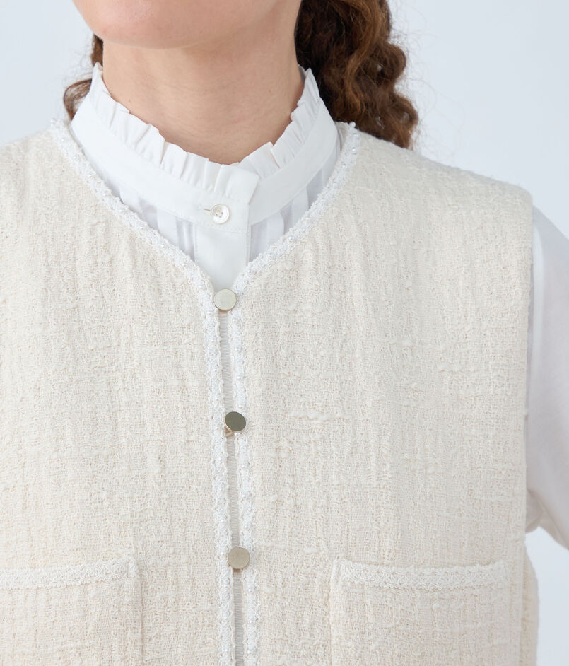 ハイネックニットやブラウスなどさまざまなトップスとのレイヤードをお楽しみいただけ、さらりと纏うだけで上品なスタイリングが決まるアイテムです。