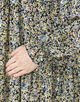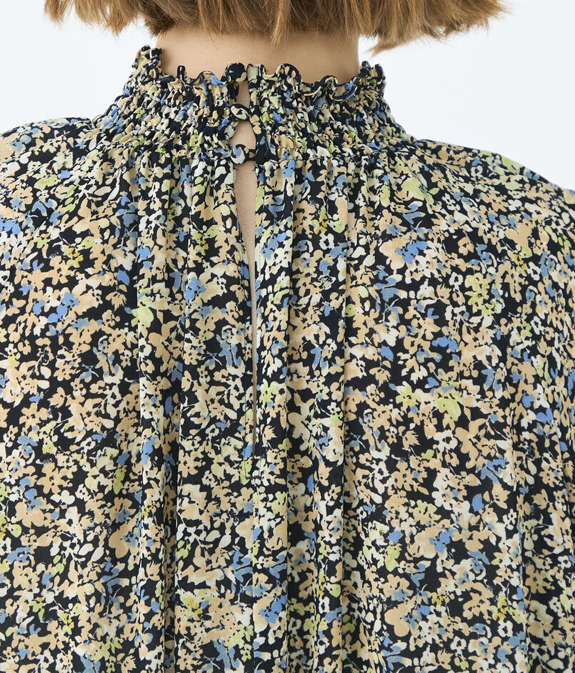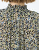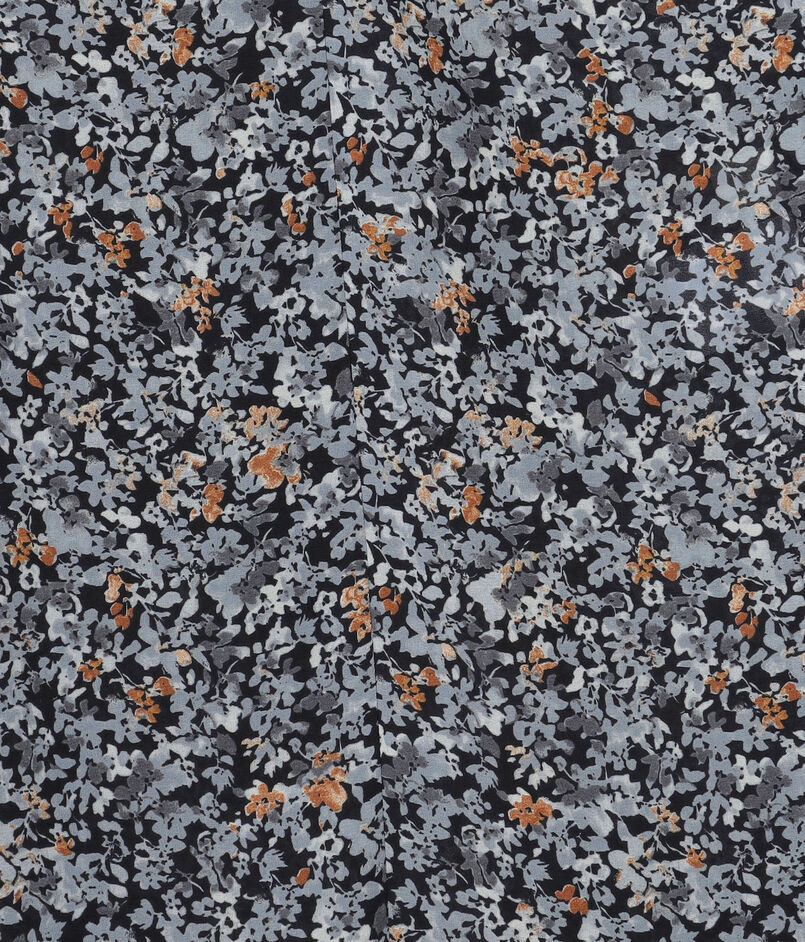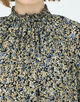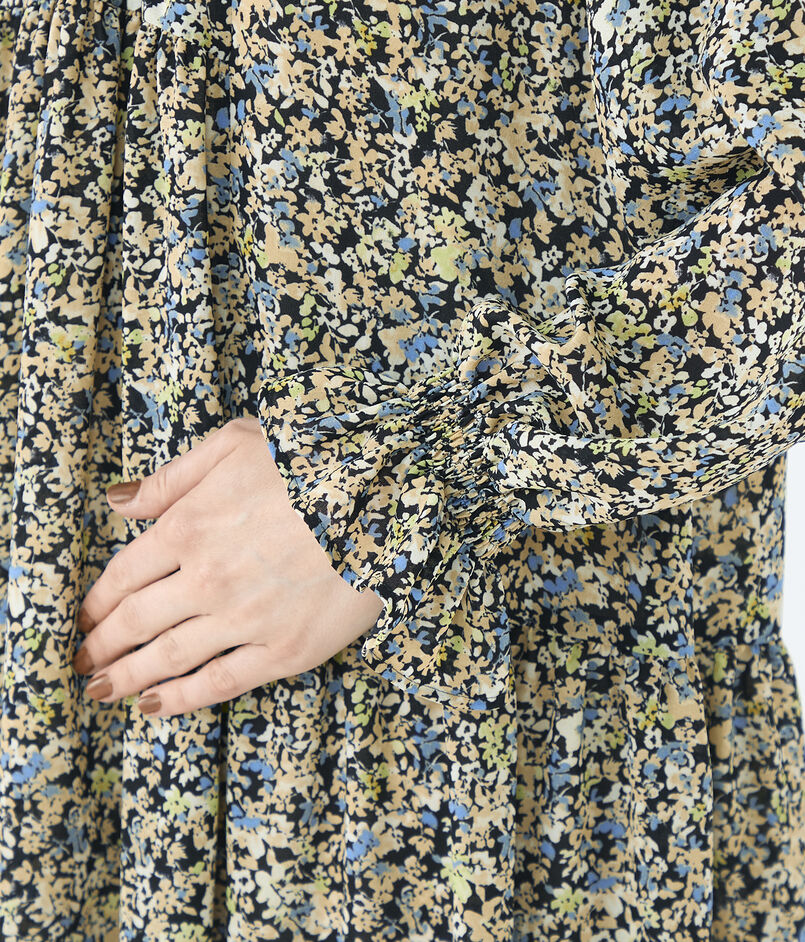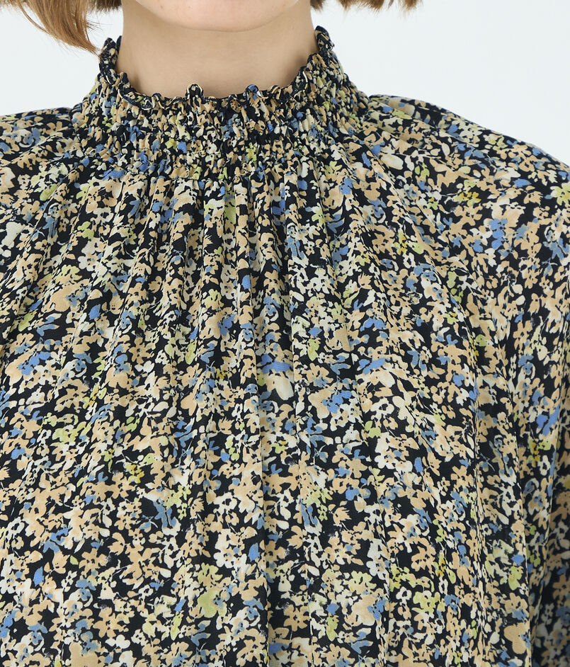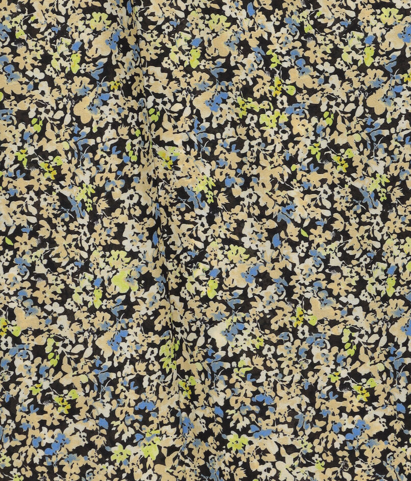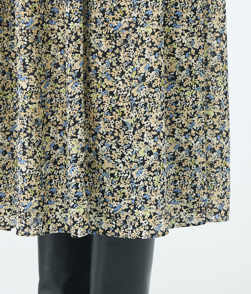 パウダリーで膨らみのあるジョーゼット素材に抜染プリントを施すことで、細かな柄と色の重なりを美しく表現しています。