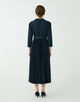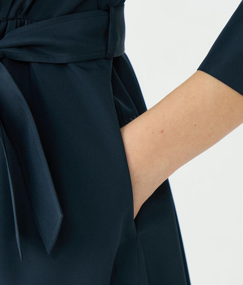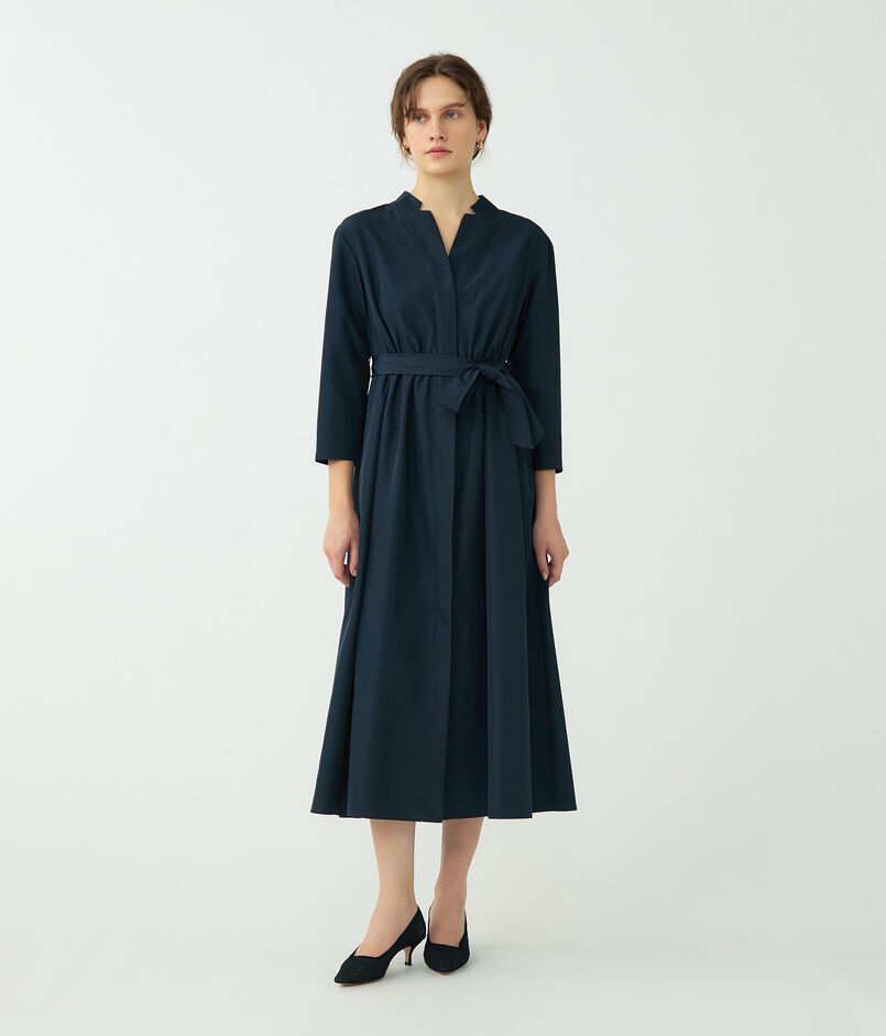 しっとりとした光沢とほど良いハリのあるポリエステル素材を使用したワンピース。