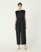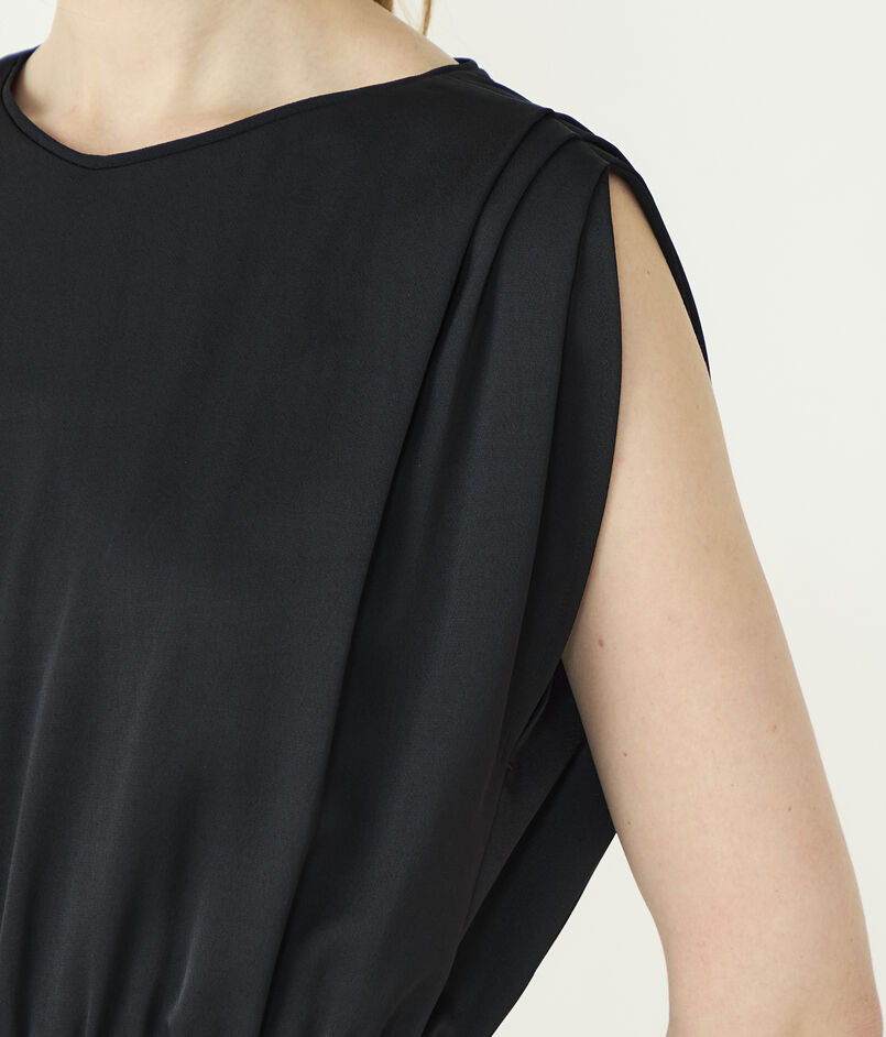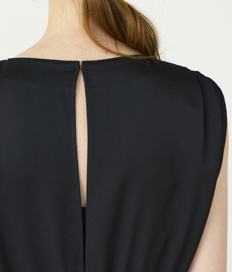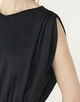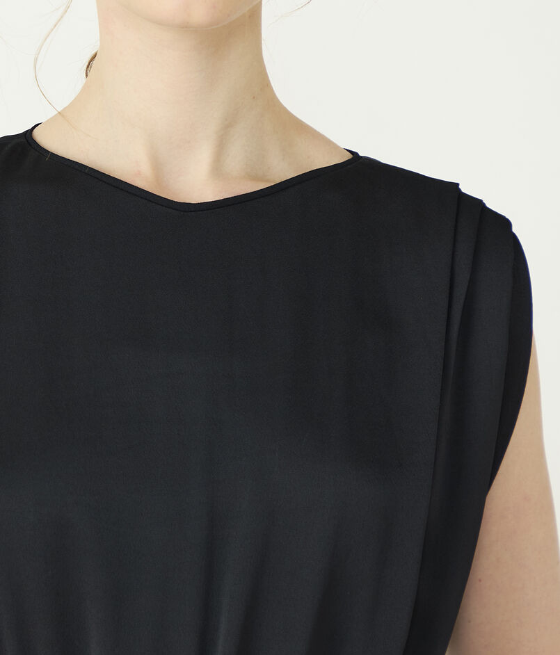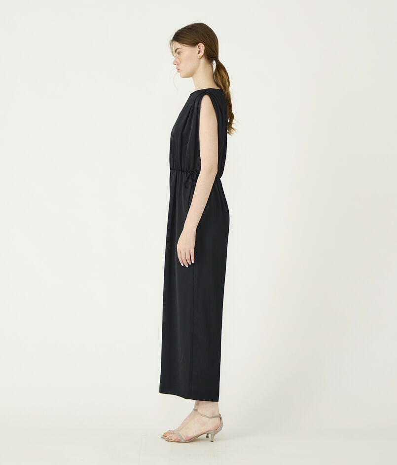 肩のタックとウエストのブラウジングがデザインのポイントで、ほど良いリラックス感とエレガントな雰囲気のバランスが絶妙な一着。