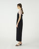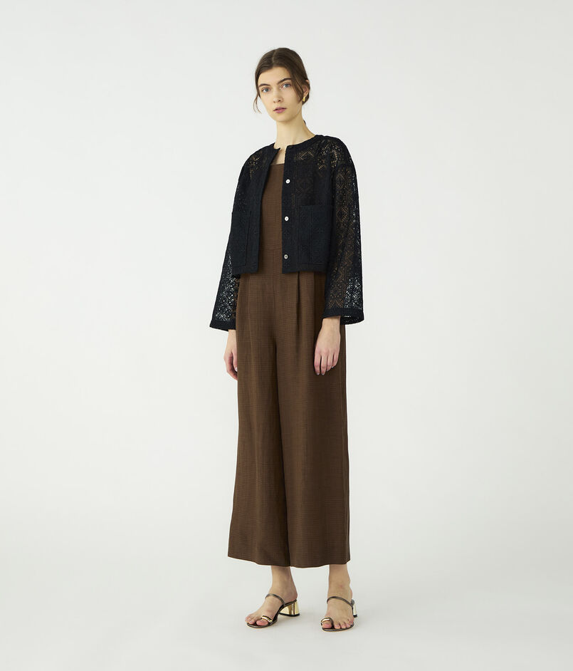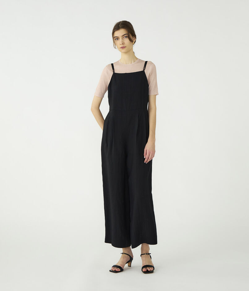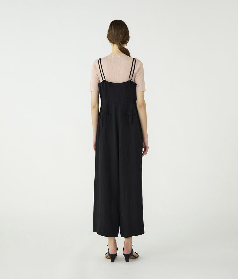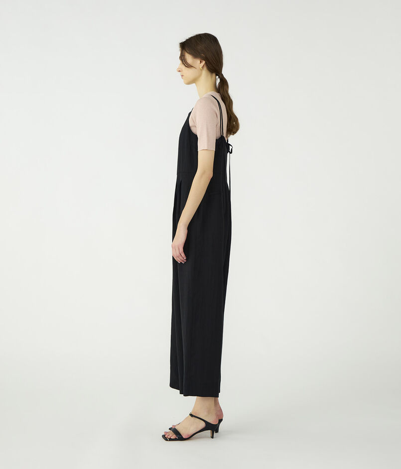 シャリ味のある特殊な強撚レーヨンを使用して織り上げた、上品なツヤとハリのあるブッチャー素材を使用したオールインワン。
