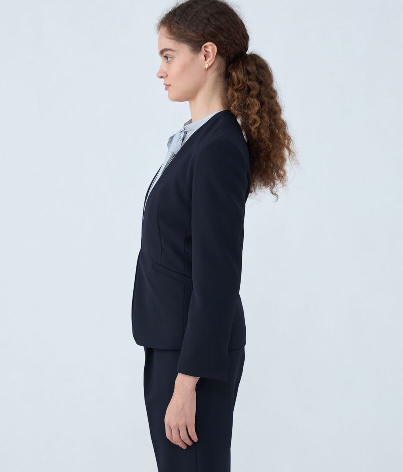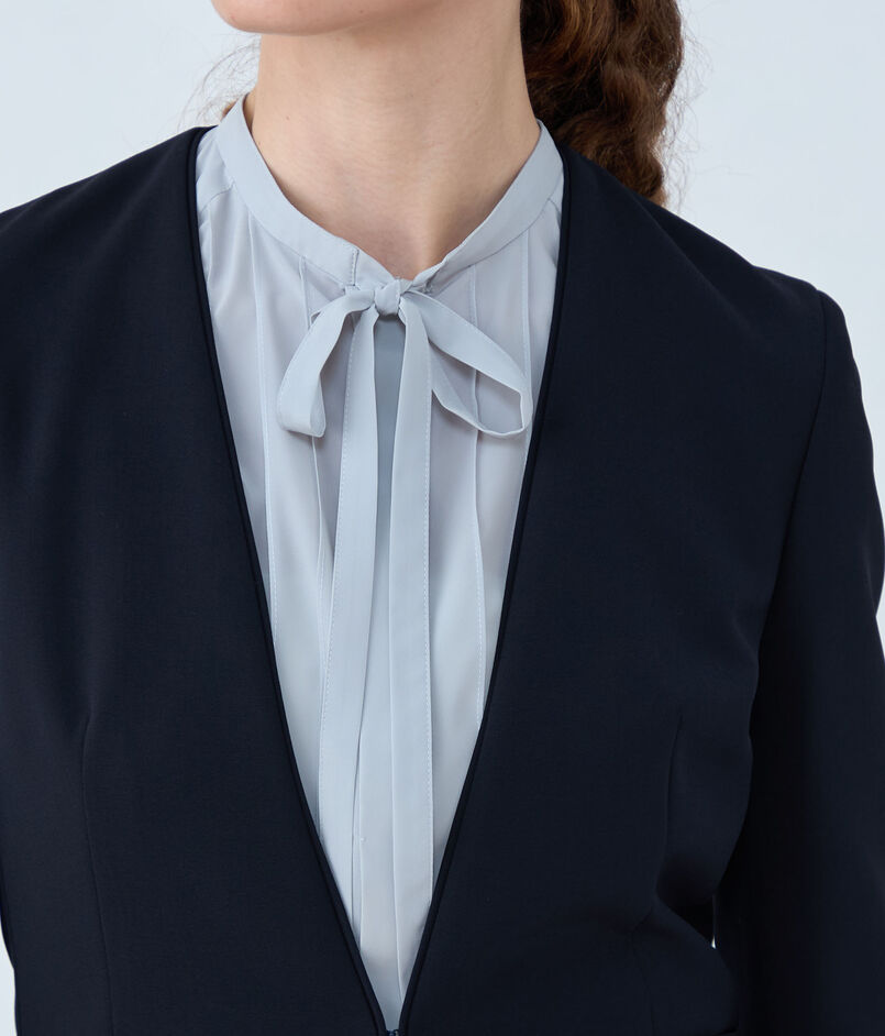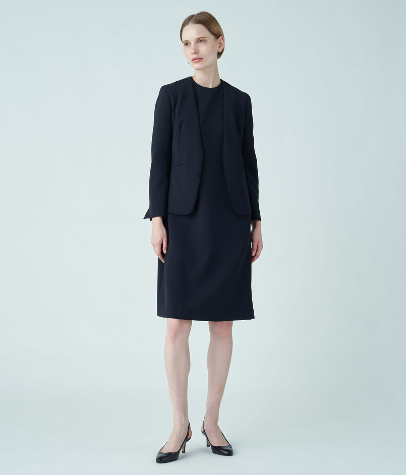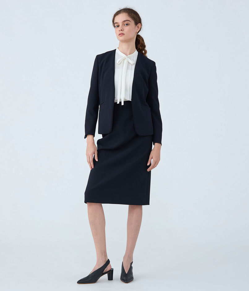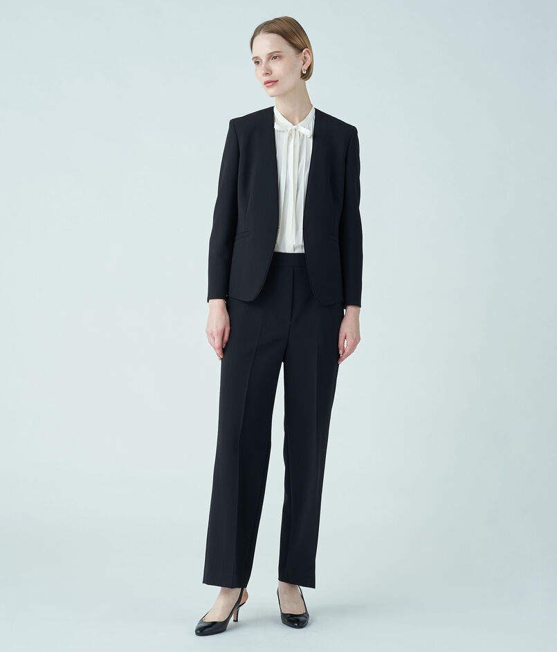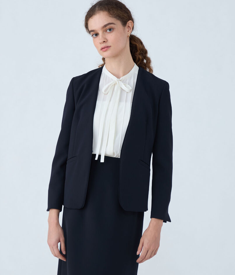 ノーカラージャケットはフロントのVあきがシャープな雰囲気ながら、コンパクトなフォルムとほど良くシェイプされたウエストラインで女性らしいバランスに仕上げました。