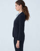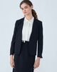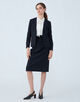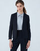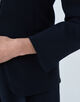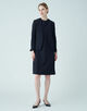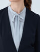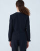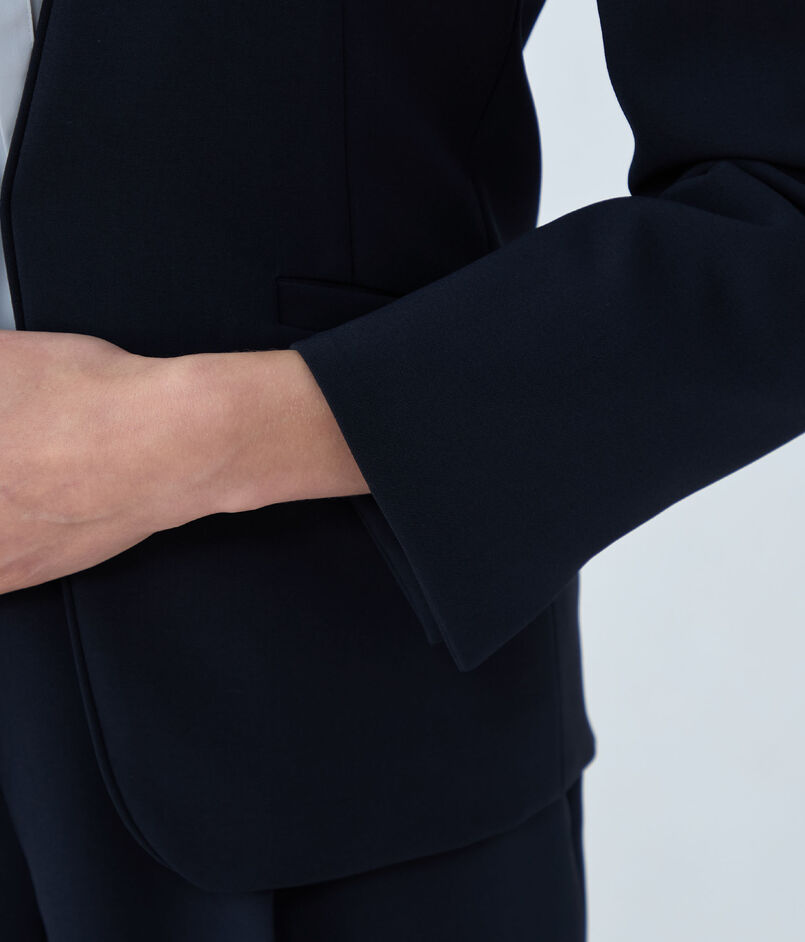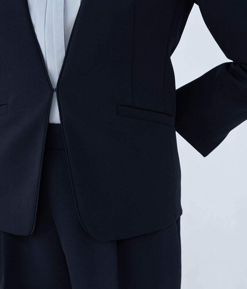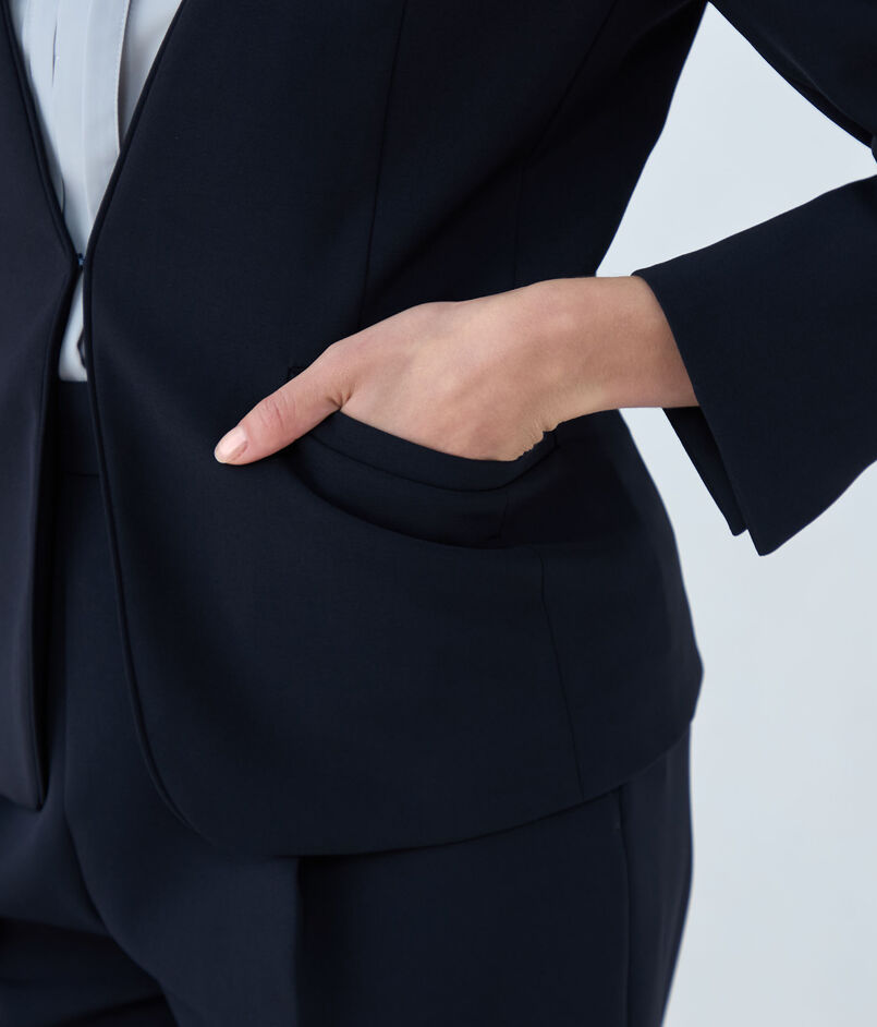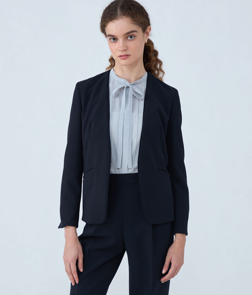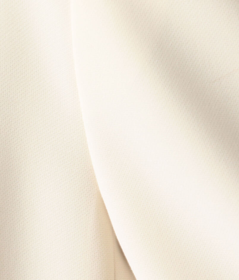 ノーカラージャケットはフロントのVあきがシャープな雰囲気ながら、コンパクトなフォルムとほど良くシェイプされたウエストラインで女性らしいバランスに仕上げました。