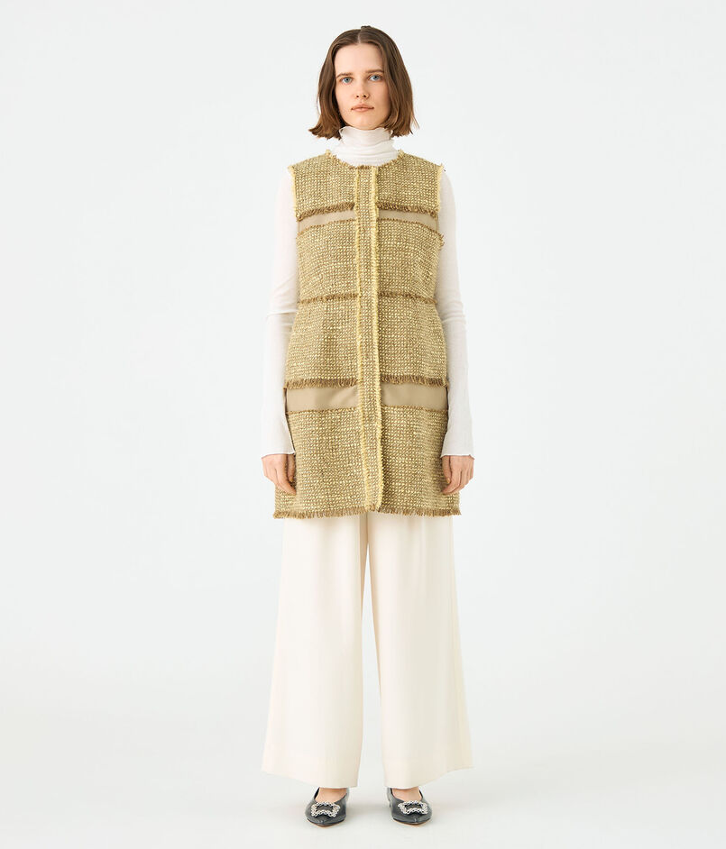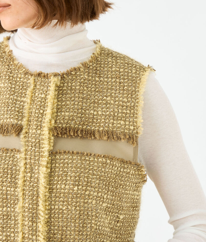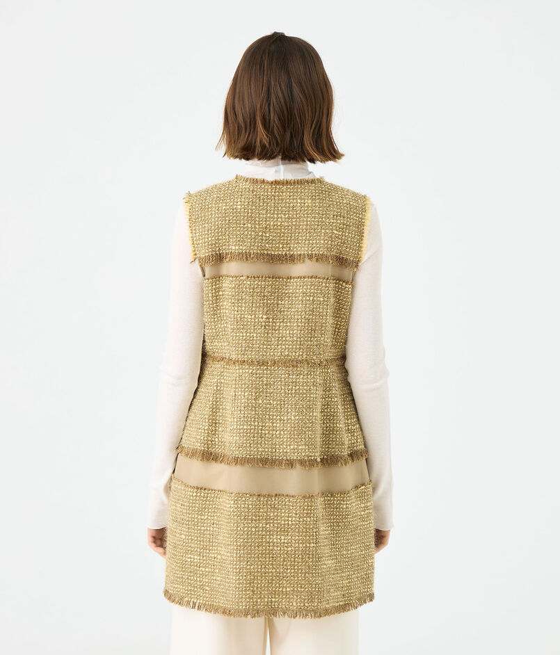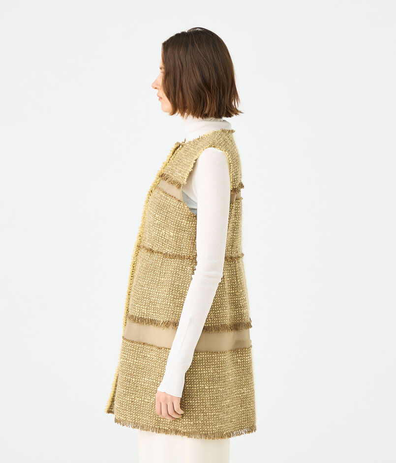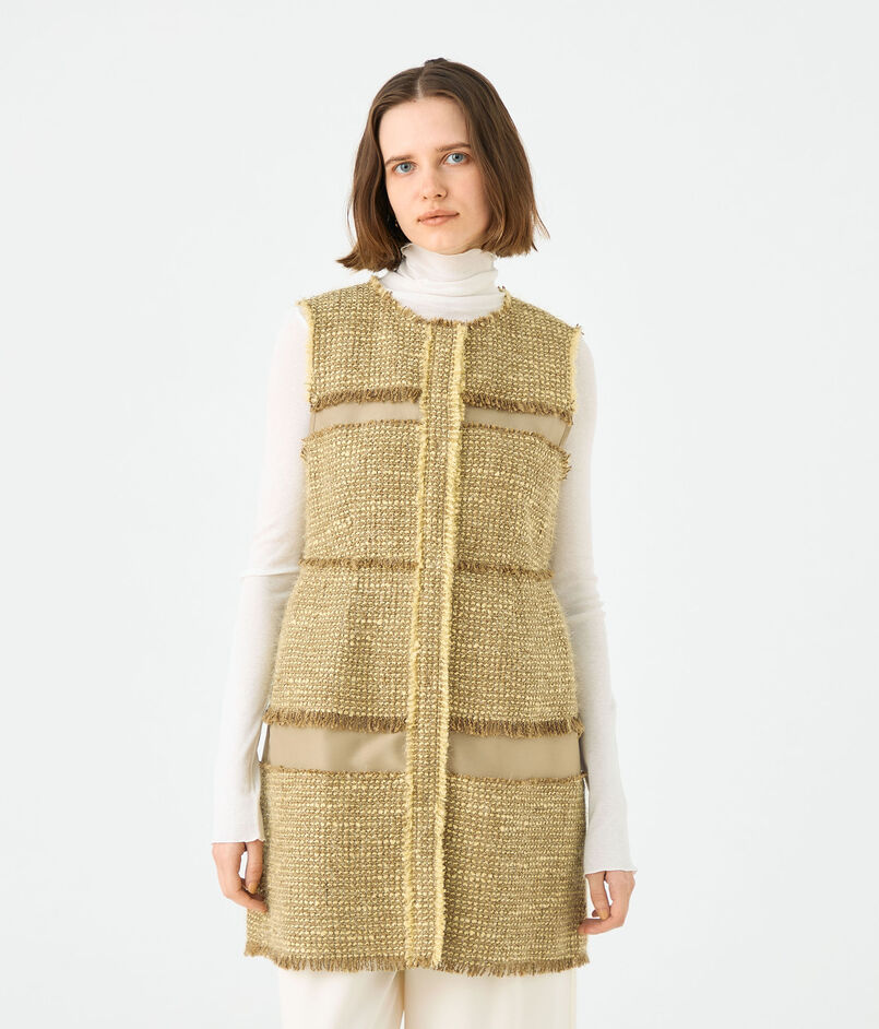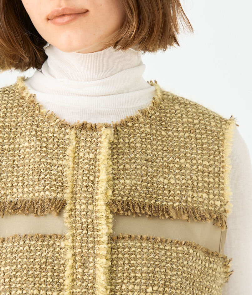 ラメのような輝きを持つスパーク糸が特徴のカラーツイード素材を使用したジレ。