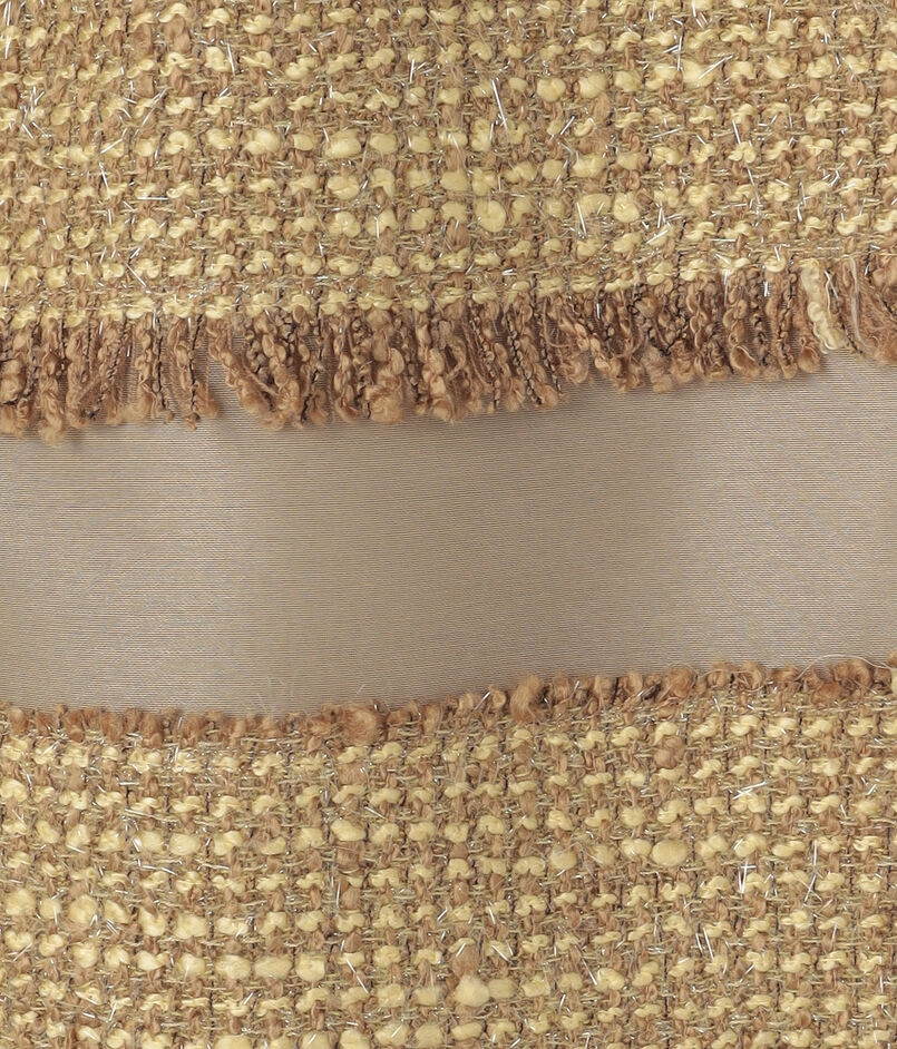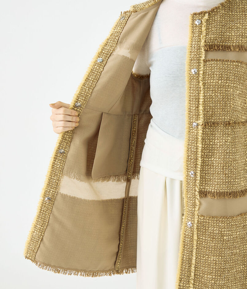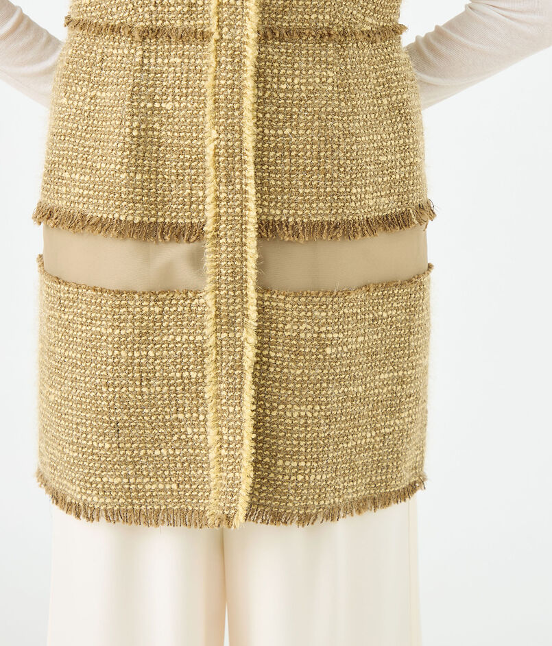 ツイードとハリのあるオーガンジー素材をブロッキングで切り替えることで素材のコントラストが生まれ、表情豊かなアイテムに仕上がっています。