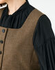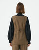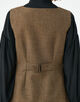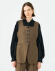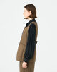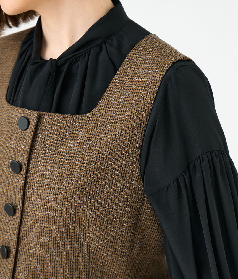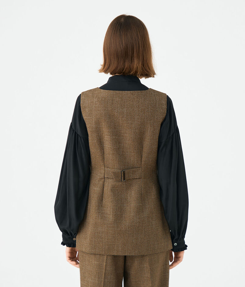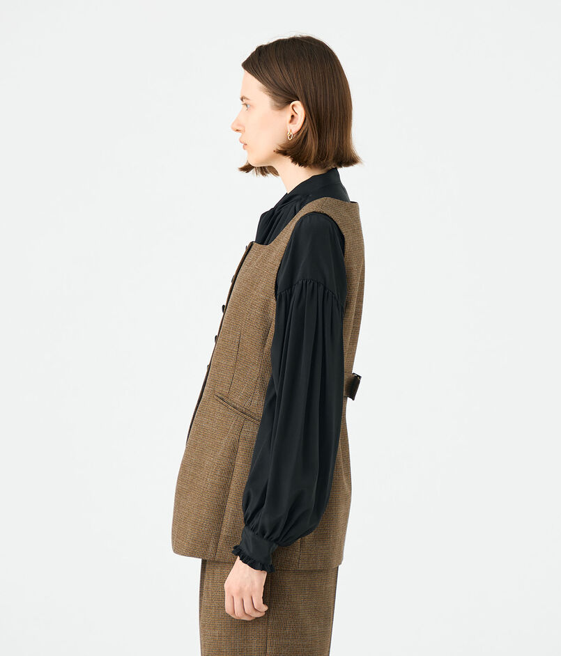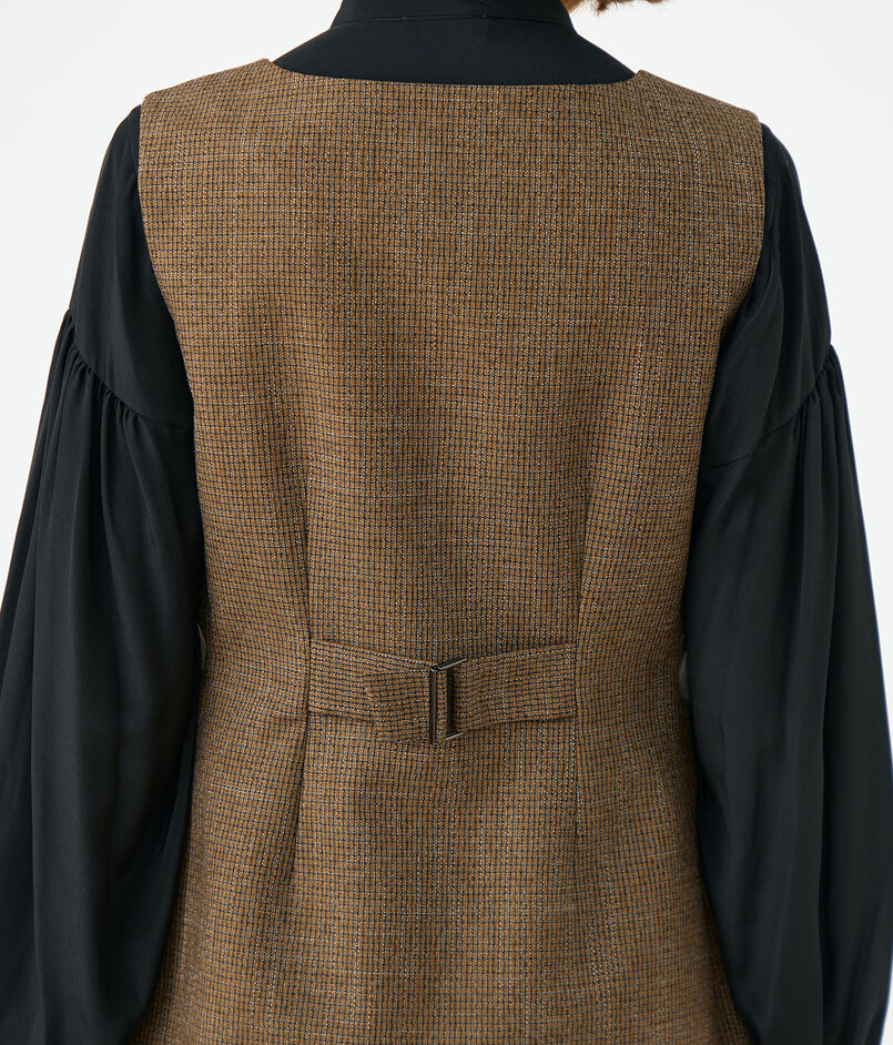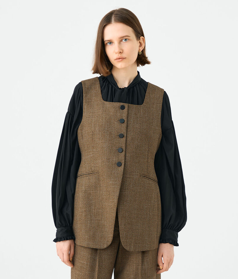デコルテが大きく開いたジレは、ほど良くボディコンシャスにすることで新鮮なバランスを楽しめる一枚。