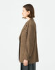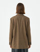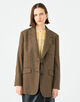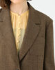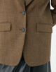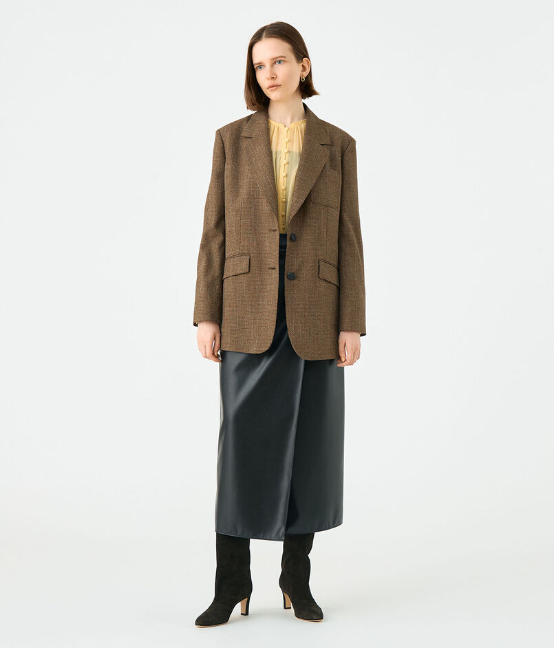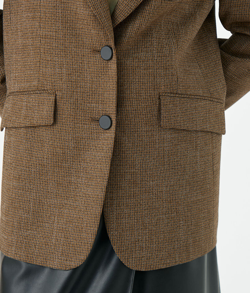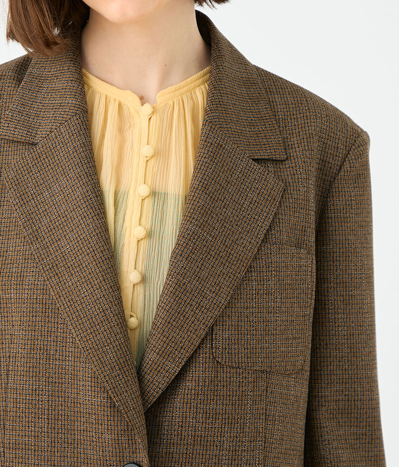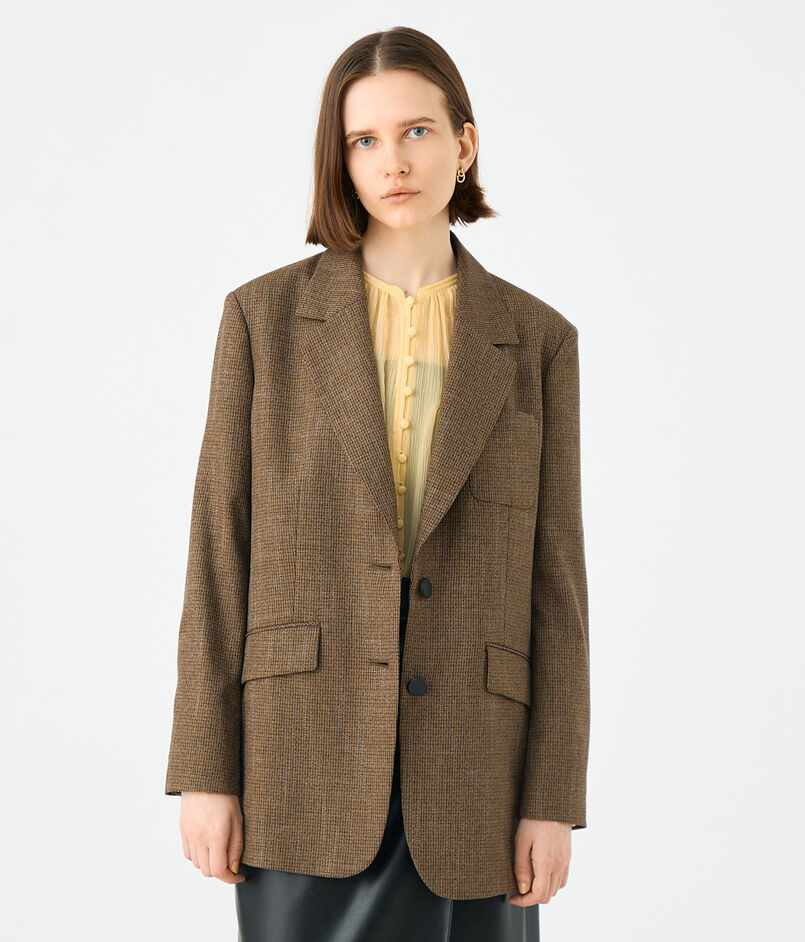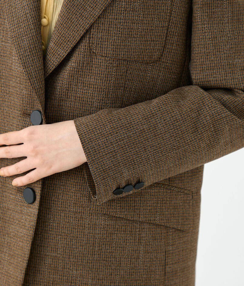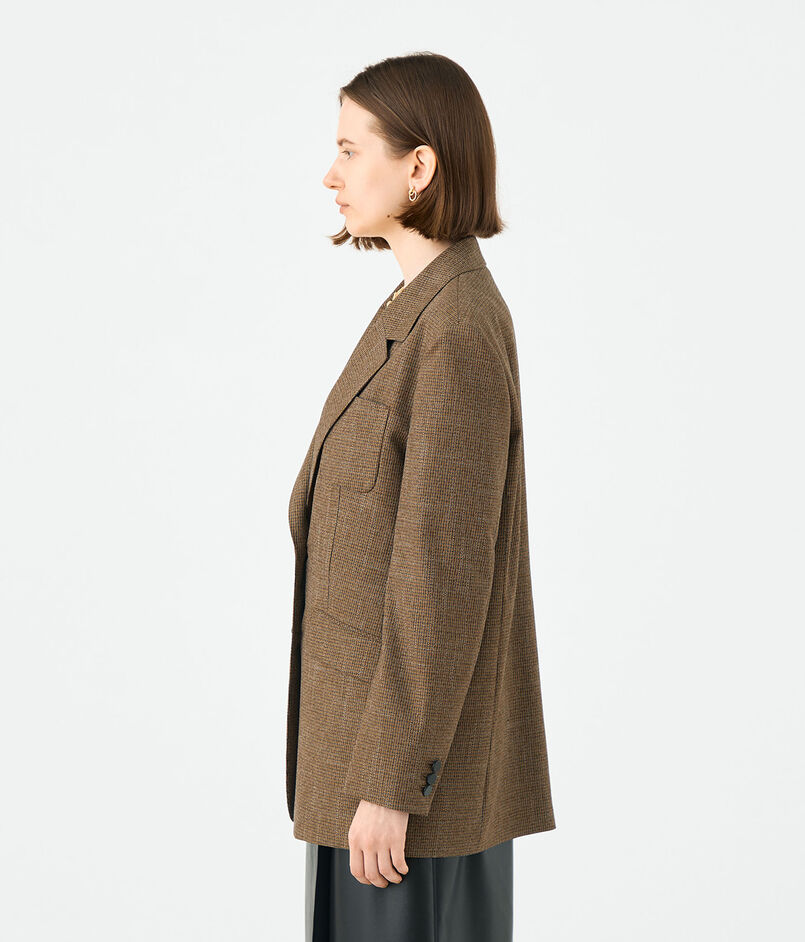 ジャケットはボクシーなシルエットにやや幅広のラペル、ヒップにかかる長めの着丈でマニッシュなバランスの一着。