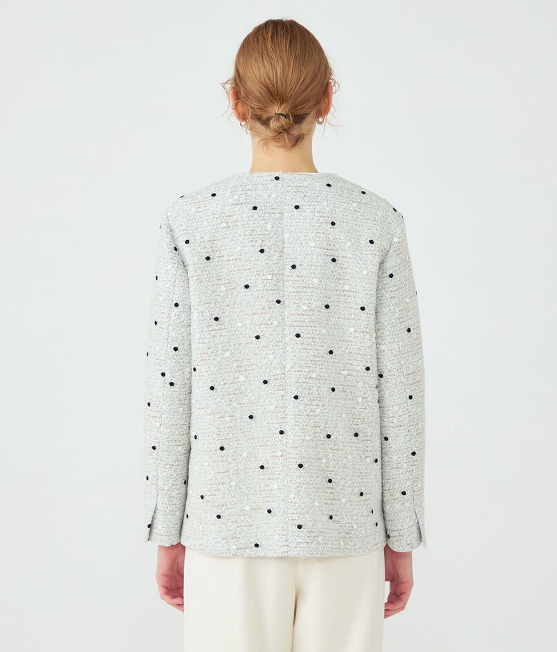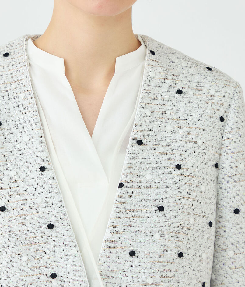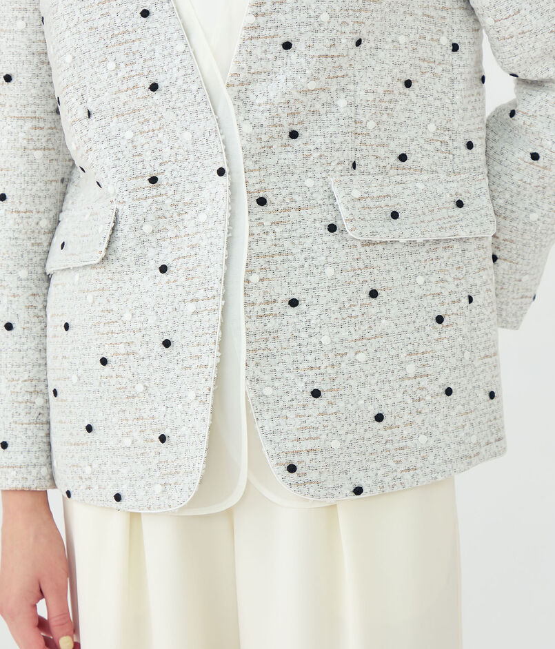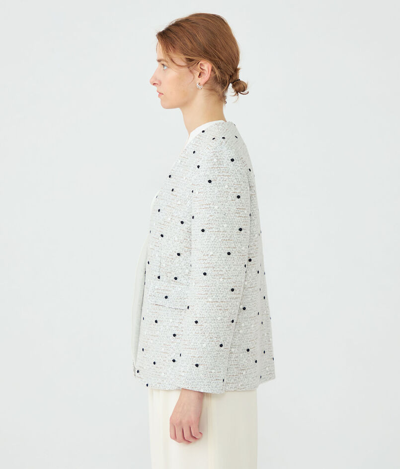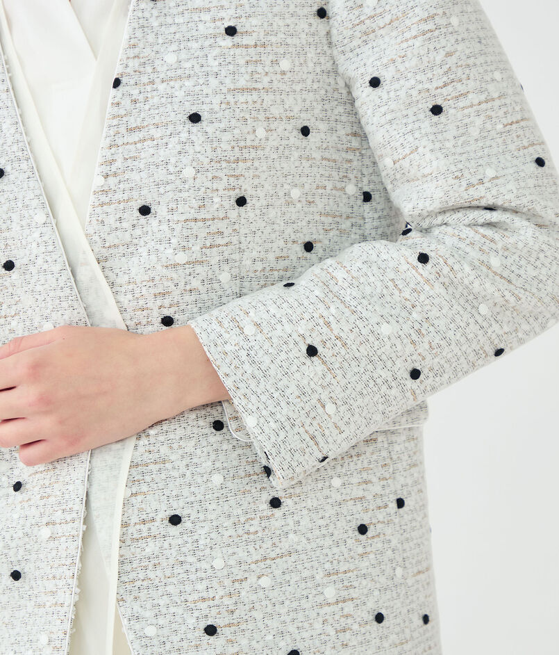 フリンジヤーンを贅沢に使用したツイードをベースに、ドット柄を立体的に刺繍したチュール素材を上からラッピングしたこだわりの一着です。