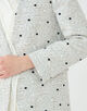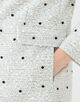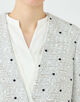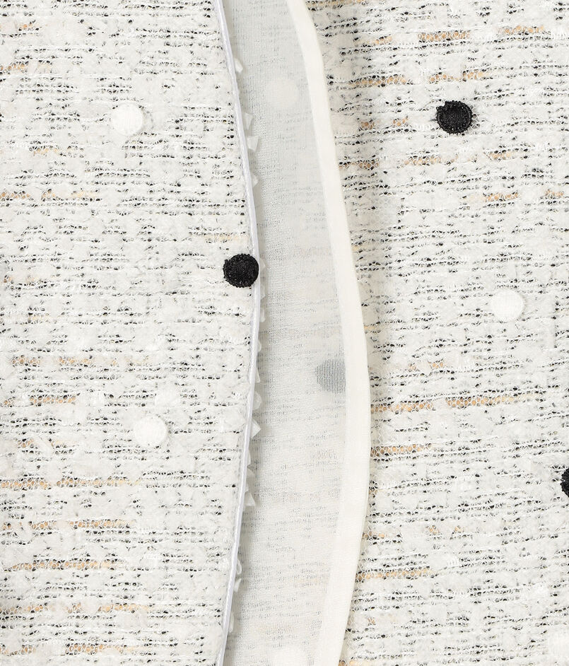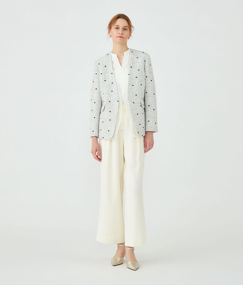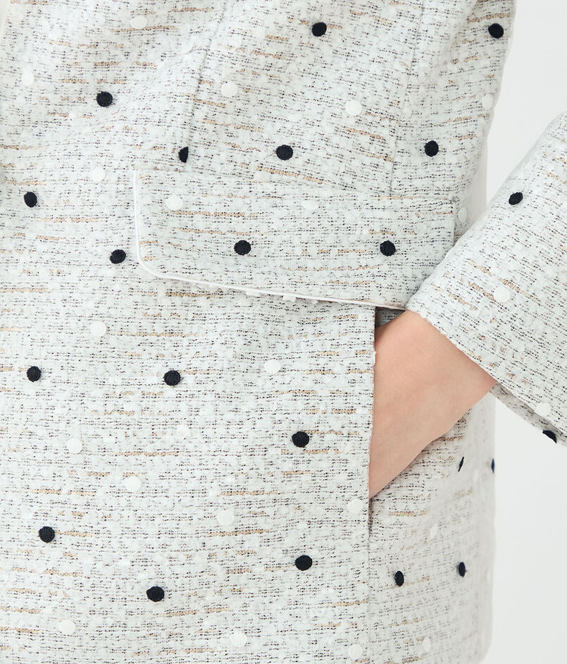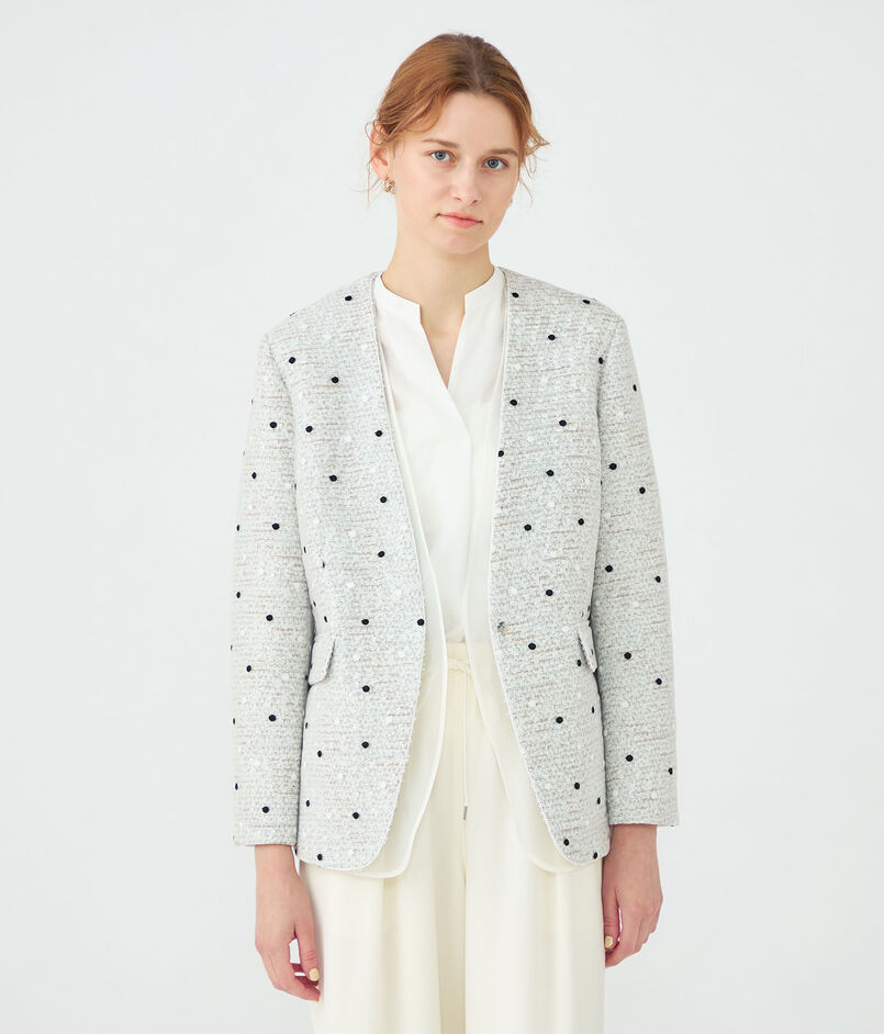 フリンジヤーンを贅沢に使用したツイードをベースに、ドット柄を立体的に刺繍したチュール素材を上からラッピングしたこだわりの一着です。