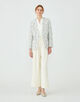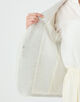 ジャケットはフロントのVあきがシャープな印象ながら、ほど良くコンパクトなフォルムとややシェイプされたウエストラインで女性らしく着こなしていただけます。