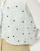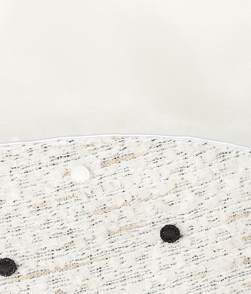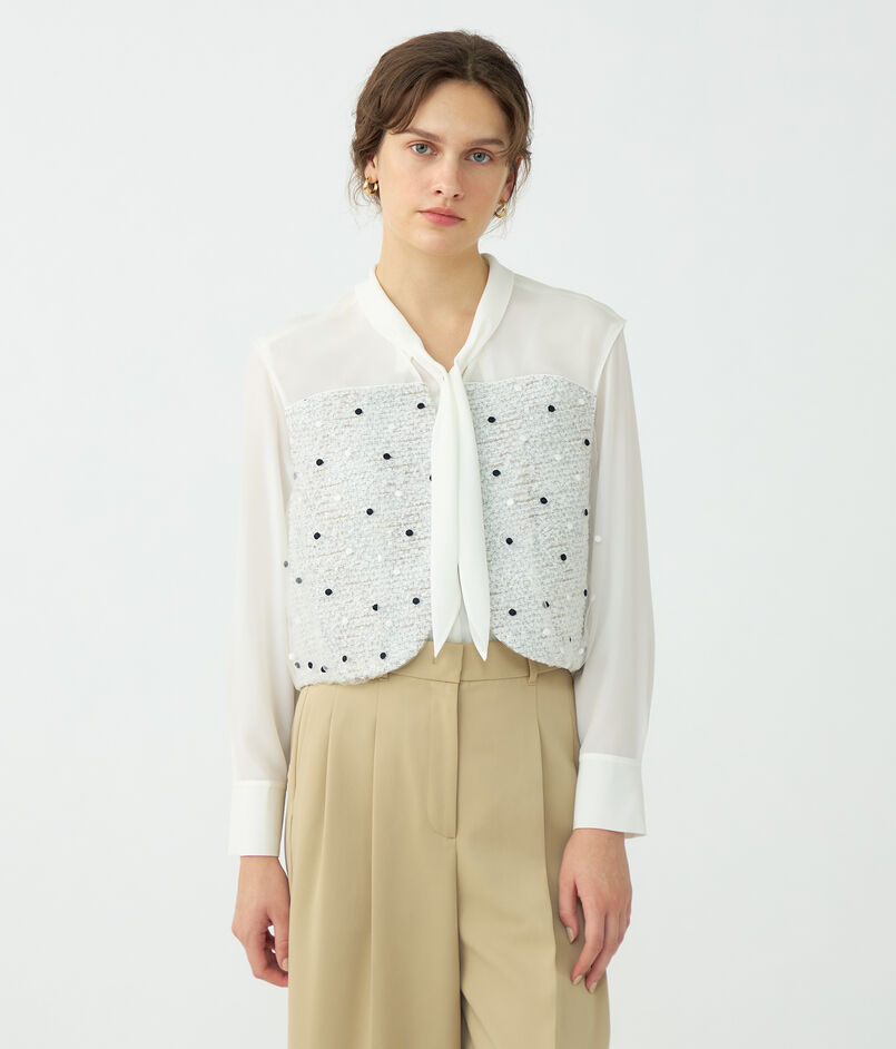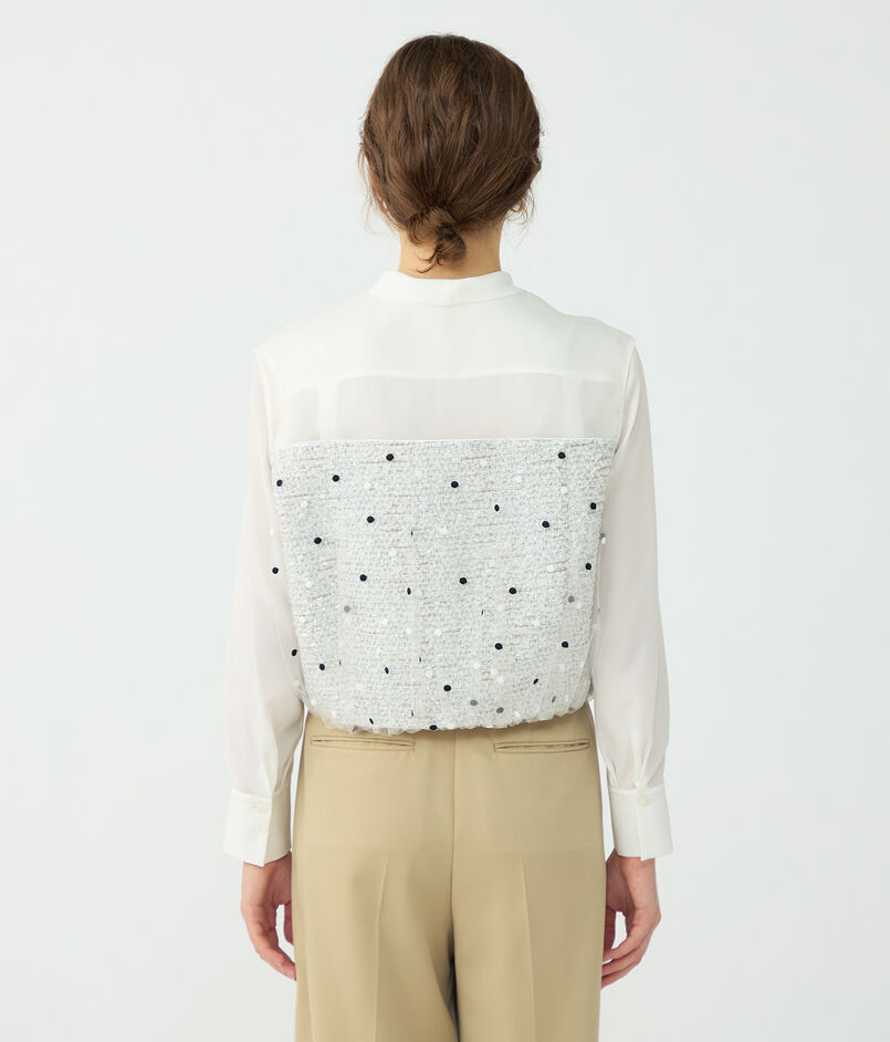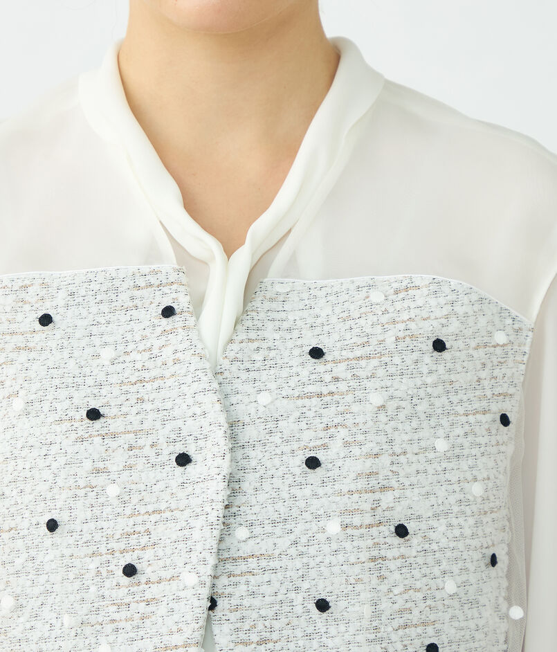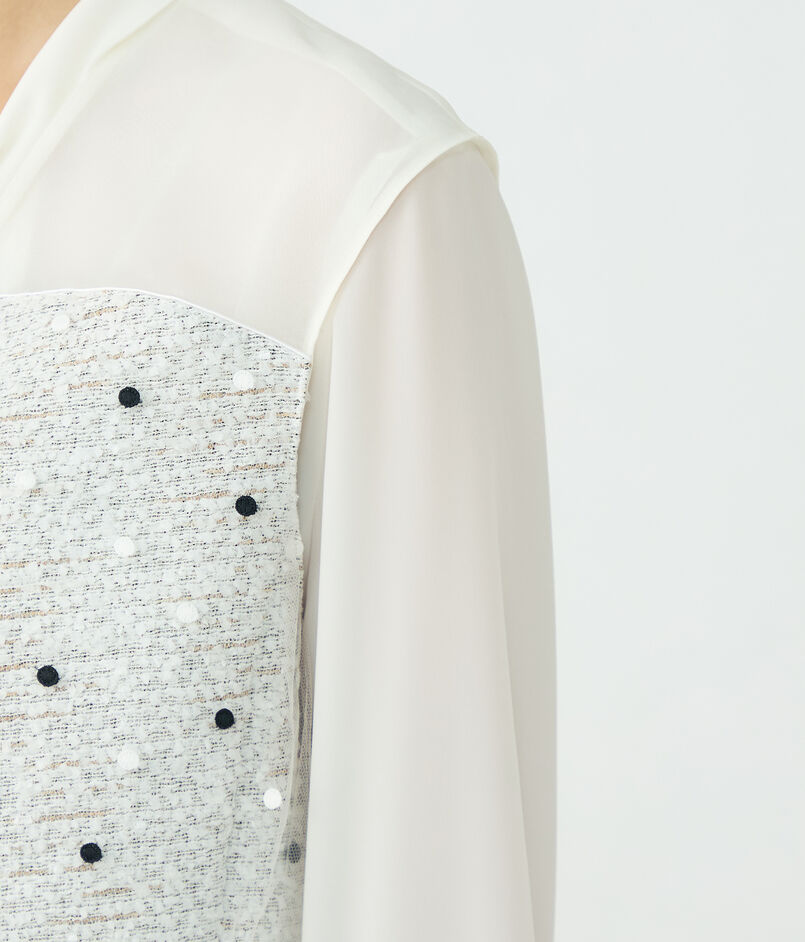 フリンジヤーンを贅沢に使用したツイードをベースに、ドット柄を立体的に刺繍したチュール素材を上からラッピングしたこだわりの一着です。