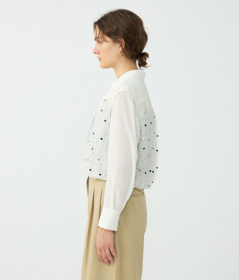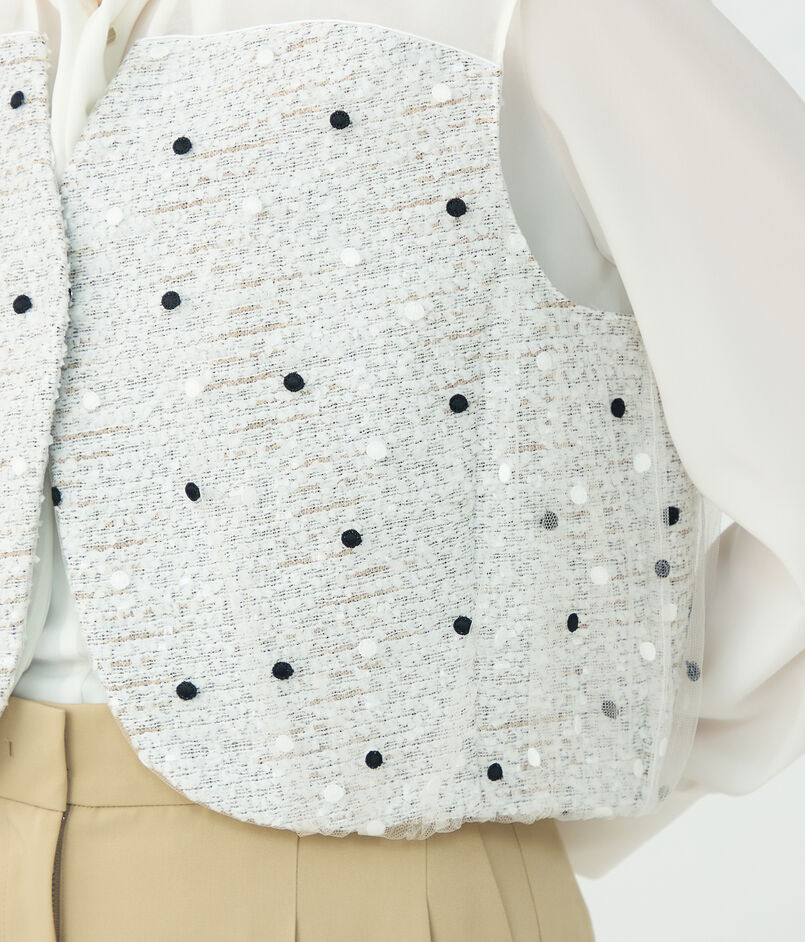 ツイードとチュール素材のミックス感が華やかな印象のジレ。