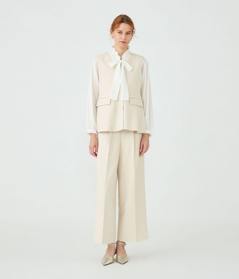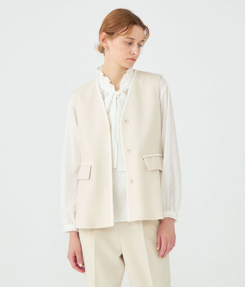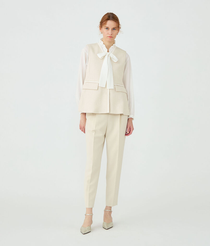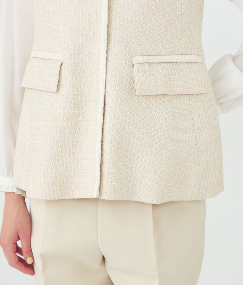 ジレはペプラムシルエットや高めに配したフラップポケットでスタイルアップ効果も期待できる一着。