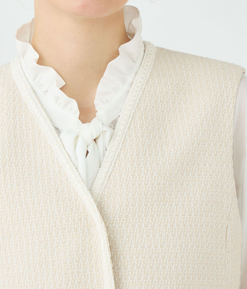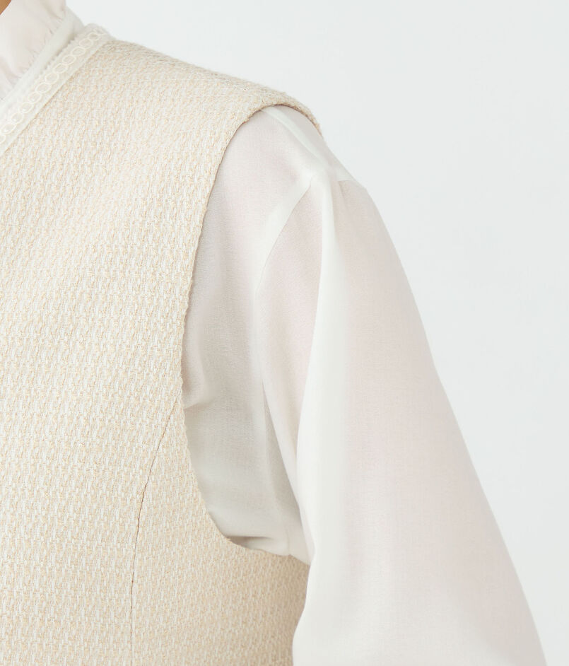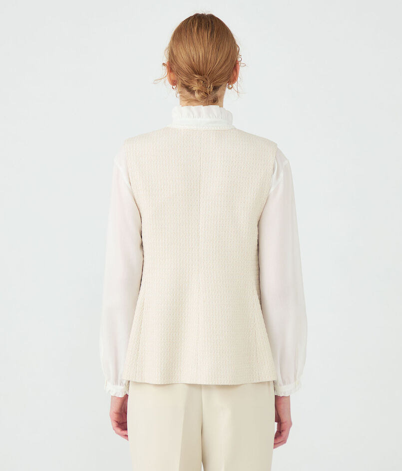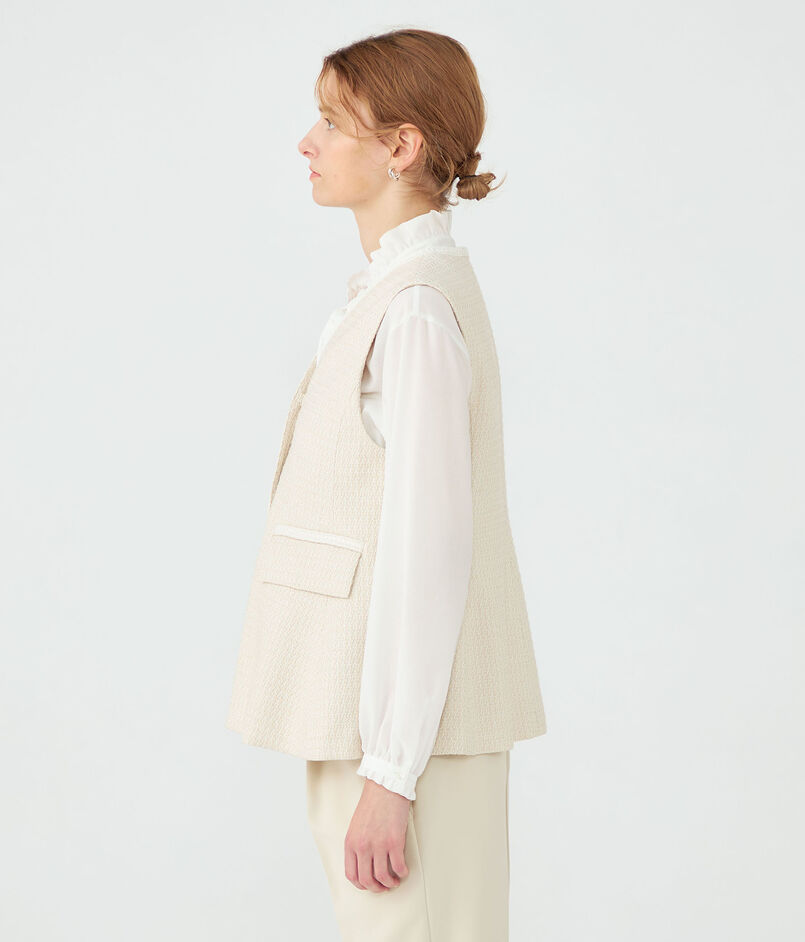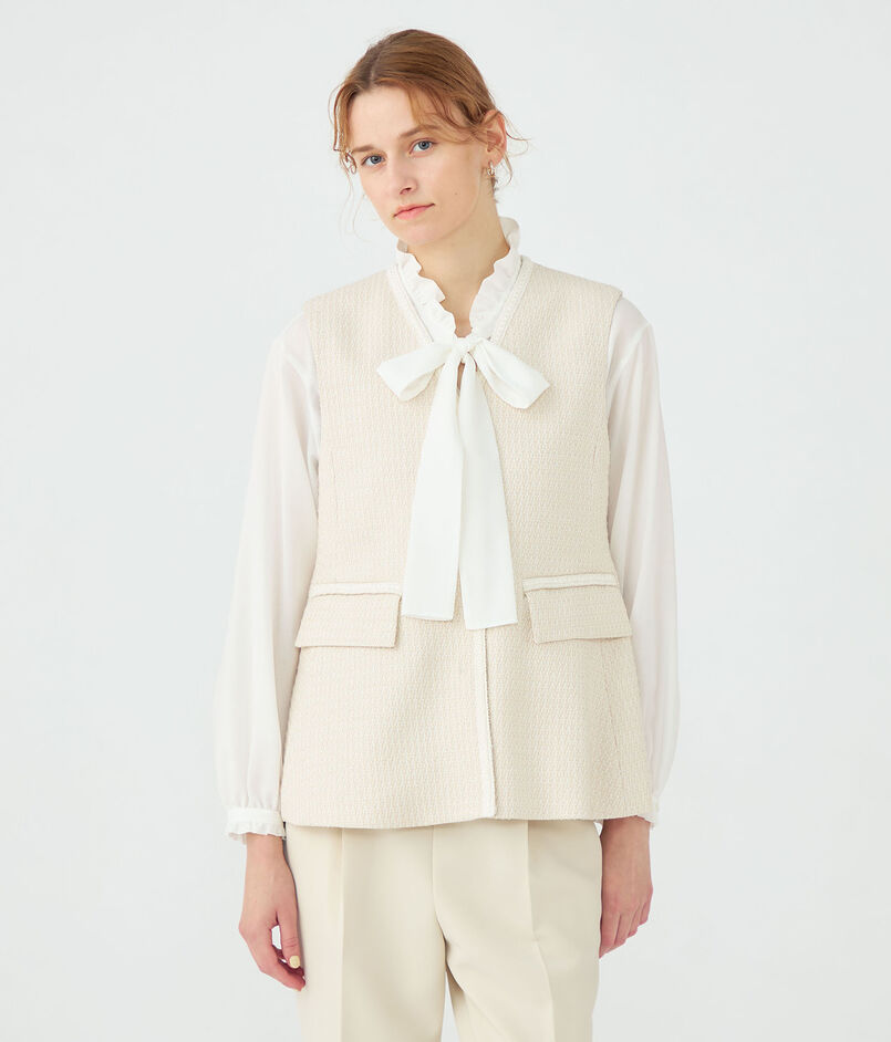 ジレはペプラムシルエットや高めに配したフラップポケットでスタイルアップ効果も期待できる一着。