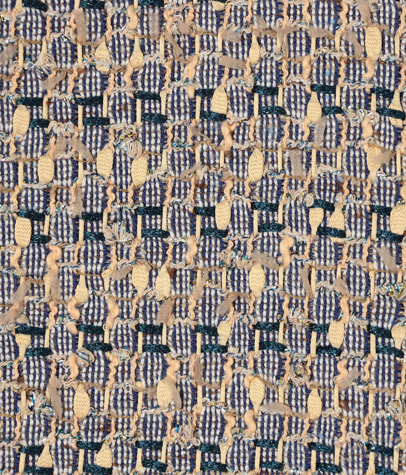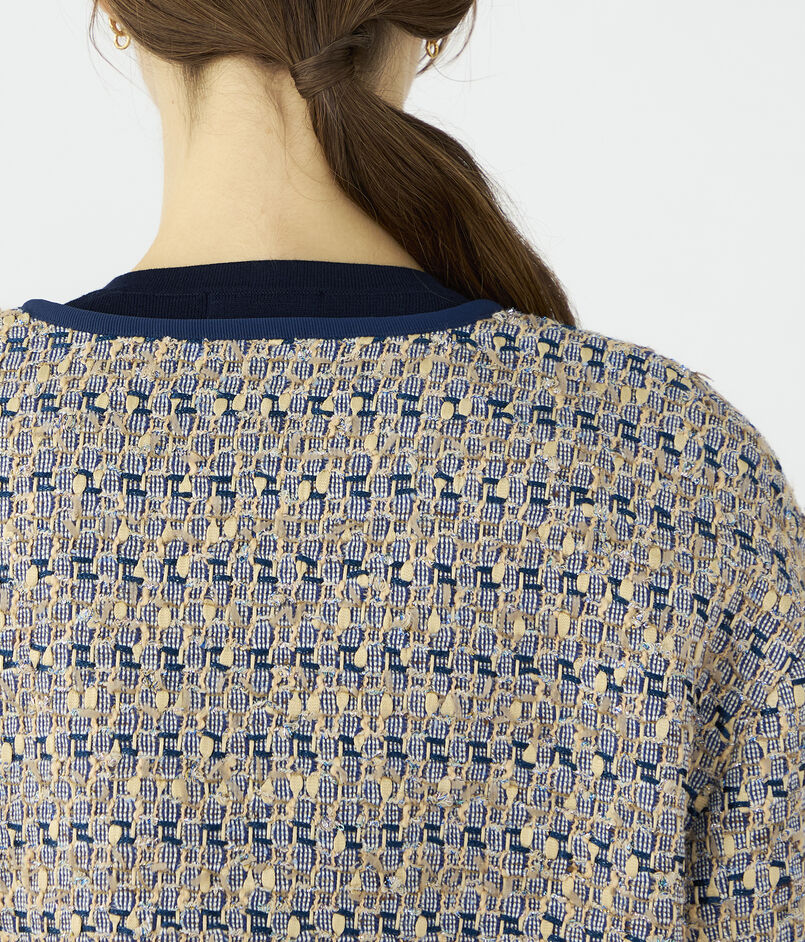 パイ生地を表現するように繊細なベージュやクリーム色の糸、さらにシルバーやターコイズのラメ糸を織り込むことで、まるで宝石を散りばめたかのような輝きを生み出しています。