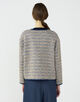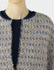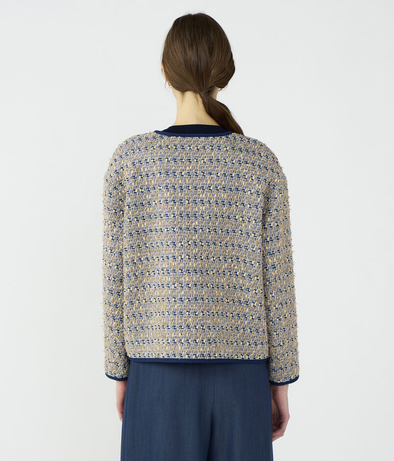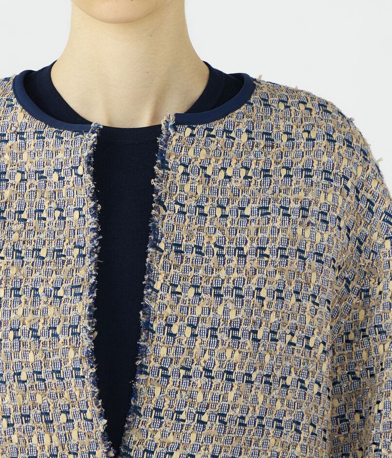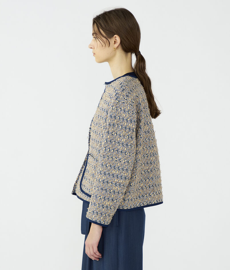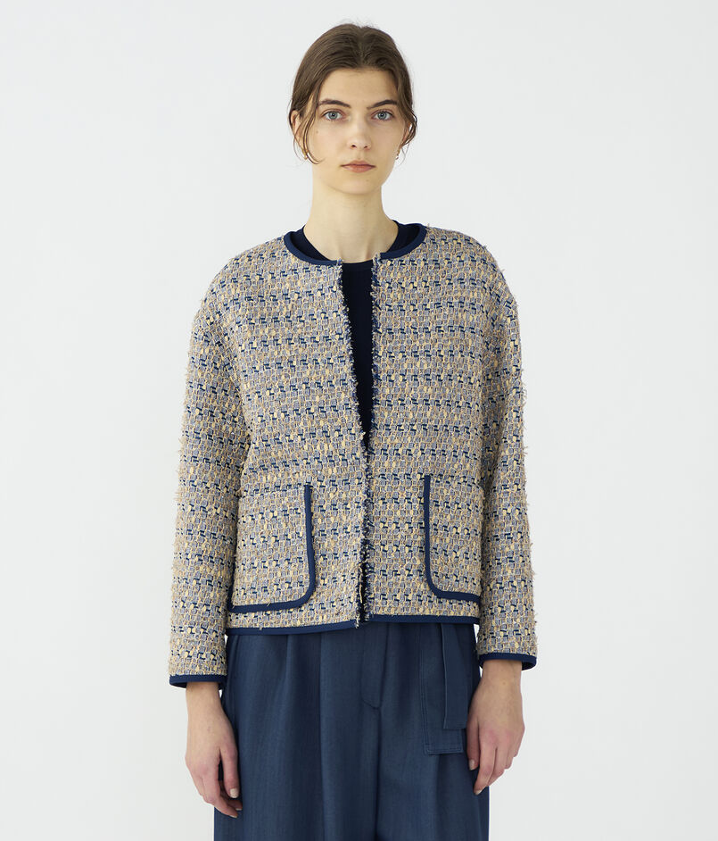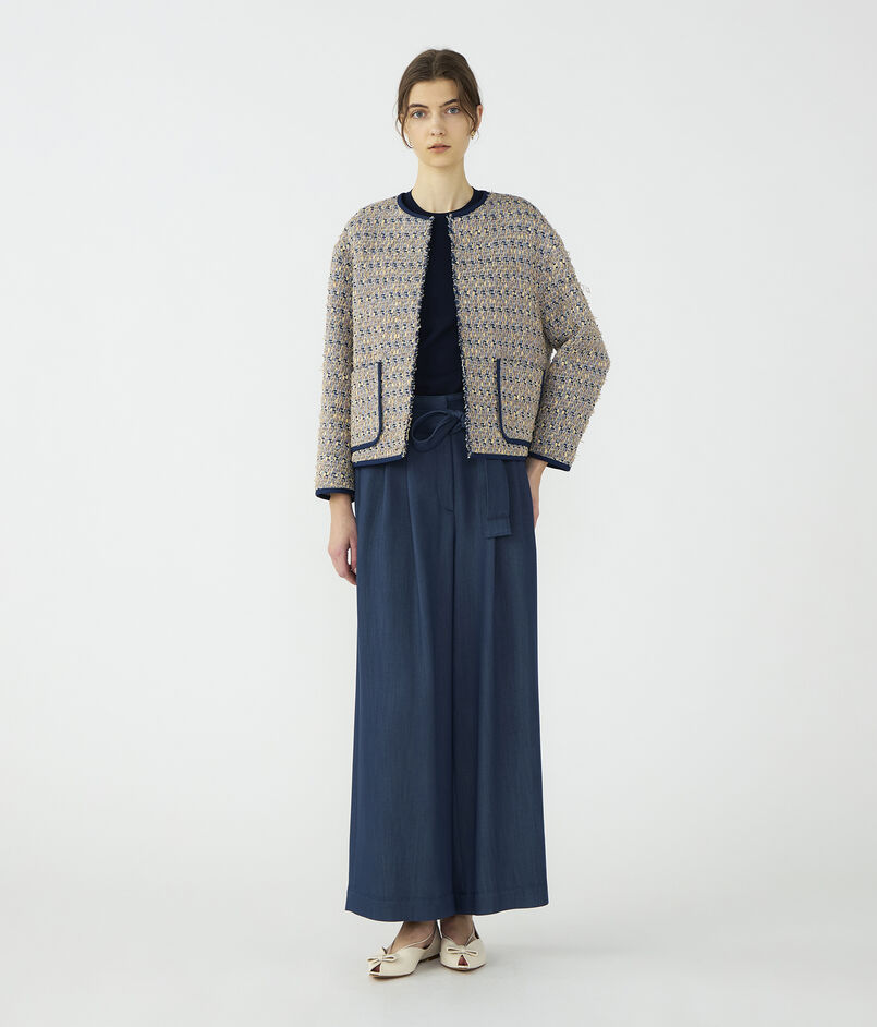 ジャケットは肩のラインに沿う丸みのあるシルエットで、柔らかな雰囲気で着こなせる一着。