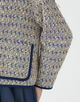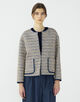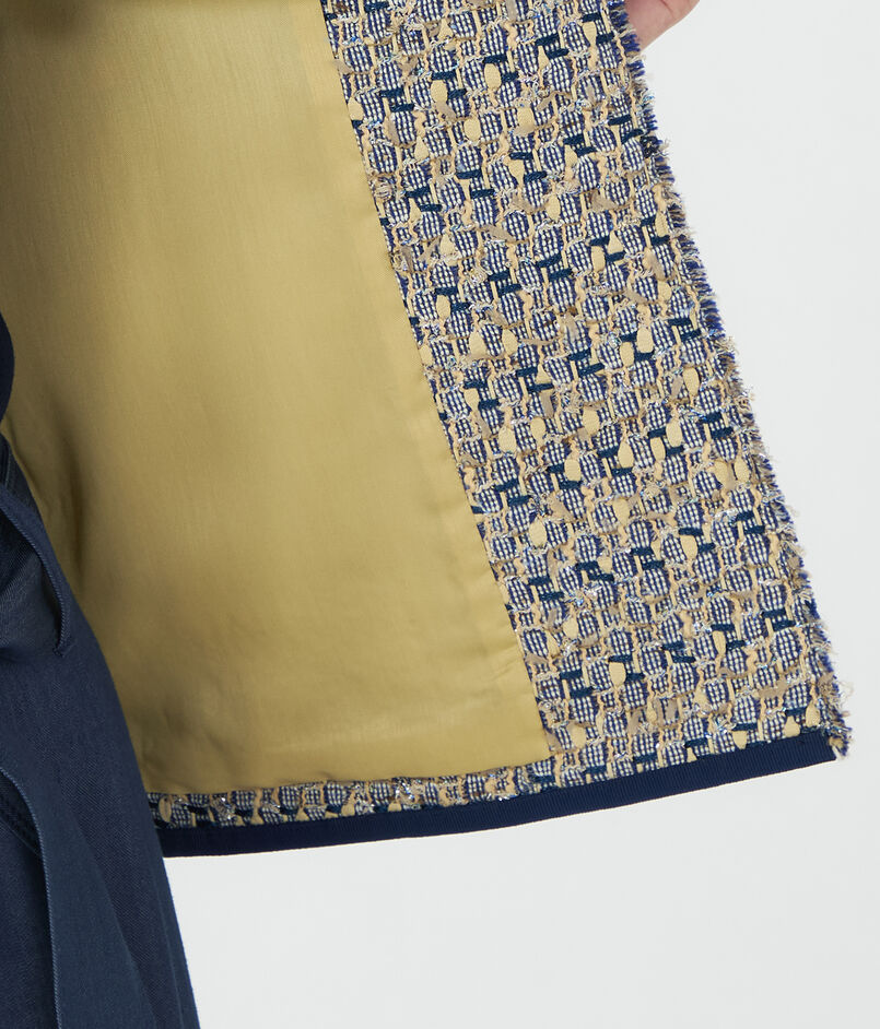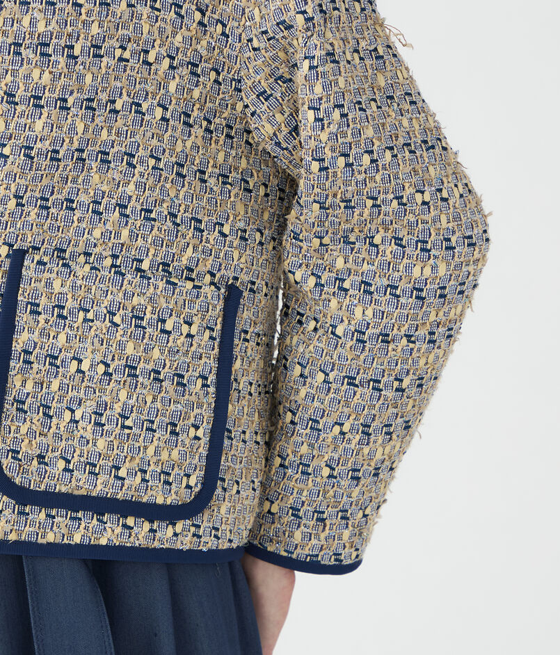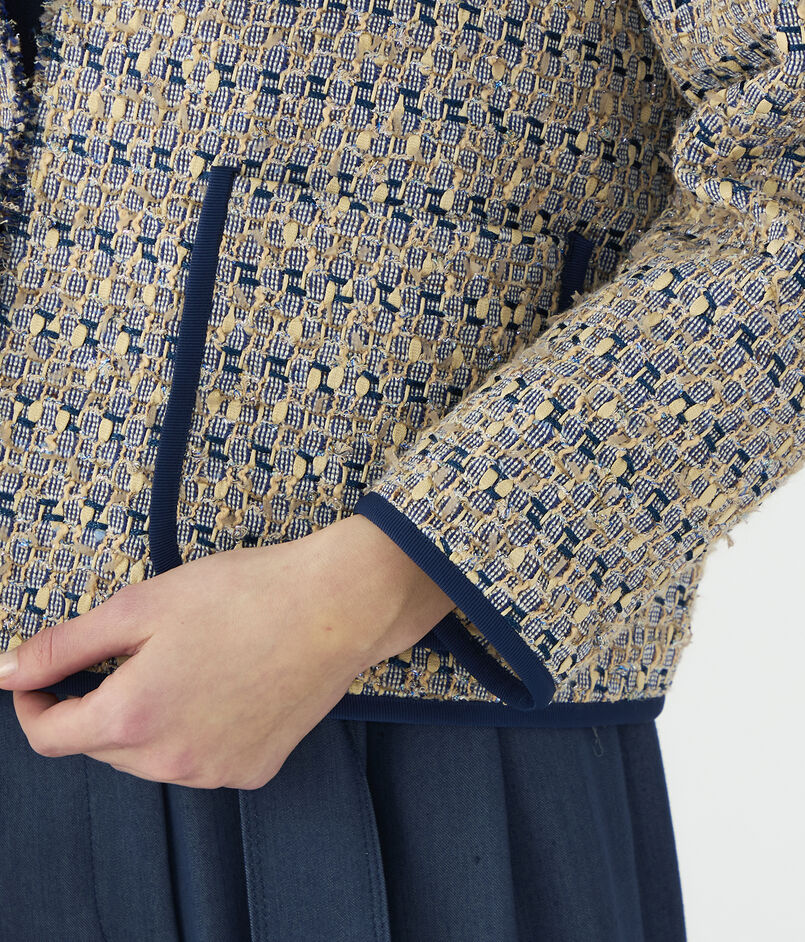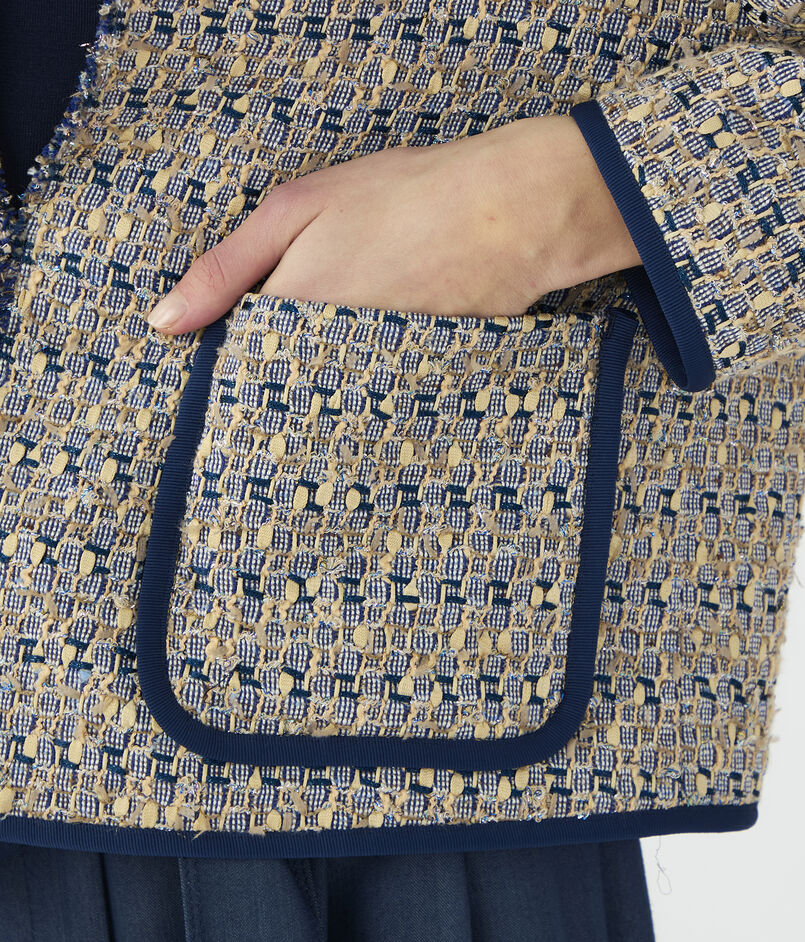 襟ぐりや袖口、裾、ポケットまわりに施したパイピングが全体を引き締めつつほど良いアクセントになっています。