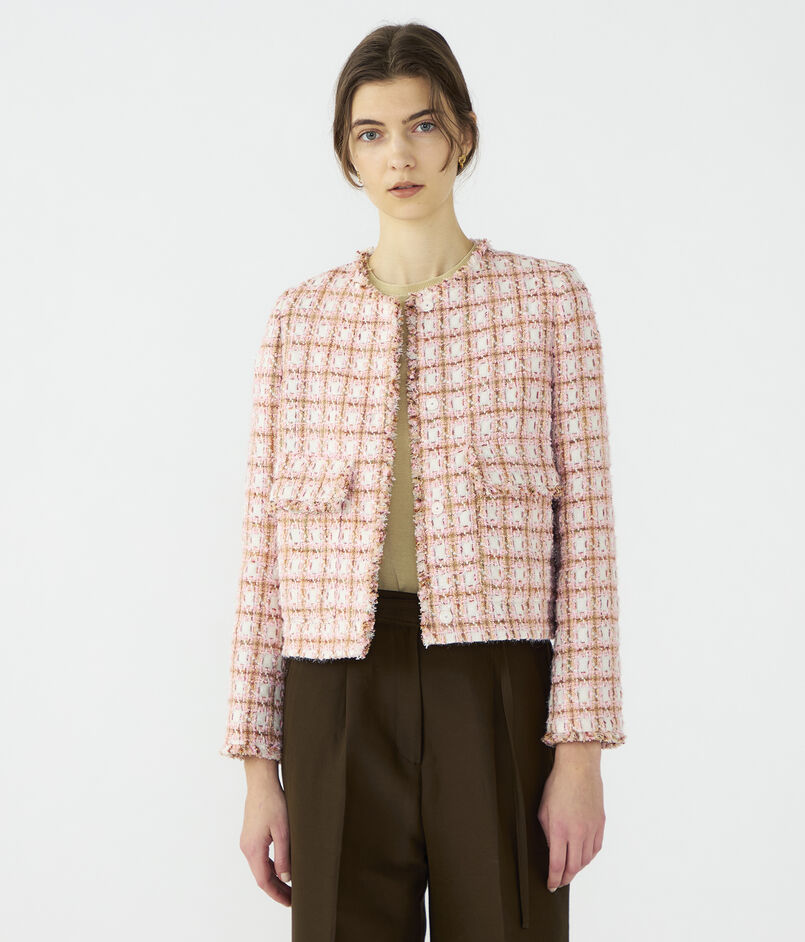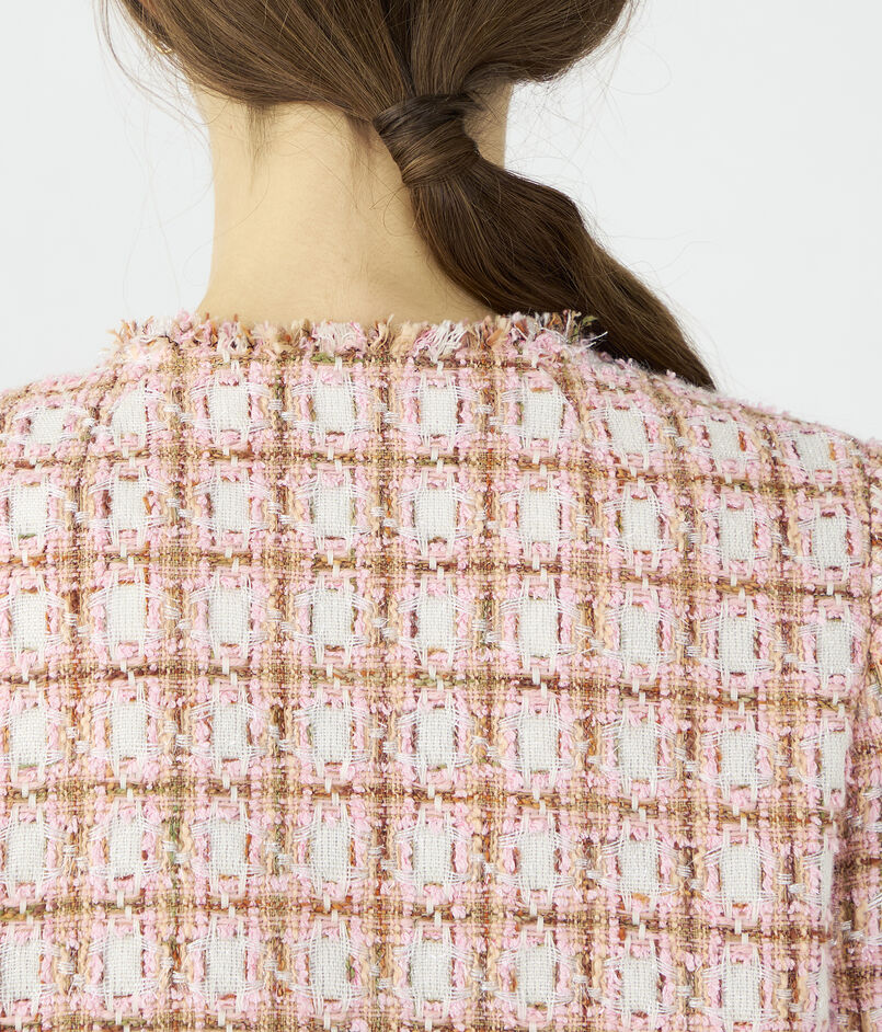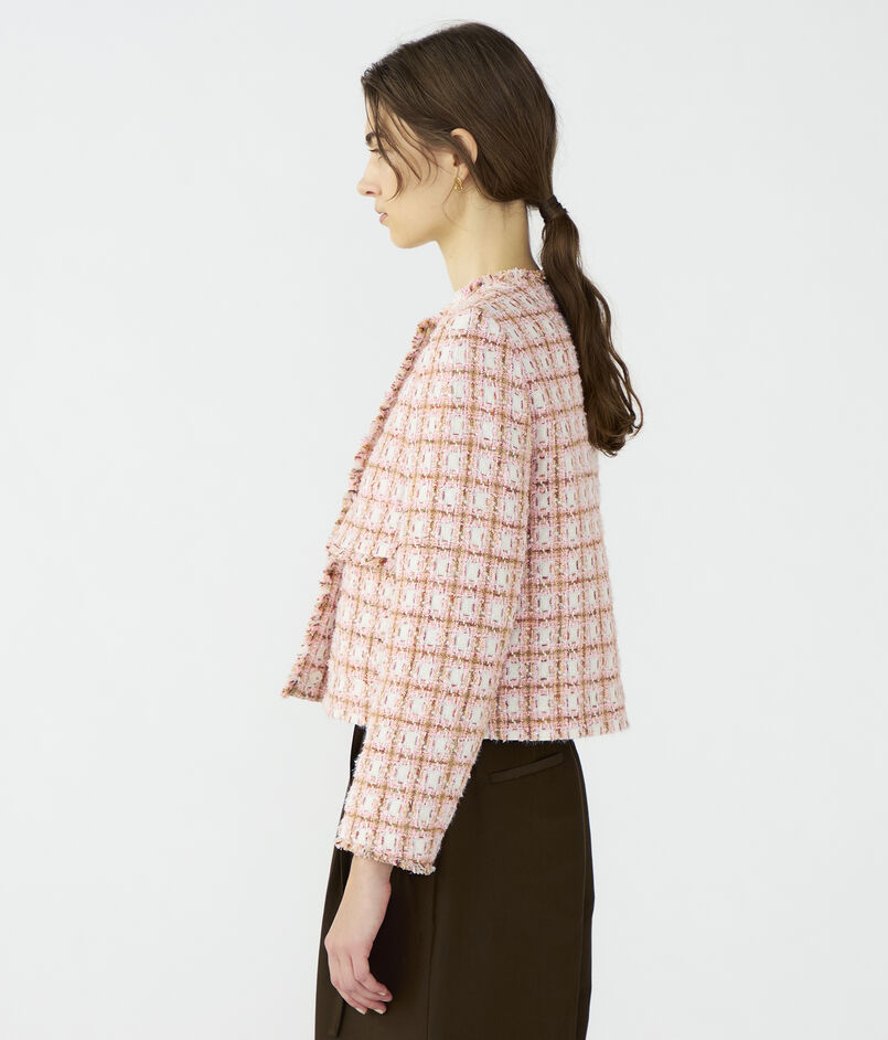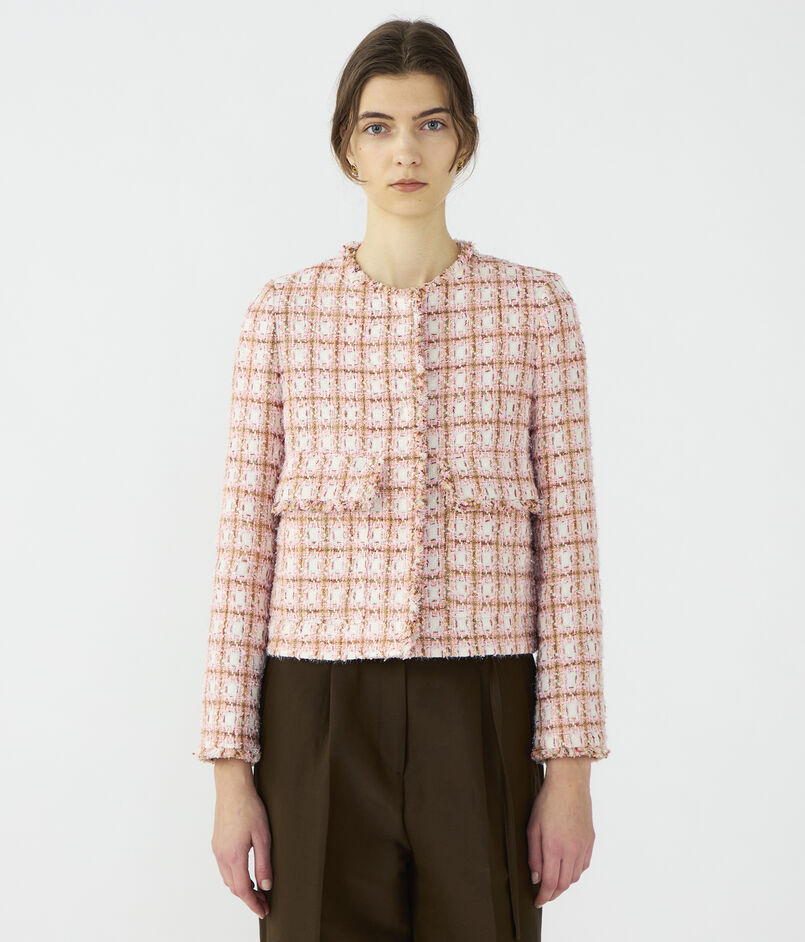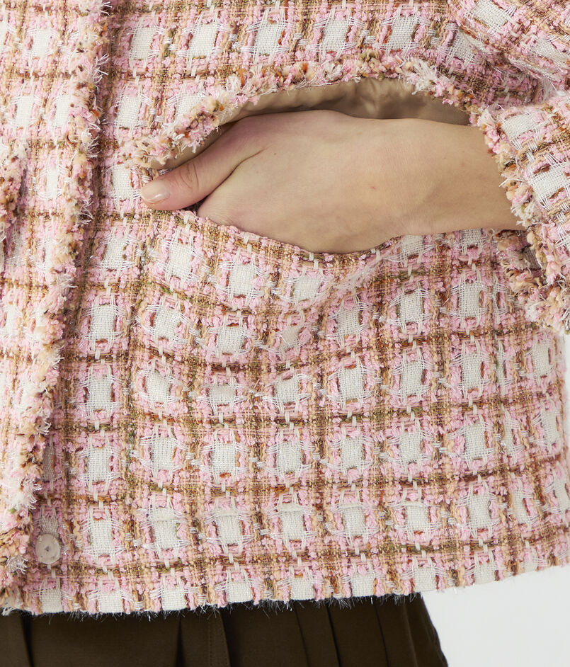 襟まわりや袖口、ポケットのフリンジディテールで華やかなアクセントをつけています。