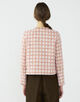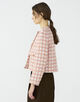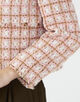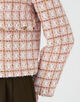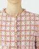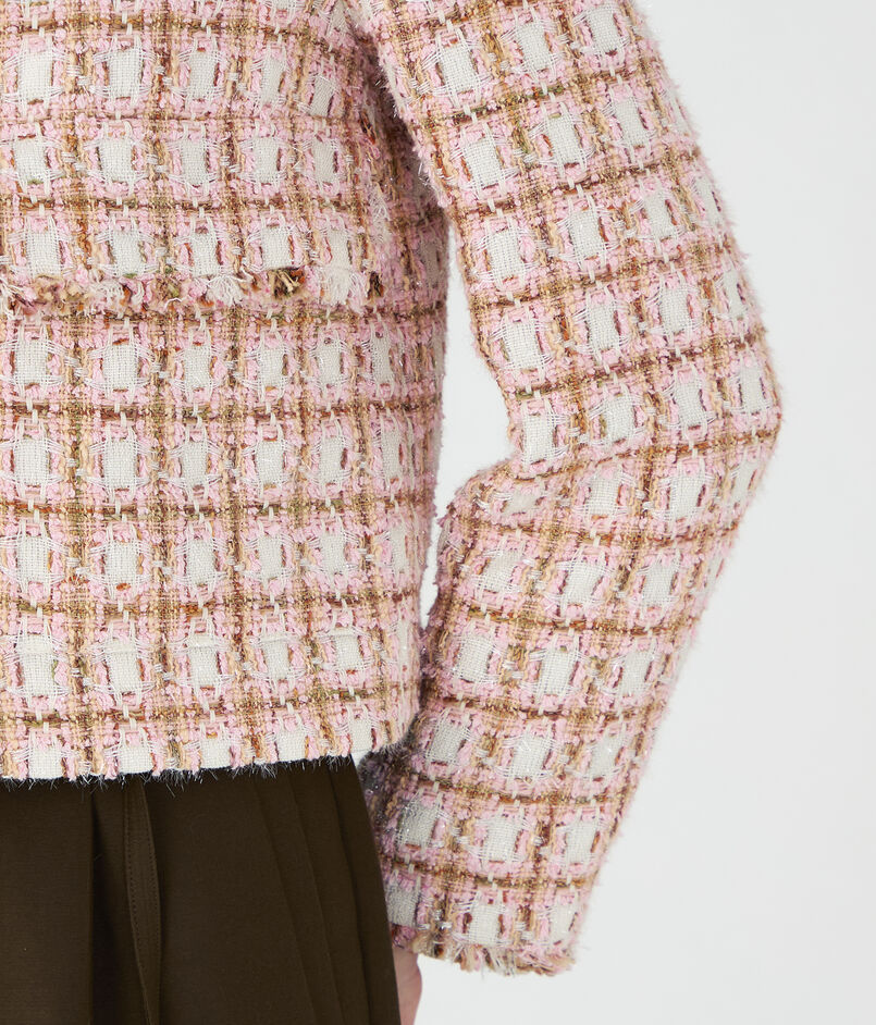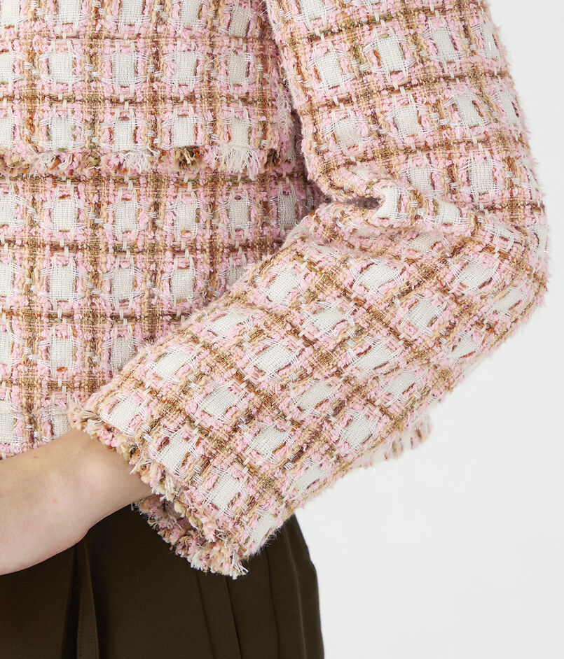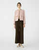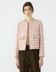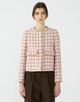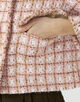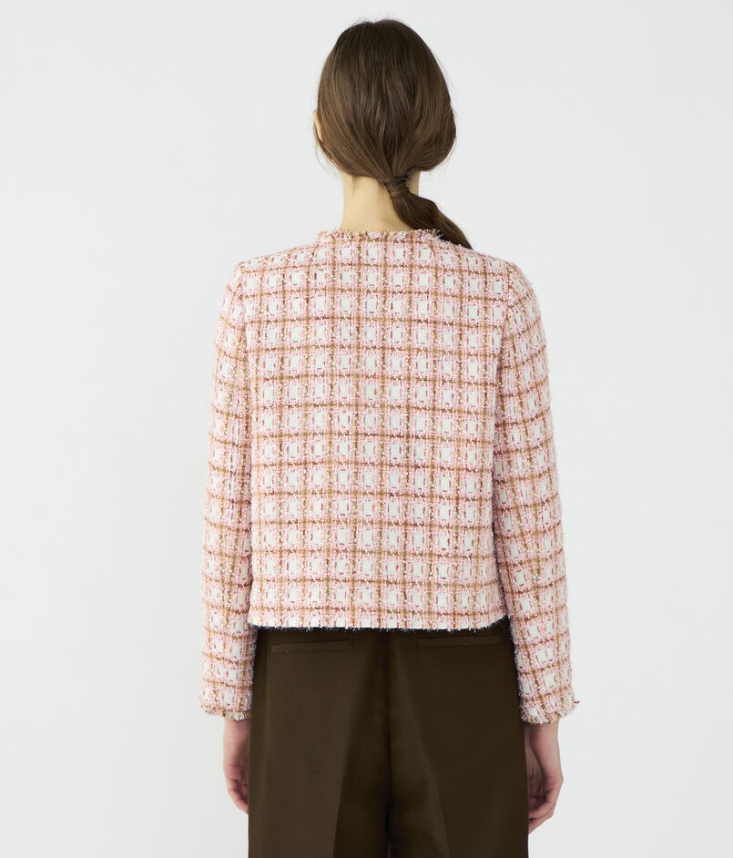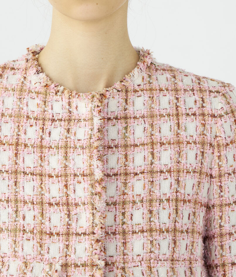 襟まわりや袖口、ポケットのフリンジディテールで華やかなアクセントをつけています。