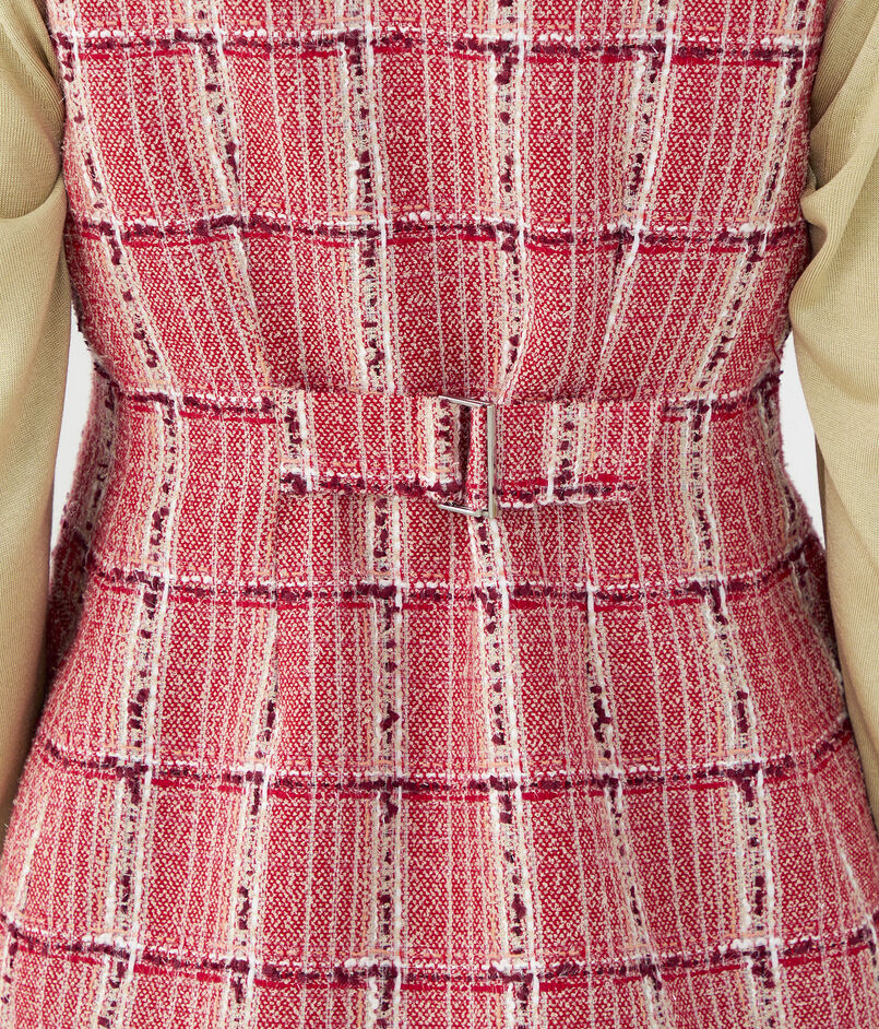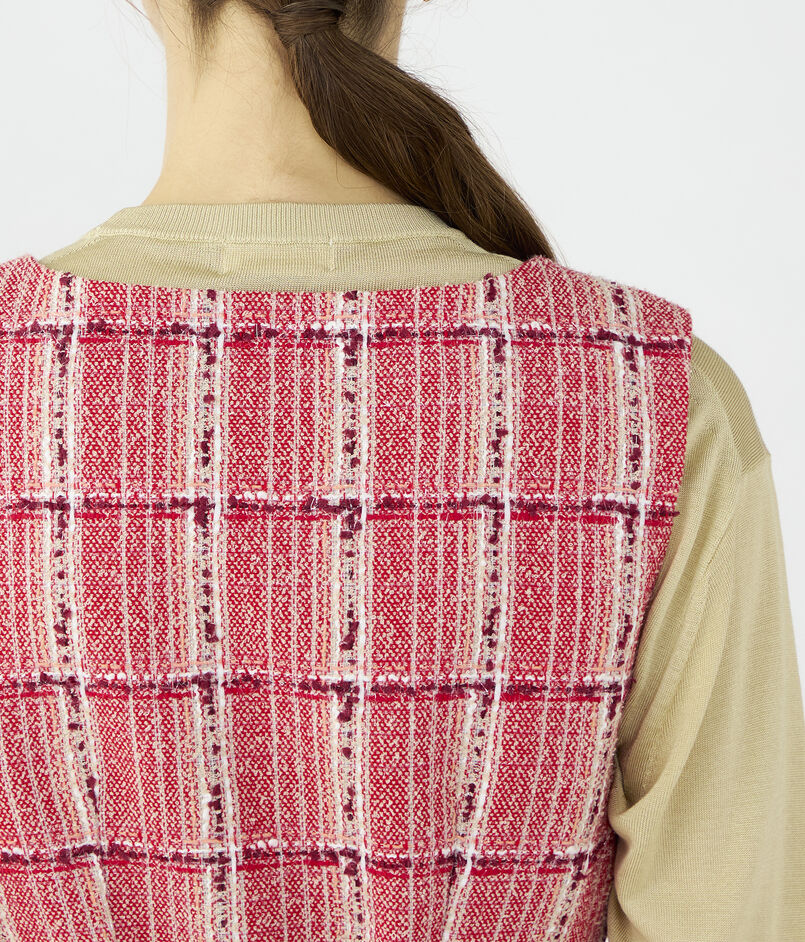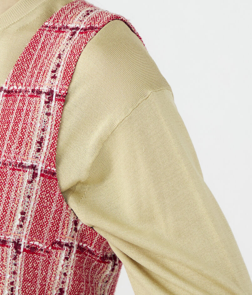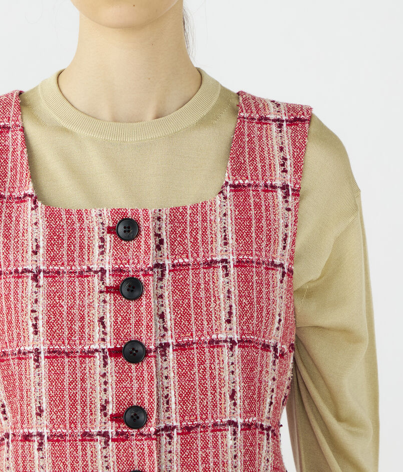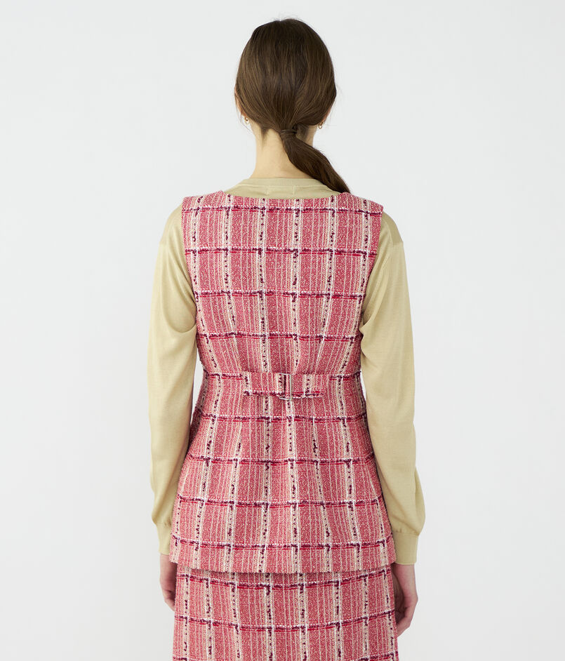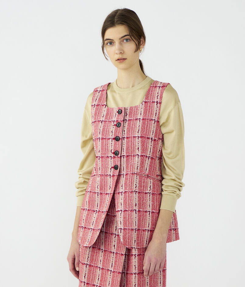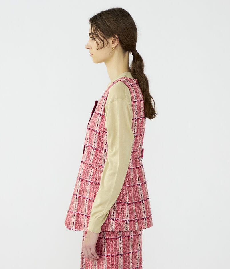 ジレは大きく開いたデコルテのラインとほど良くボディコンシャスなシルエットで新鮮なバランスを楽しめる一枚。