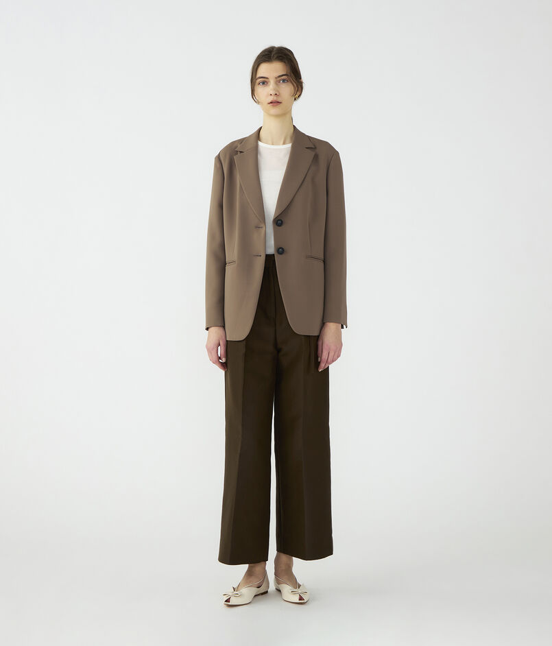 ジャケットはヒップにかかる長めの着丈でマニッシュなバランスで着こなせるバランスに仕上げました。