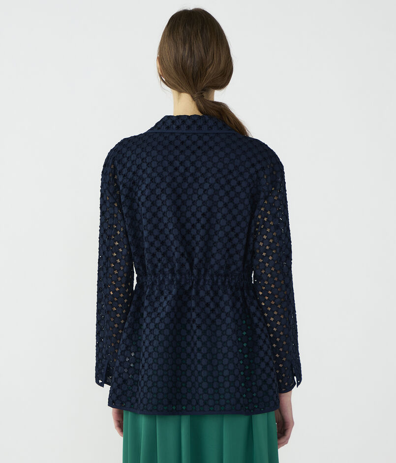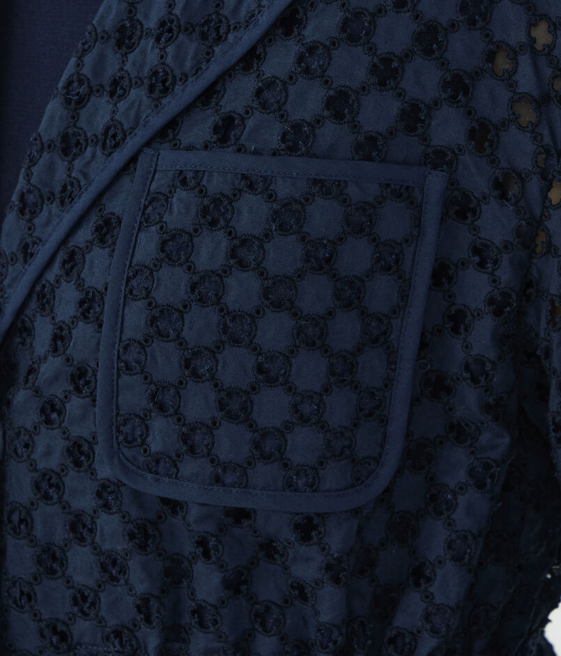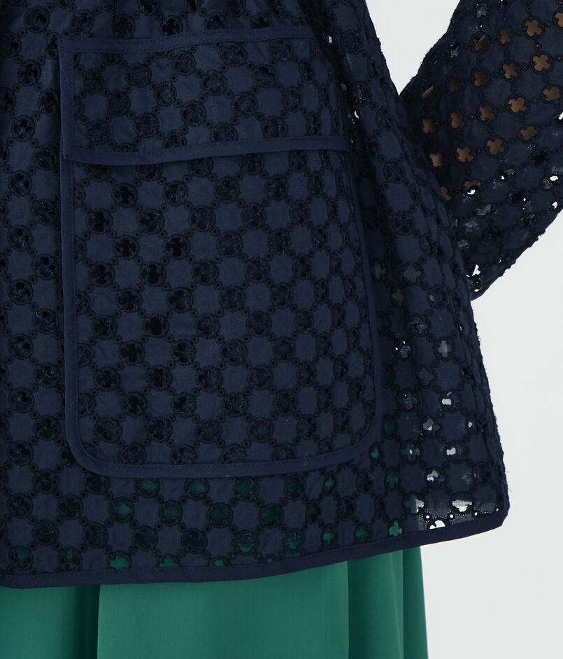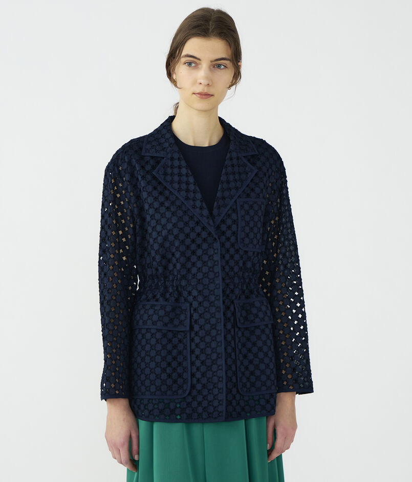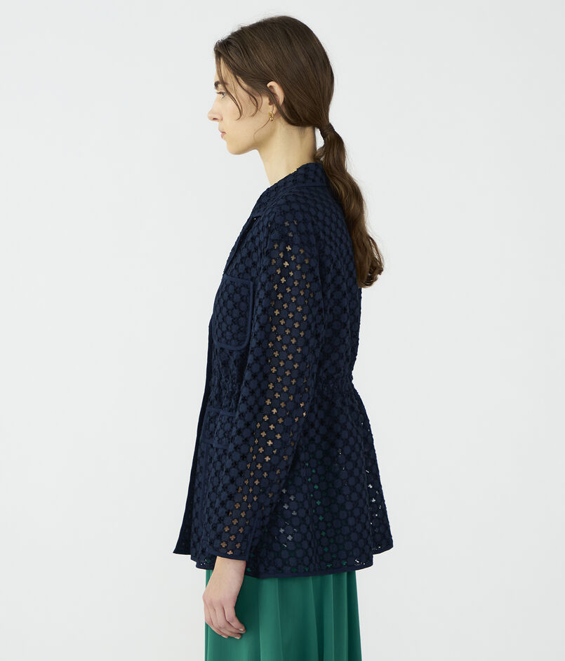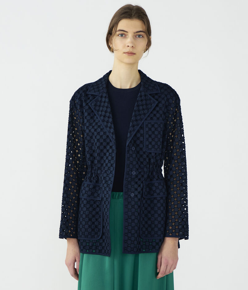 アイレット刺繍の生地で仕立てられたジャケットは新鮮な印象の一着。