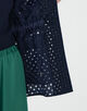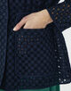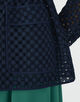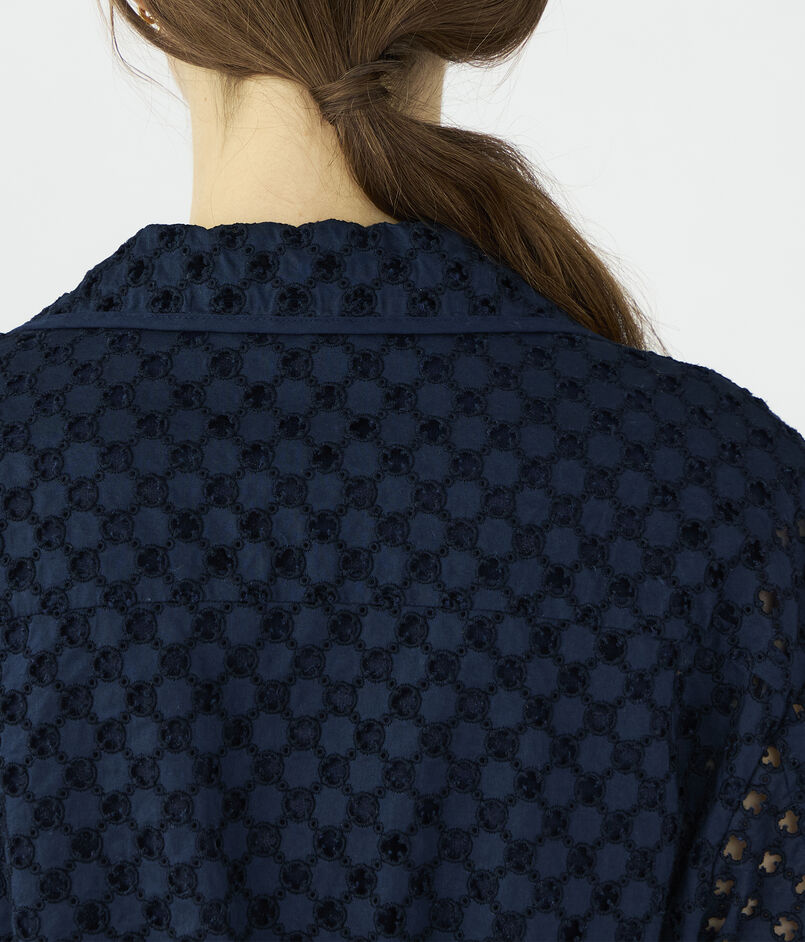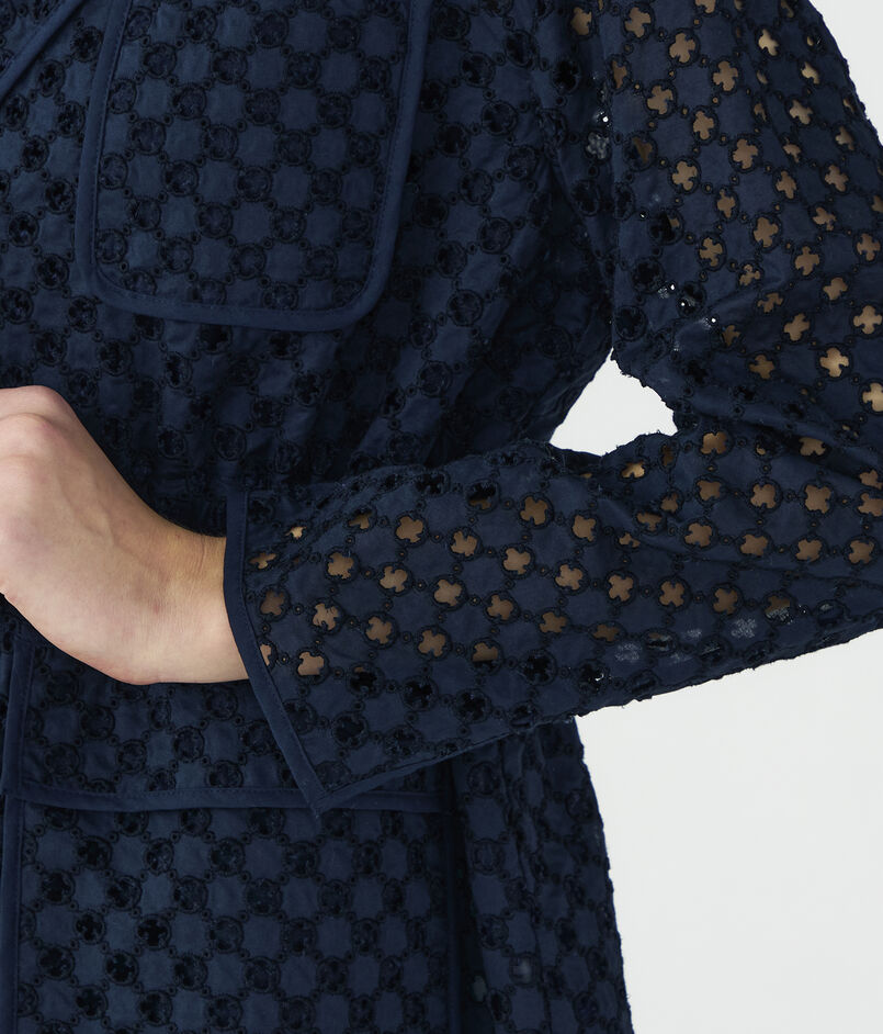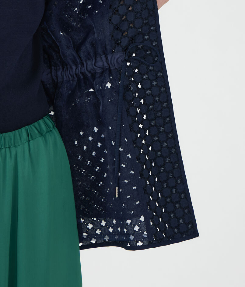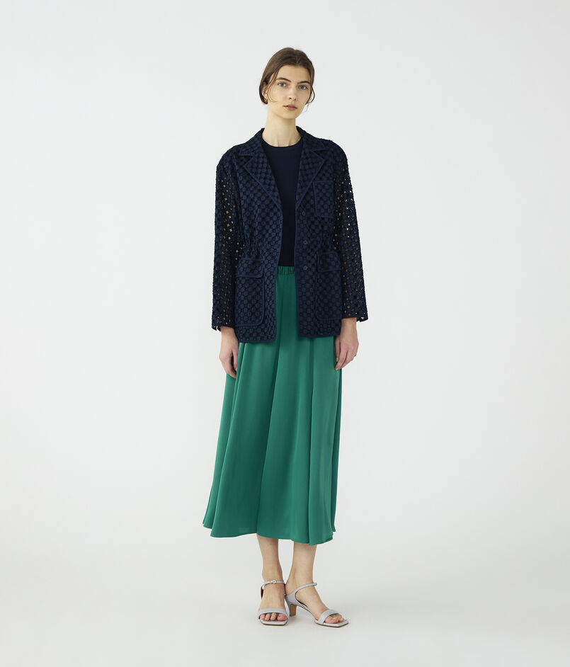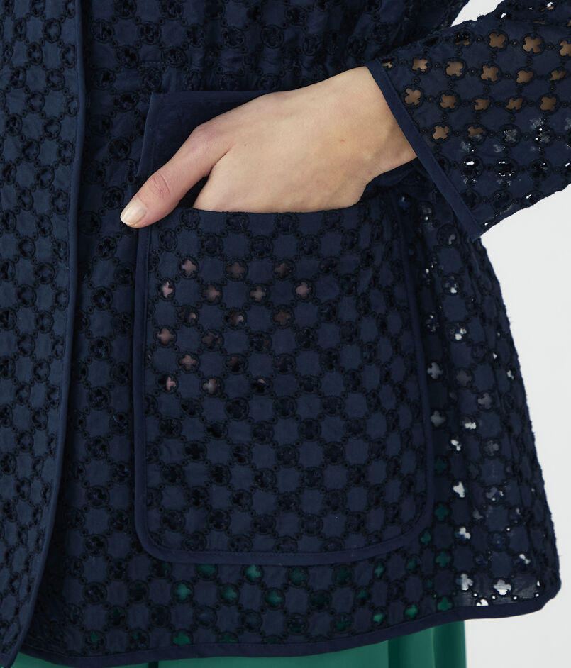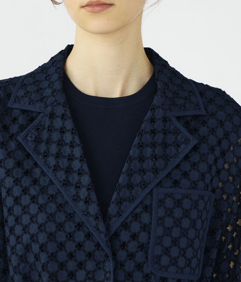 アイレット刺繍の生地で仕立てられたジャケットは新鮮な印象の一着。