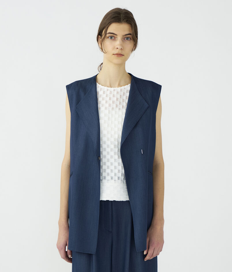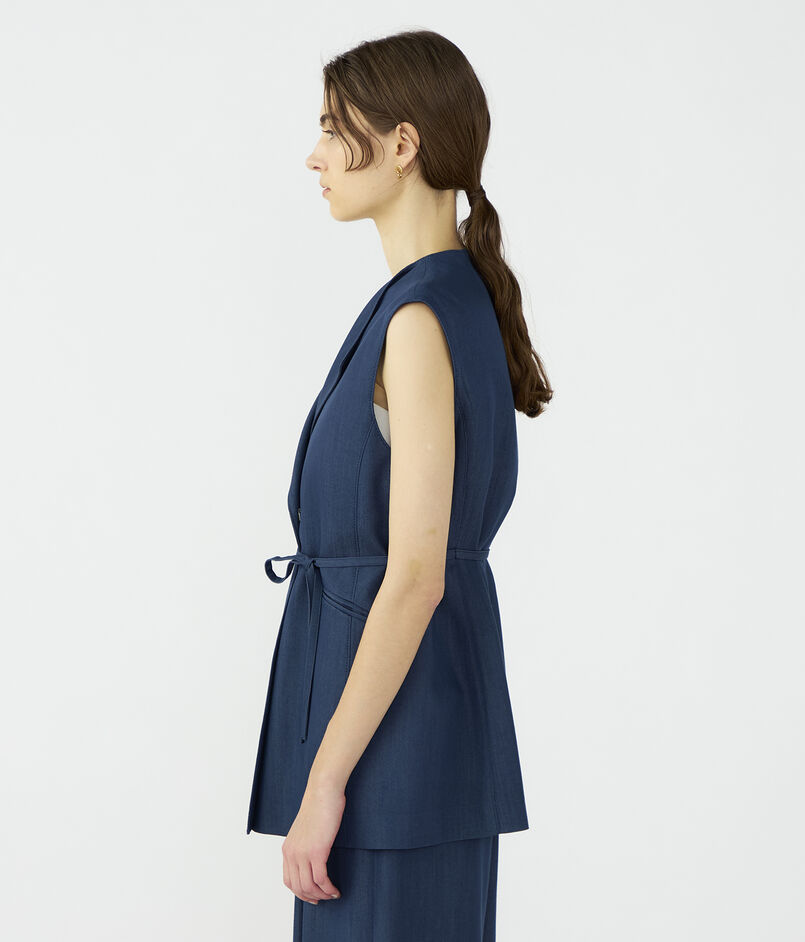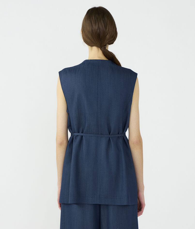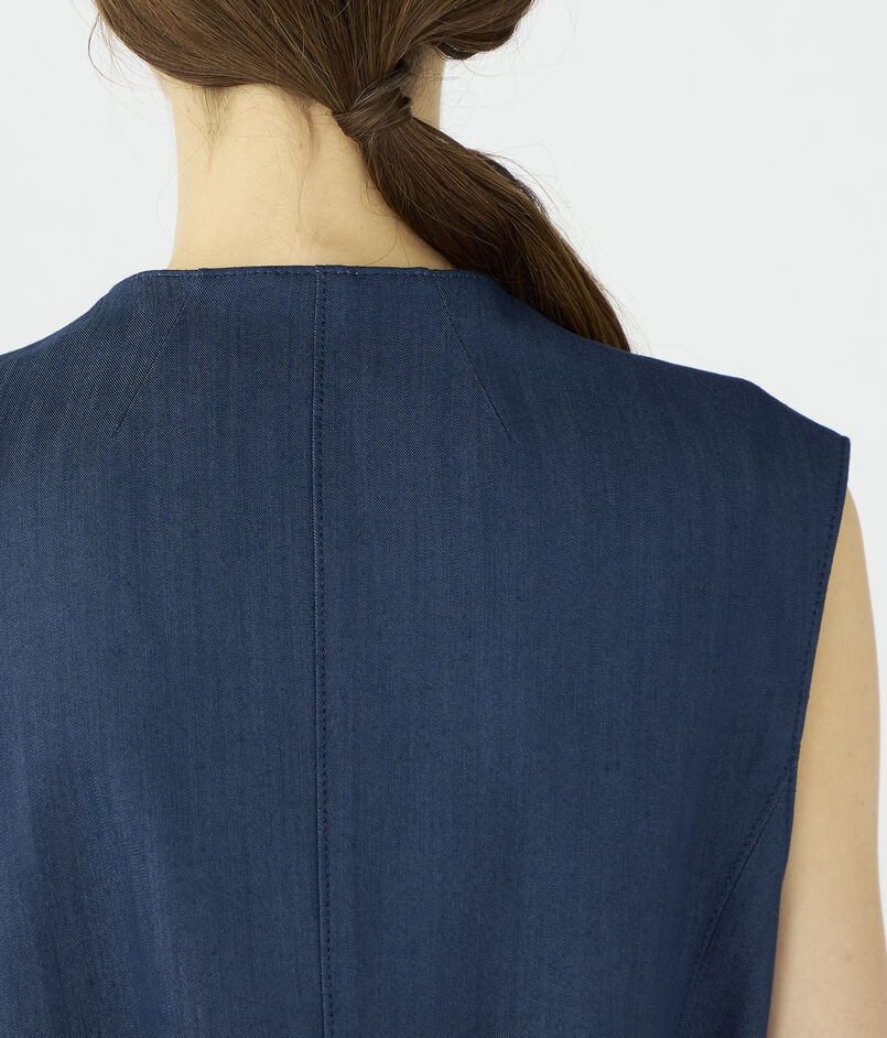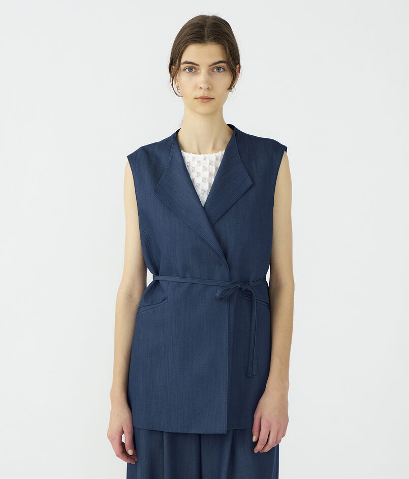 キュプラの落ち感を活かした、上品なツヤ感のあるデニムライクな素材を使用したジレ。
