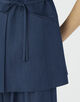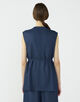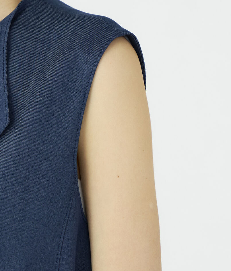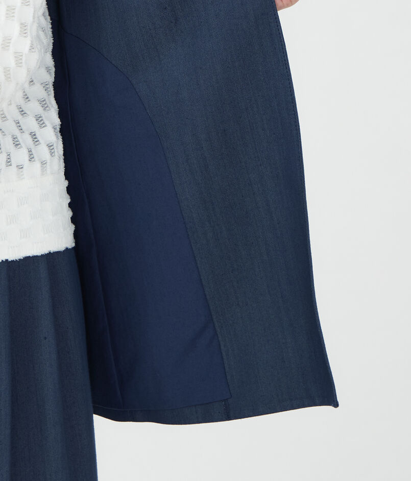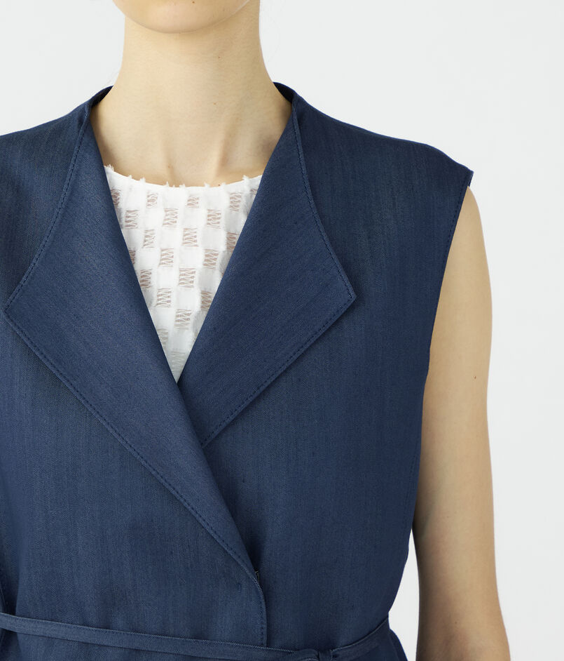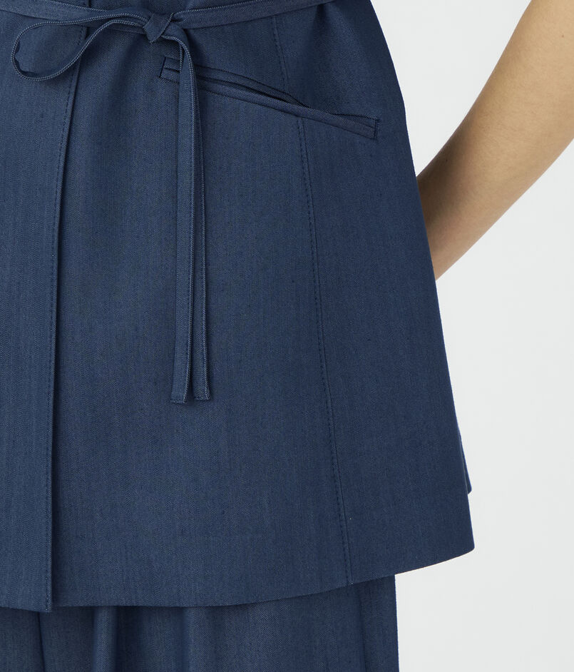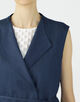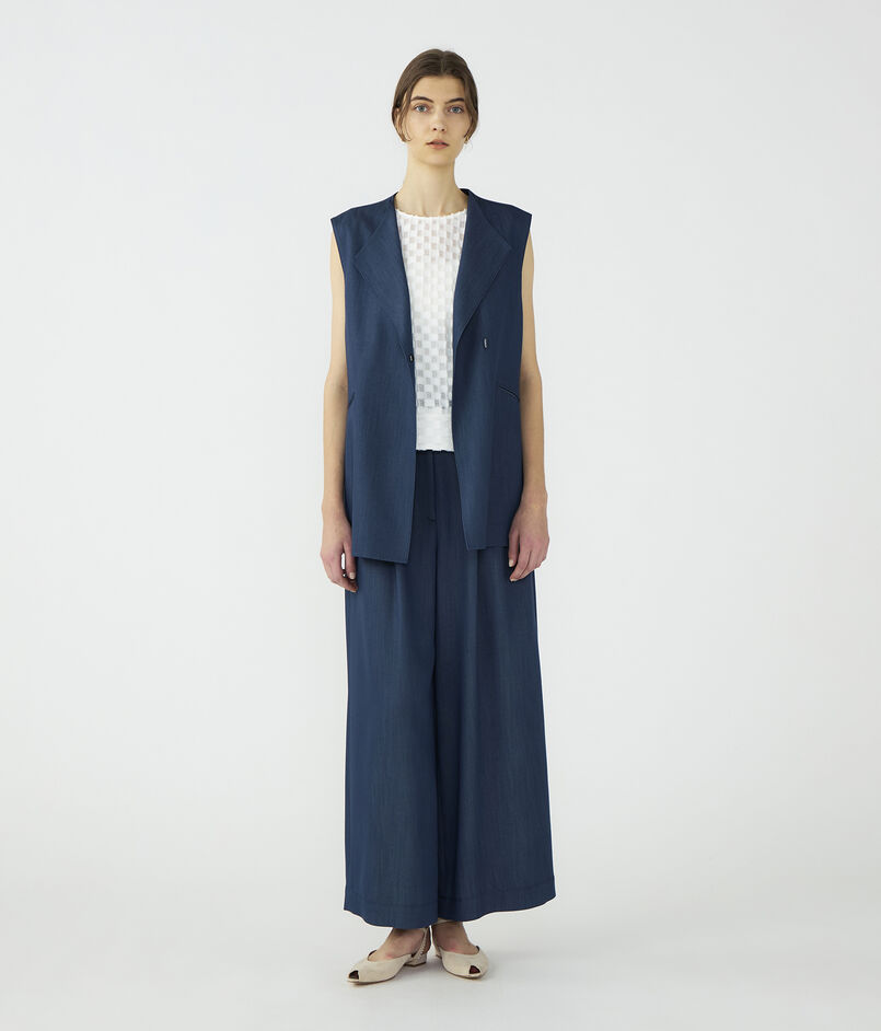 キュプラの落ち感を活かした、上品なツヤ感のあるデニムライクな素材を使用したジレ。
