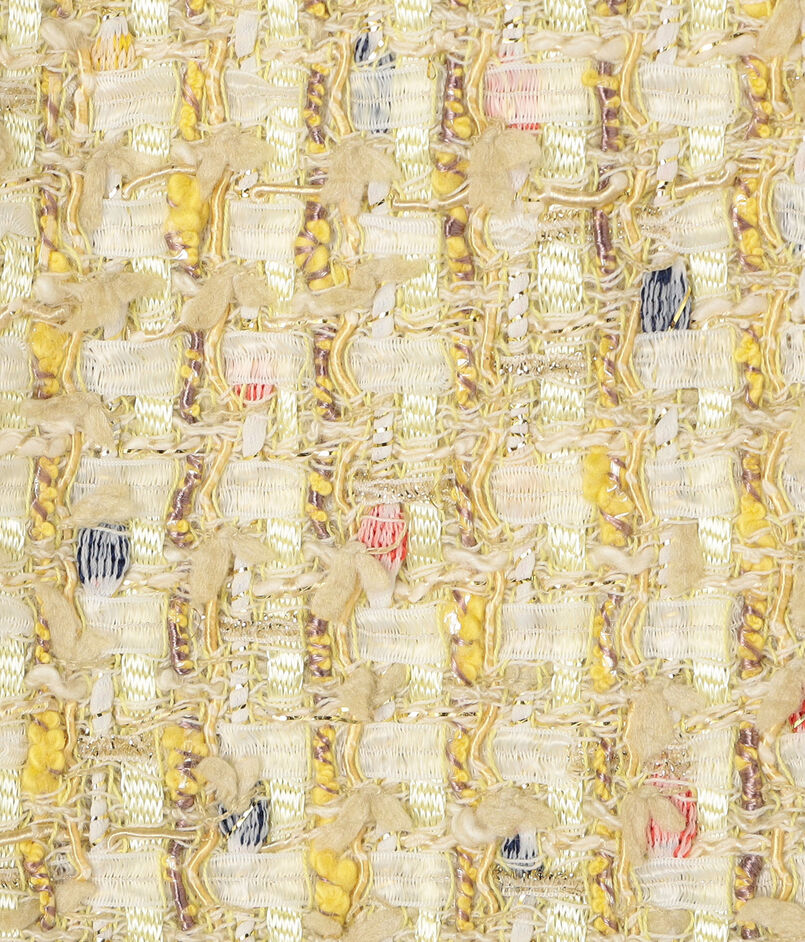 さまざまなファンシーヤーンをざっくりと織り上げ、可愛らしくも上品な表情に仕上げています。