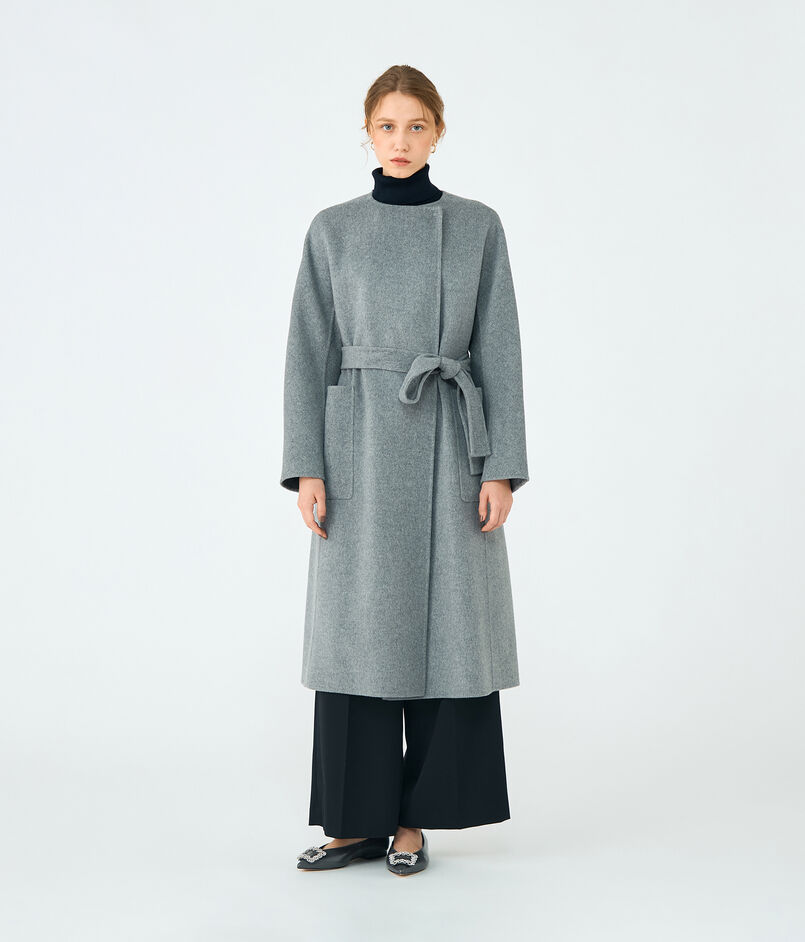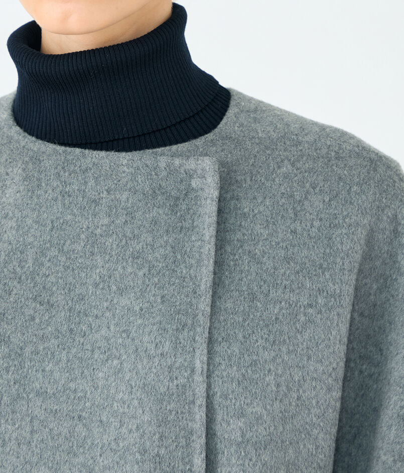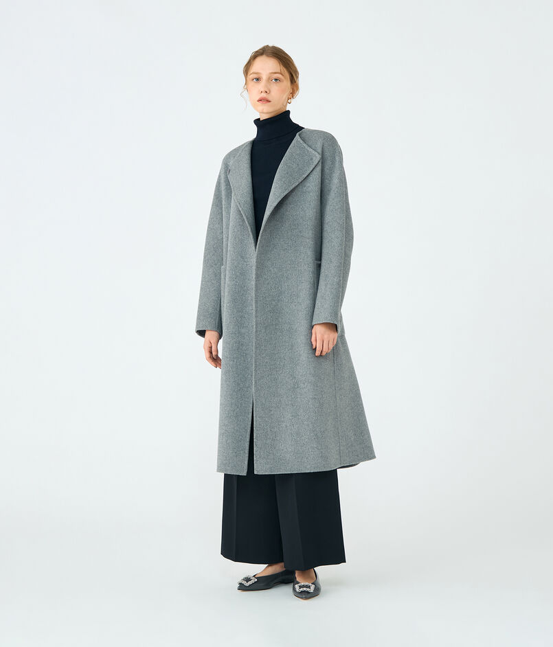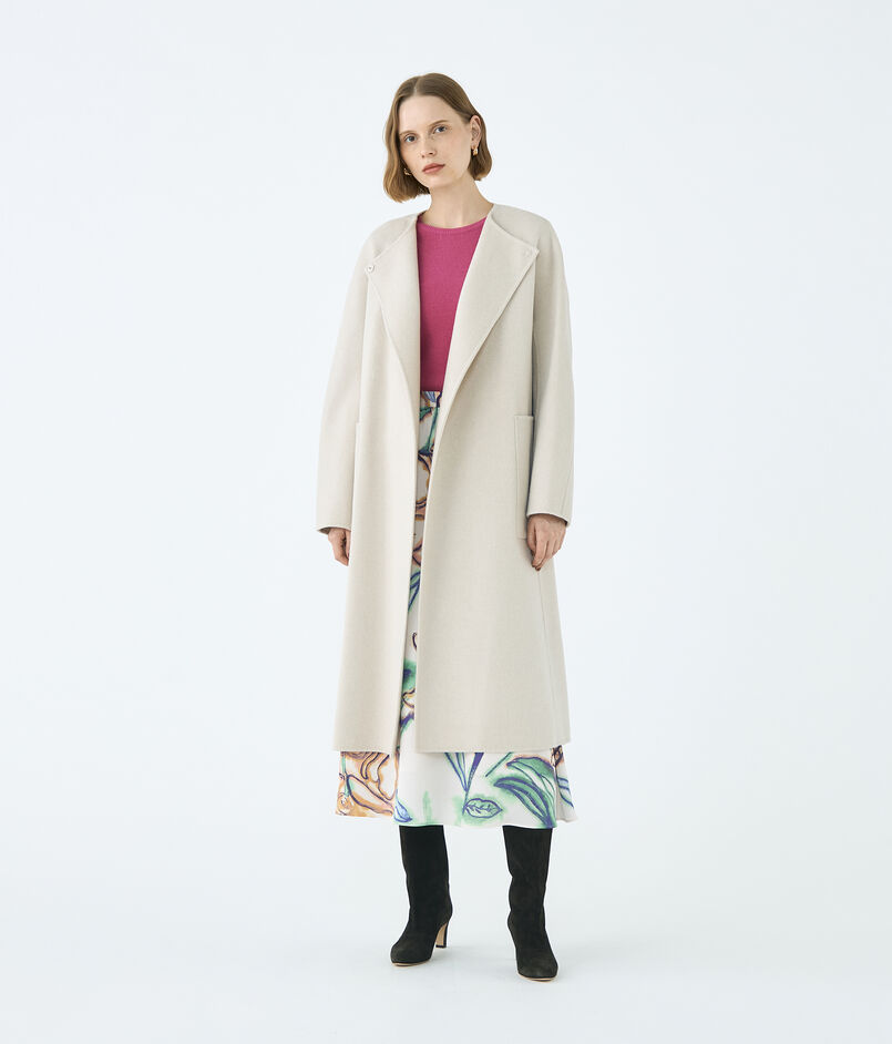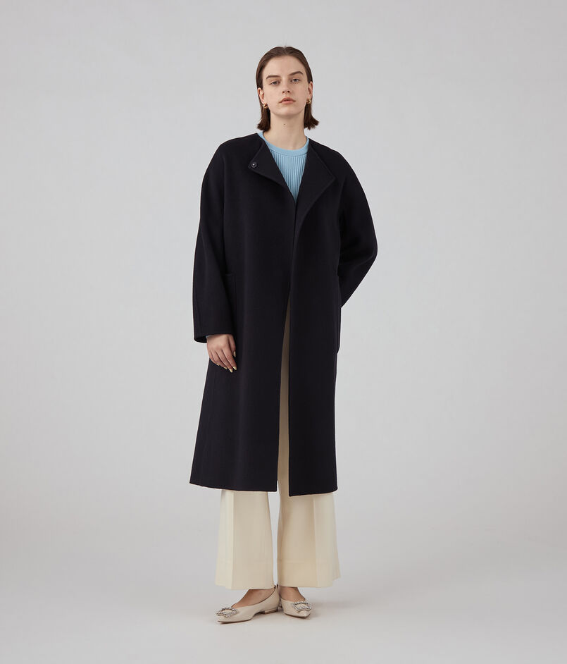ノーカラーコートは袖の丸みにこだわったパターンメイキングによる立体感が美しい一着。