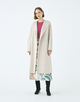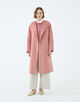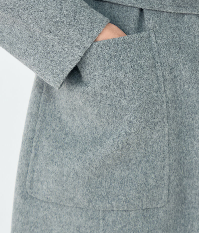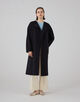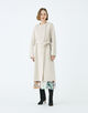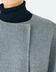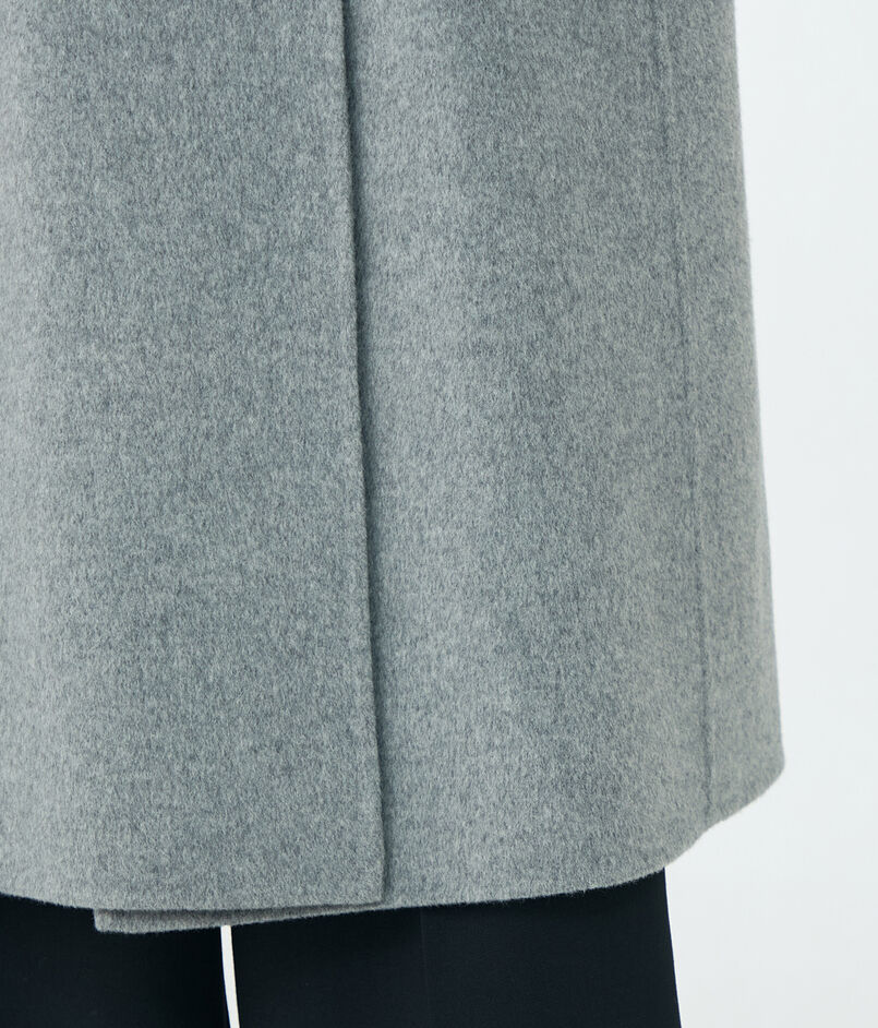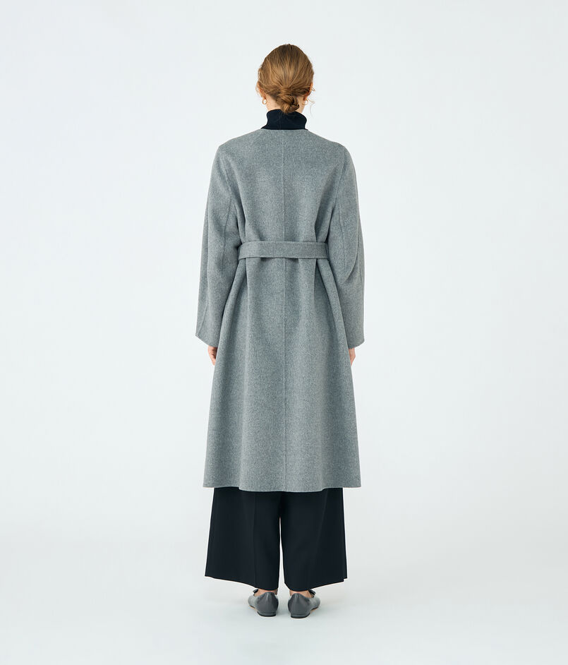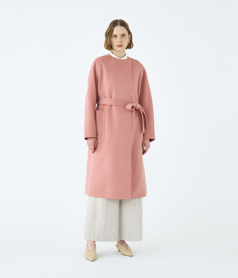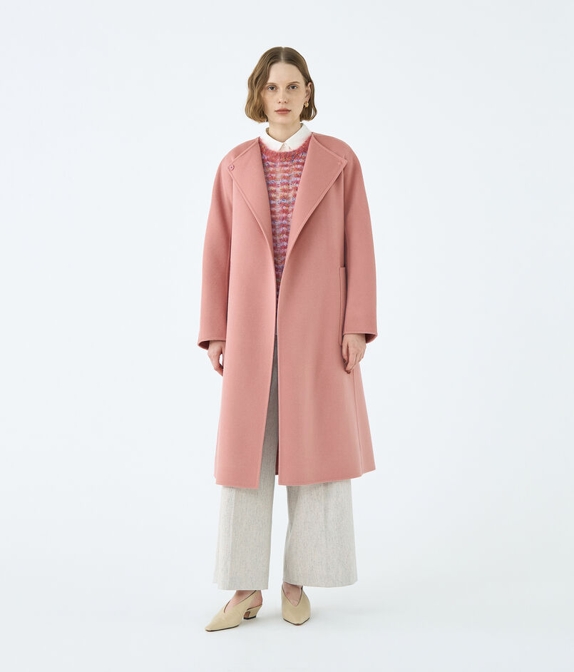 ノーカラーコートは袖の丸みにこだわったパターンメイキングによる立体感が美しい一着。