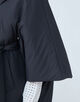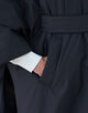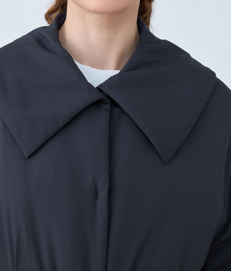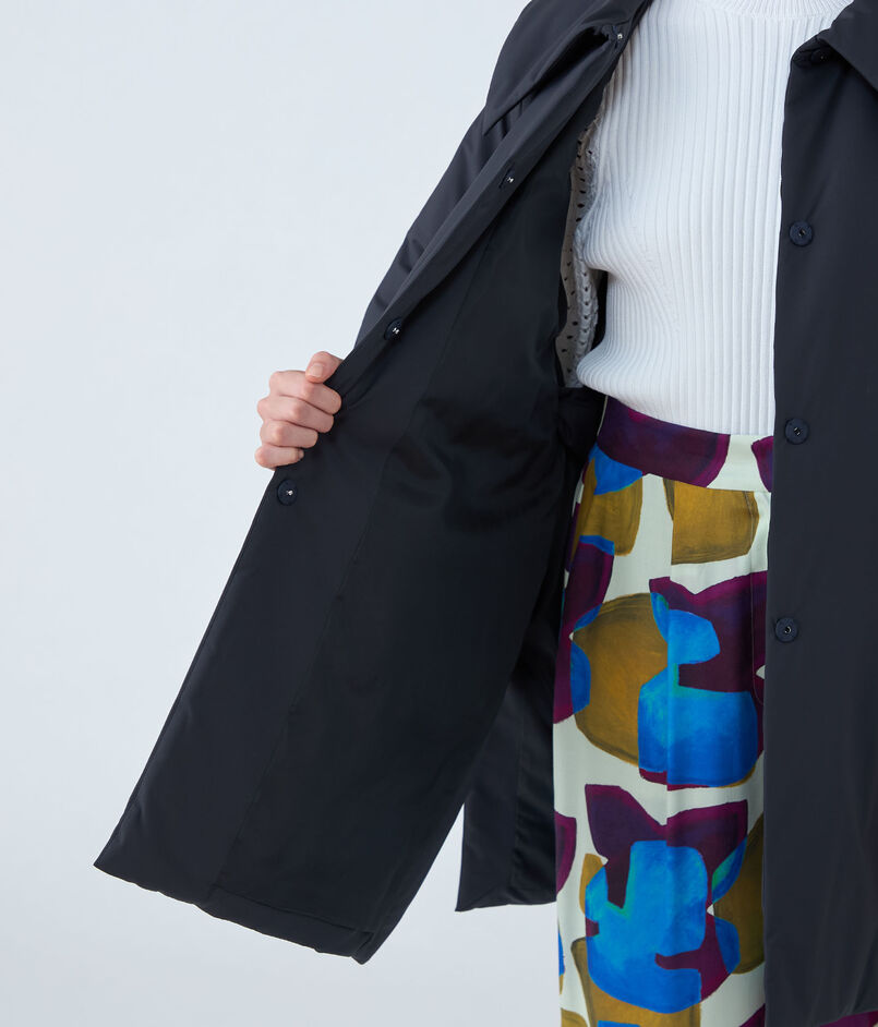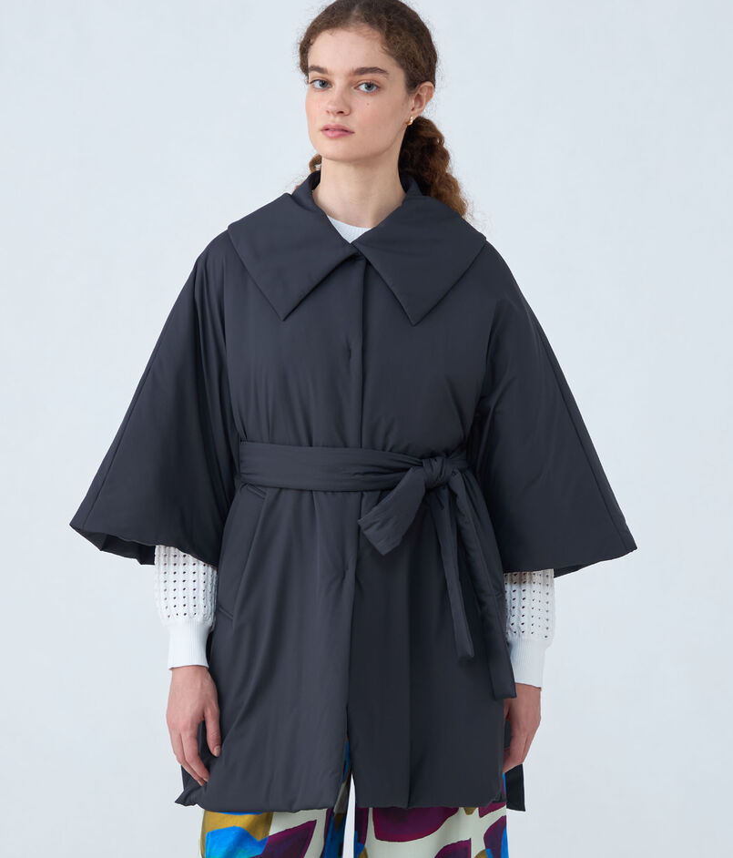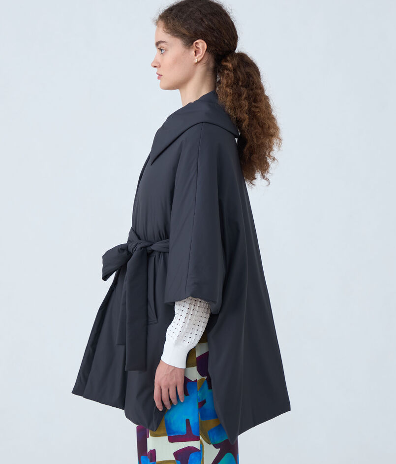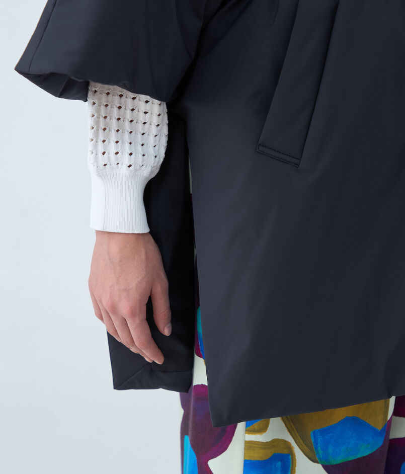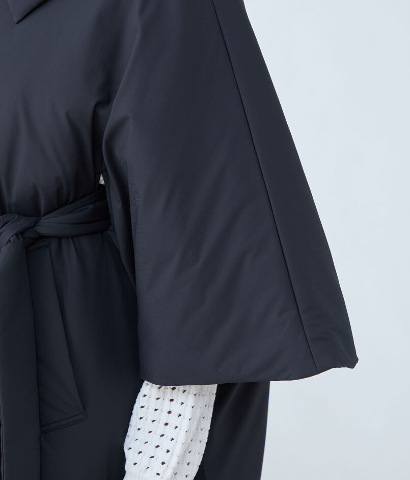 軽めのコートやジャケット、厚手のニットなどの上からでも着用可能なほど良いサイズ感で、共地のベルトでシルエットをアレンジしていただけます。